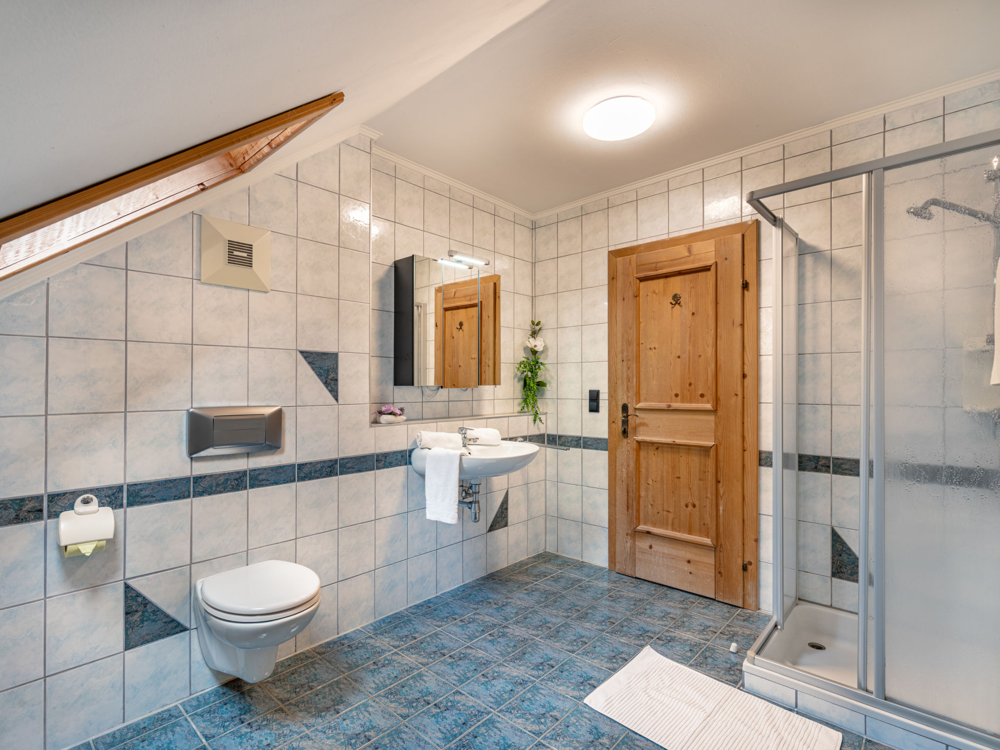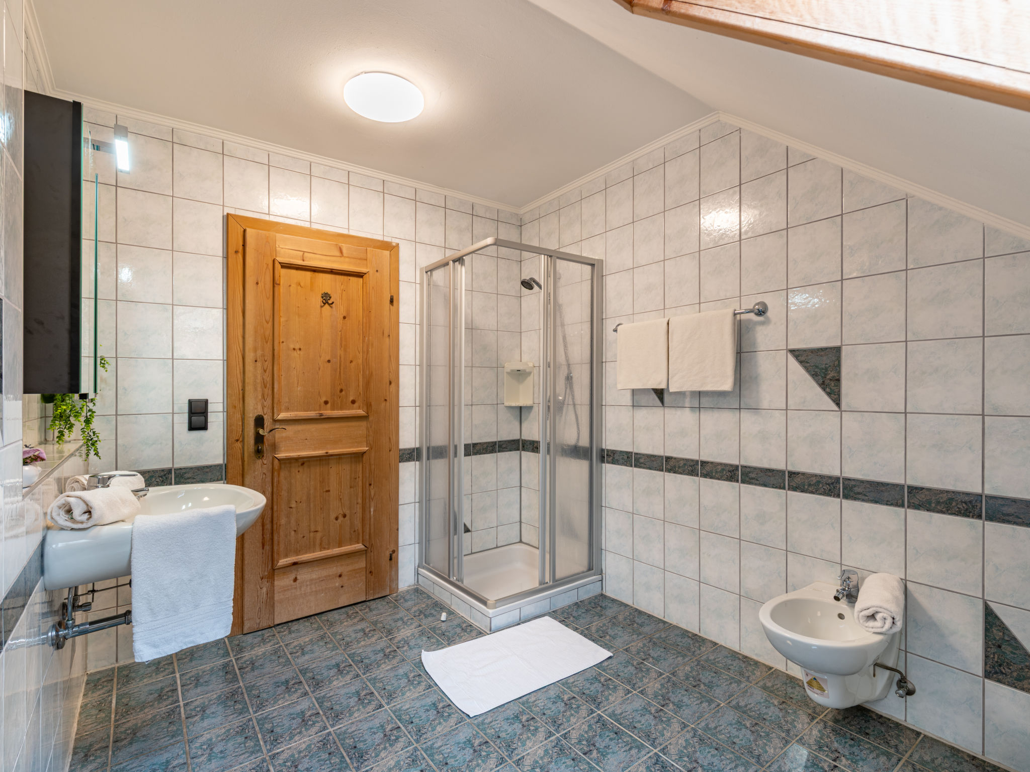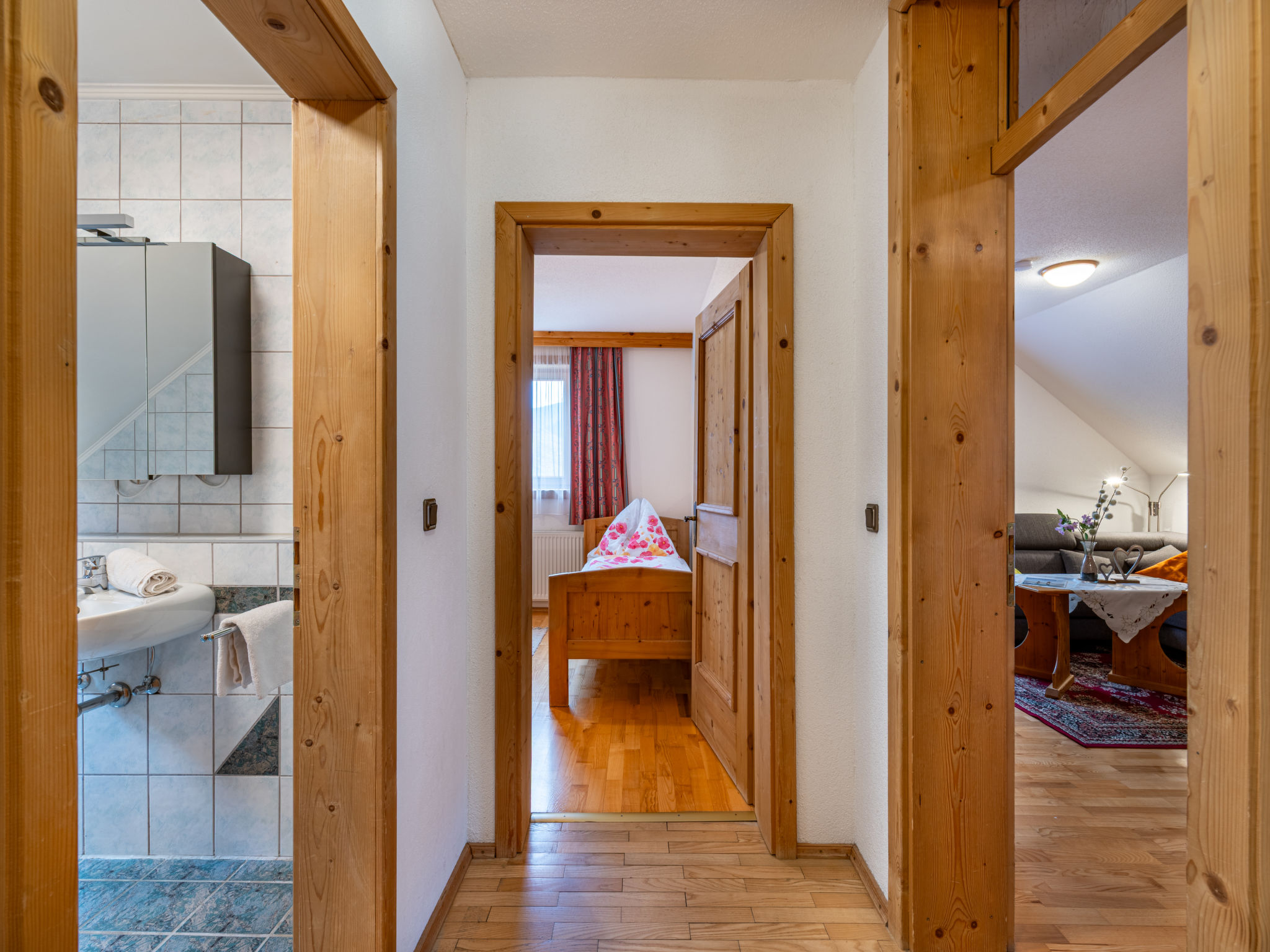 2-Zimmer-Wohnung, Dachgeschoss (leichte Dachschräge), ca. 45 m². Wohn-/Schlafraum mit Doppelbettcouch, Essplatz, Küchenzeile (4 Platten, Backofen, Geschirrspüler, Kühlschrank, Kaffeemaschine, Wasserkocher, Toaster). Schlafzimmer mit Doppelbett und Einzelbett (ggf. als Zusatzbett, siehe Nebenkosten). Dusche/WC. Bei Belegung mit weniger Personen als der maximalen Personenzahl stehen nicht alle Wohneinheiten zur Verfügung.