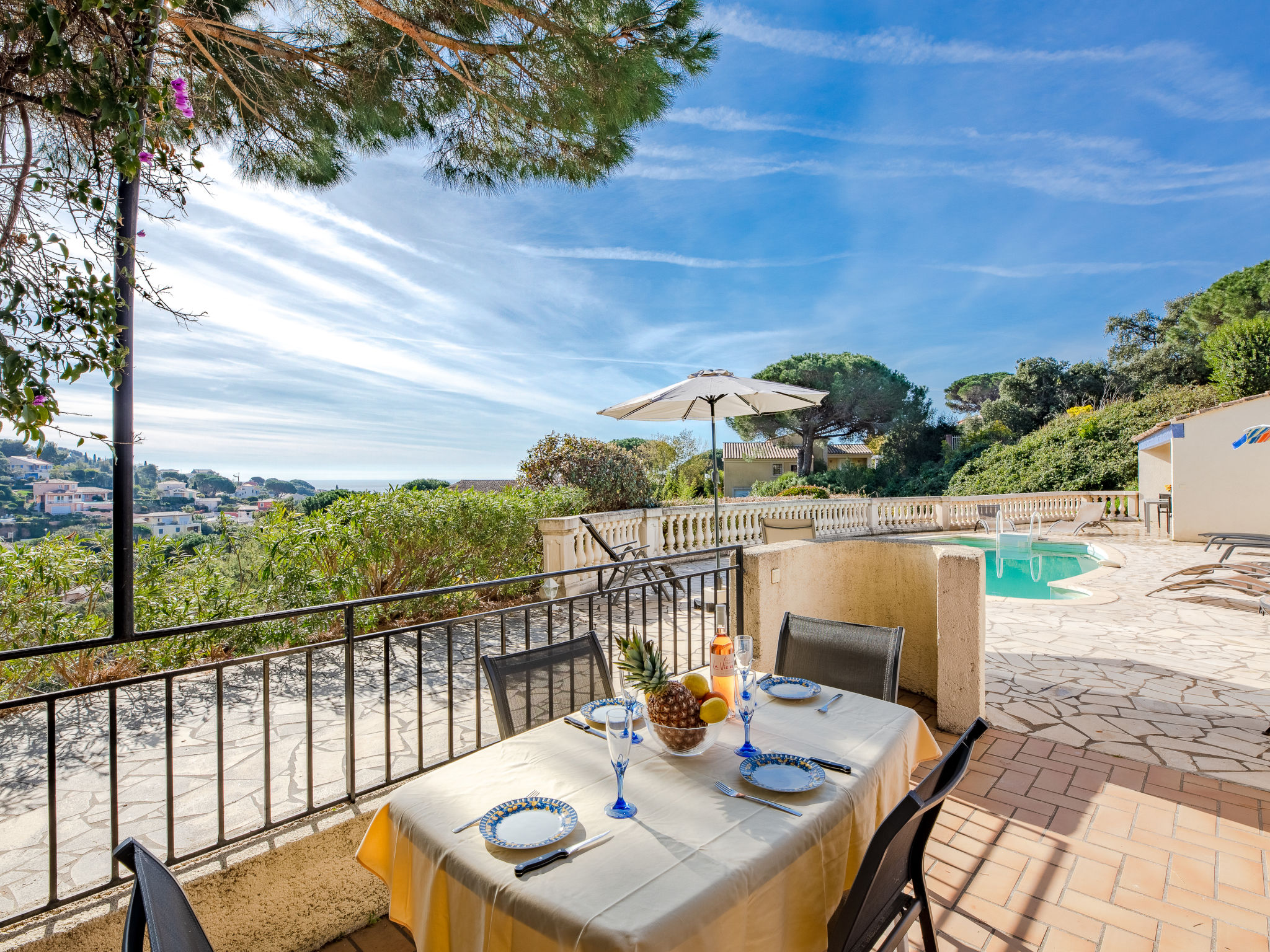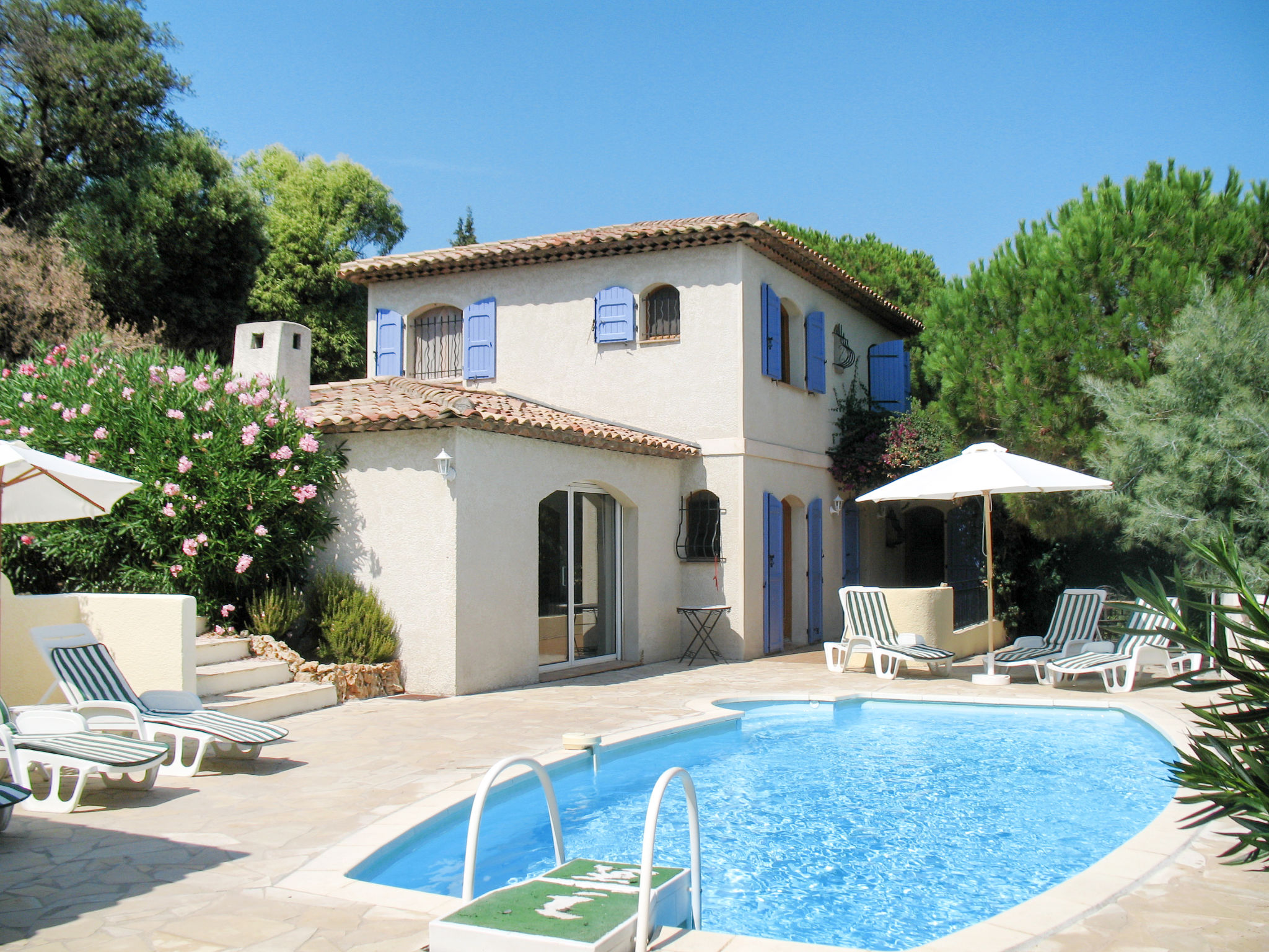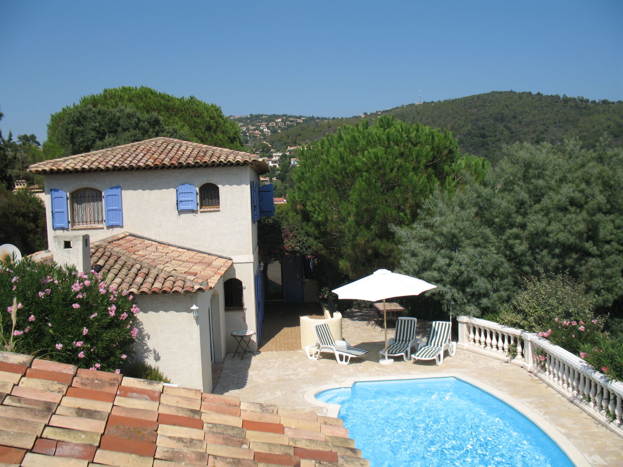 Das ansprechende provenzalische Ferienhaus steht in einem Wohnviertel am Ende einer Stichstraße, mit schönem Blick über locker bebaute Hügel bis zum Meer. Sandstrand, Hafen, Restaurants 1,3 km. Supermarkt 1 km. Ortsmitte Les Issambres 2 km. Das ca. 1400 m² große, sonnige, in 2 Terrassen angelegte, teilweise umzäunte Hanggrundstück mit Toreinfahrt ist auf der Nordseite gekiest, an der Südseite gefliest. Auf der gefliesten Südterrasse auch der ovale Pool (ca. 8 x 3,5 m, 28.03.20-07.11.20) mit Außendusche und Mobiliar. Poolhaus mit Elektrogrill (Plancha), Spüle und Essplatz. Unterhalb der Poolebene Steilhang mit mediterranem Baumbestand (hier nicht eingezäunt). Parkplatz auf dem Grundstück. Am Haus Terrasse mit Pergola, Mobiliar. Gute, freundliche Einrichtung. Fliesenböden. Sat-TV (deutsche Programme). Internetzugang (WLAN, inklusive). Waschmaschine. Abstellraum mit Bügeleisen/-brett. Elektroheizung.