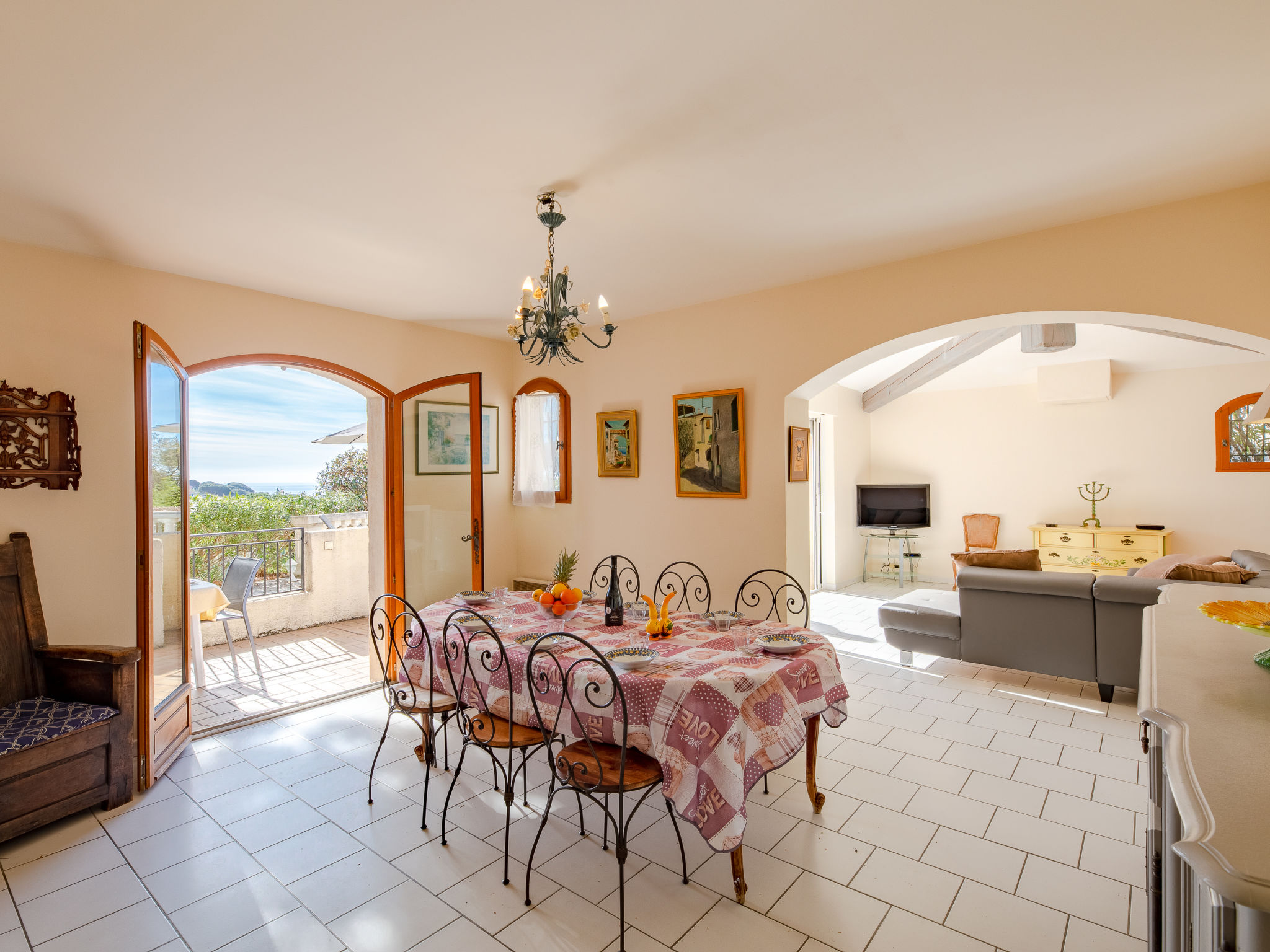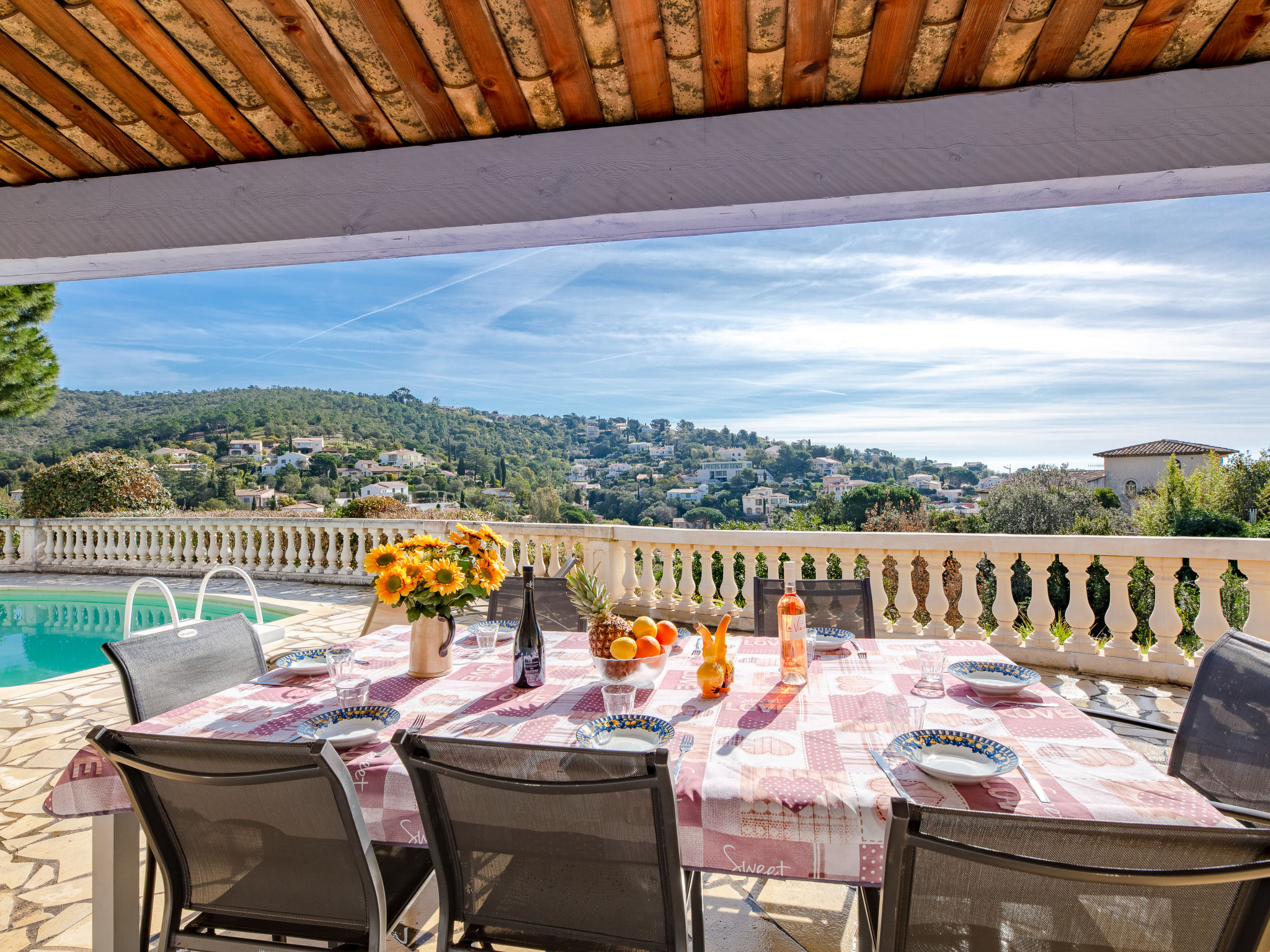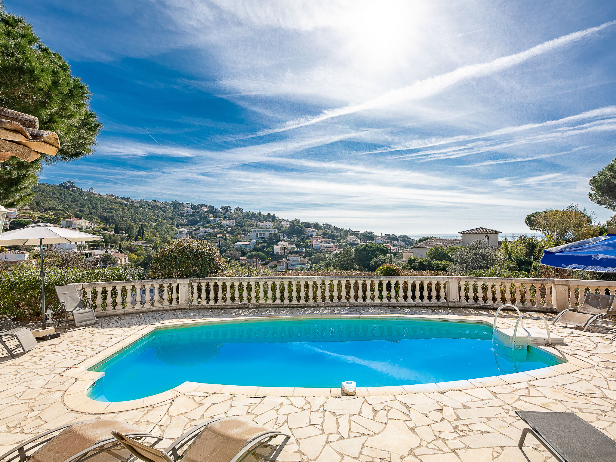 Das ansprechende provenzalische Ferienhaus steht in einem Wohnviertel am Ende einer Stichstraße, mit schönem Blick über locker bebaute Hügel bis zum Meer. Sandstrand, Hafen, Restaurants 1,3 km. Supermarkt 1 km. Ortsmitte Les Issambres 2 km. Das ca. 1400 m² große, sonnige, in 2 Terrassen angelegte, teilweise umzäunte Hanggrundstück mit Toreinfahrt ist auf der Nordseite gekiest, an der Südseite gefliest. Auf der gefliesten Südterrasse auch der ovale Pool (ca. 8 x 3,5 m, 28.03.20-07.11.20) mit Außendusche und Mobiliar. Poolhaus mit Elektrogrill (Plancha), Spüle und Essplatz. Unterhalb der Poolebene Steilhang mit mediterranem Baumbestand (hier nicht eingezäunt). Parkplatz auf dem Grundstück. Am Haus Terrasse mit Pergola, Mobiliar. Gute, freundliche Einrichtung. Fliesenböden. Sat-TV (deutsche Programme). Internetzugang (WLAN, inklusive). Waschmaschine. Abstellraum mit Bügeleisen/-brett. Elektroheizung.