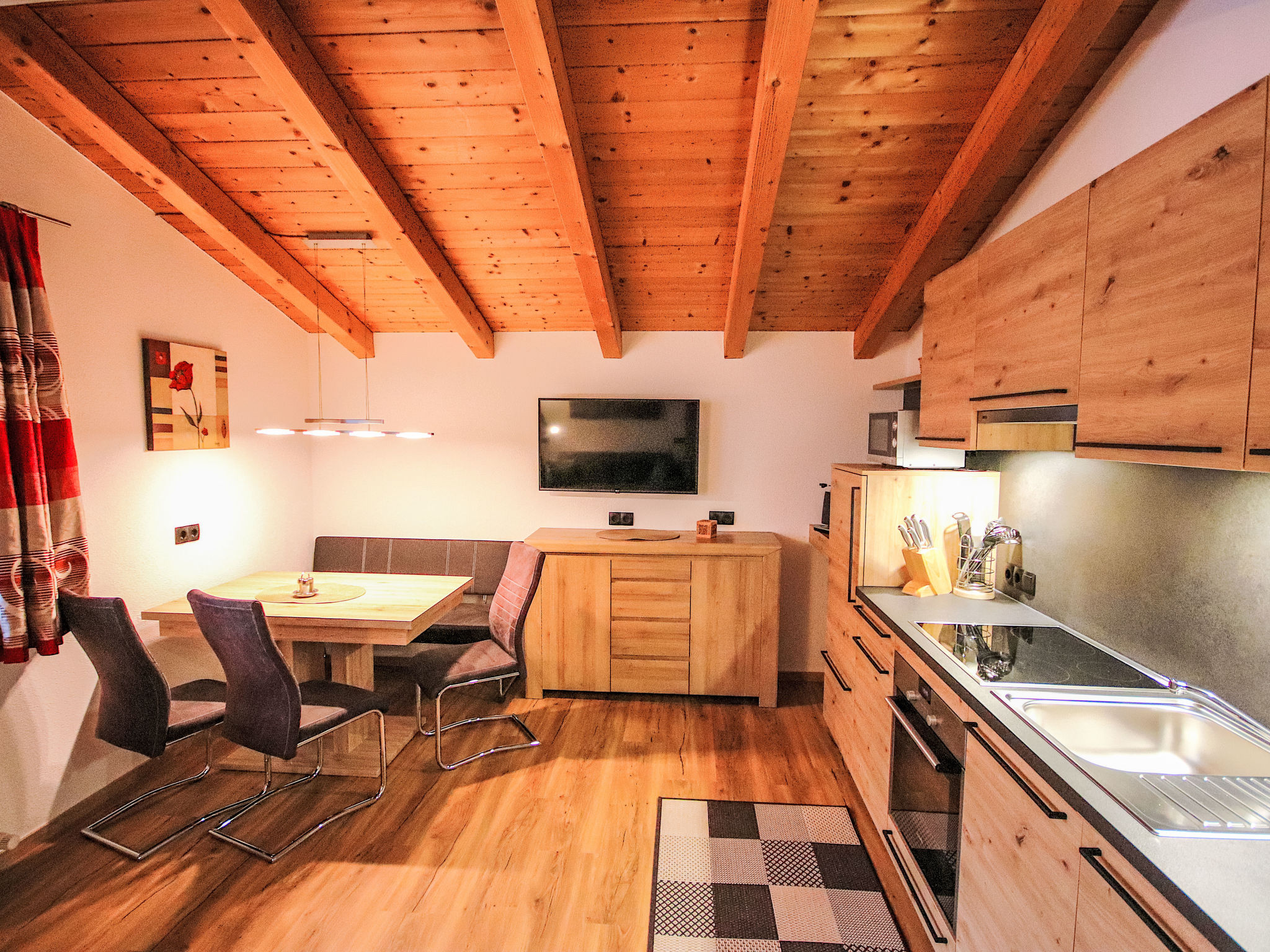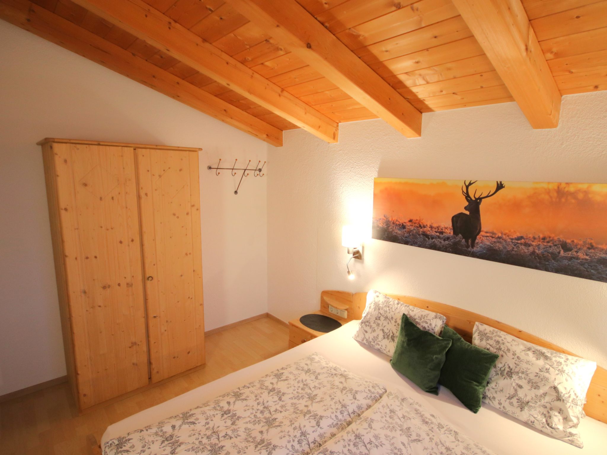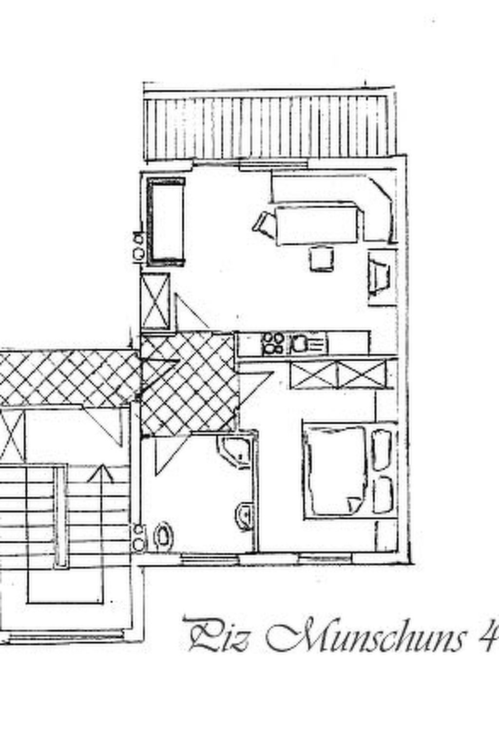 2-Zimmer-Wohnung 'Piz Munschuns', 2. Etage (teils leichte Dachschräge), ca. 43 m². Diele. Wohn-/Schlafraum mit Doppelbettcouch, Essplatz (Eckbank), Küchenzeile (4 Induktionsfelder, Backofen, Mikrowelle, Geschirrspüler, Kühlschrank, Kaffeevollautomat, Wasserkocher, Toaster) und Balkonausgang. Doppelzimmer. Dusche/WC. Bei Belegung mit weniger Personen als der maximalen Personenzahl stehen nicht alle Wohneinheiten zur Verfügung.