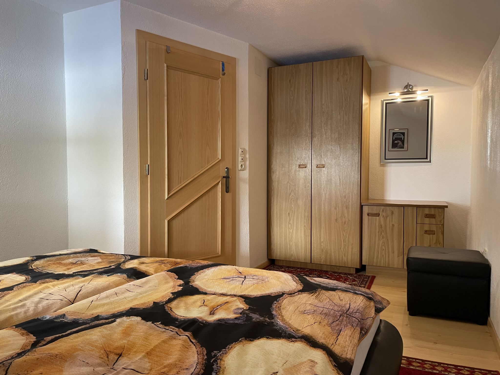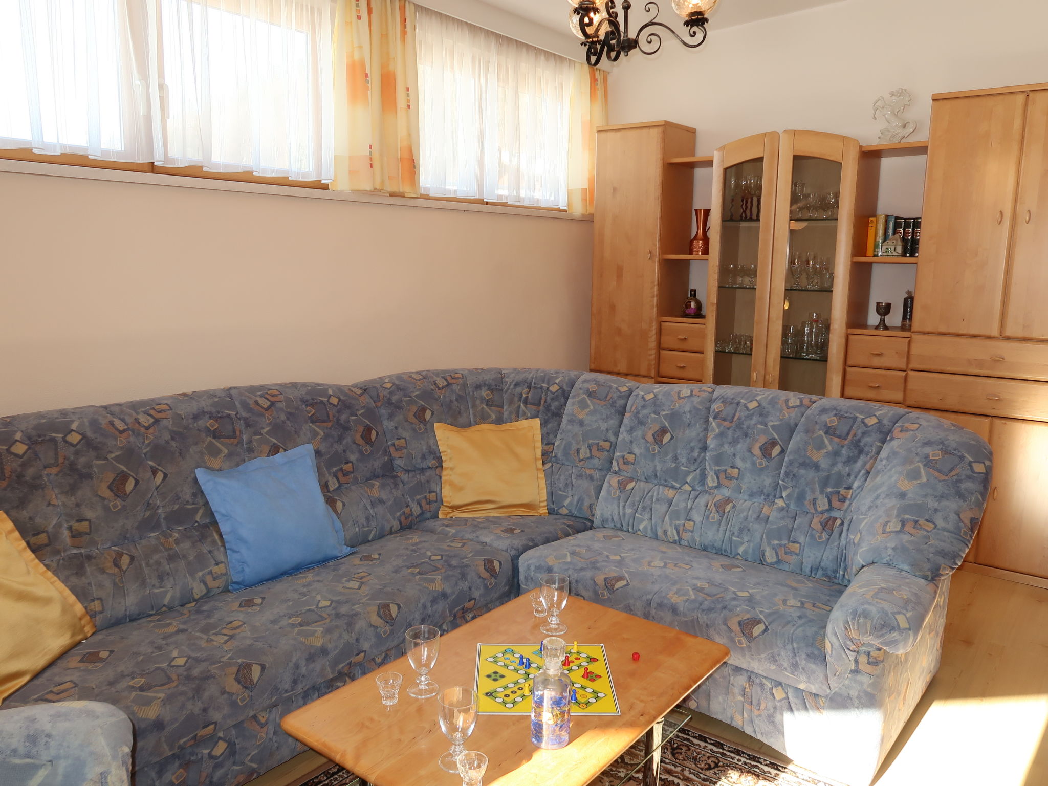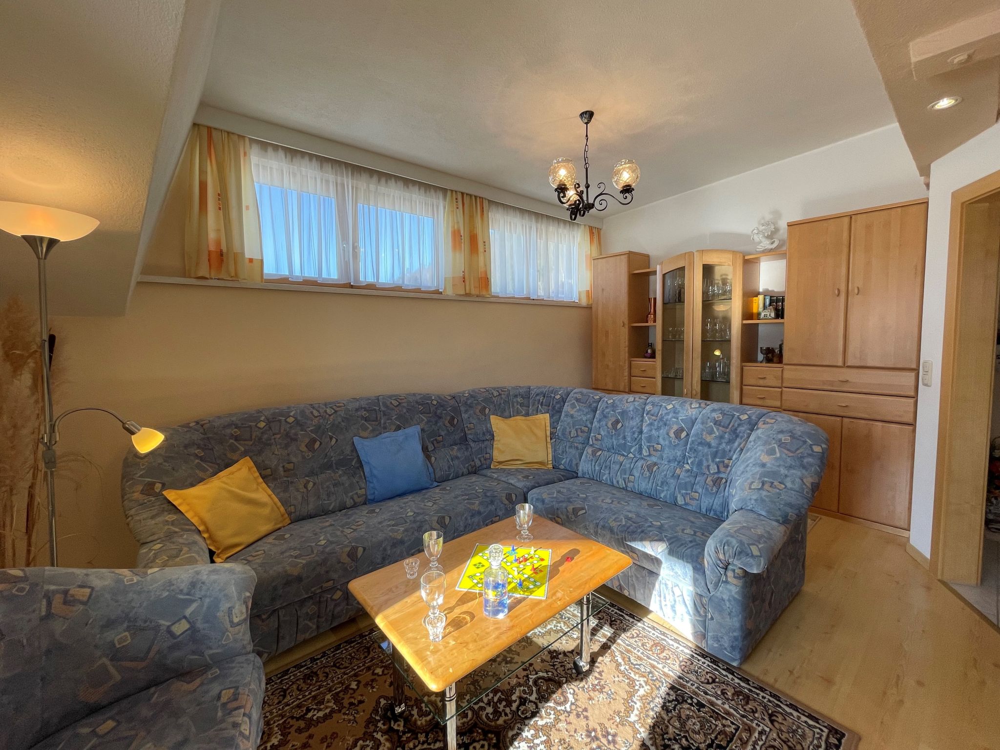 Großzügige, gut ausgestattete 4-Zimmer-Wohnung, 2. Etage, ca. 90 m². Über Aussentreppe und internes Trepenhaus erreichbar. Separater Eingang. Flur. Wohnraum mit Sitzgruppe, SAT-TV (Flachbildschirm) und Balkonausgang. Große Wohnküche (4 Ceranfelder, Backofen, Mikrowelle, Geschirrspüler, Kühlschrank, Kaffeemaschine, Wasserkocher, Toaster) mit Essplatz (Eckbank) und Balkonausgang. Kleiner Abstellraum mit Gefriertruhe. Doppelzimmer. Doppelzimmer mit Terrassenausgang. Zweibettzimmer. Bad. Sep. WC.
