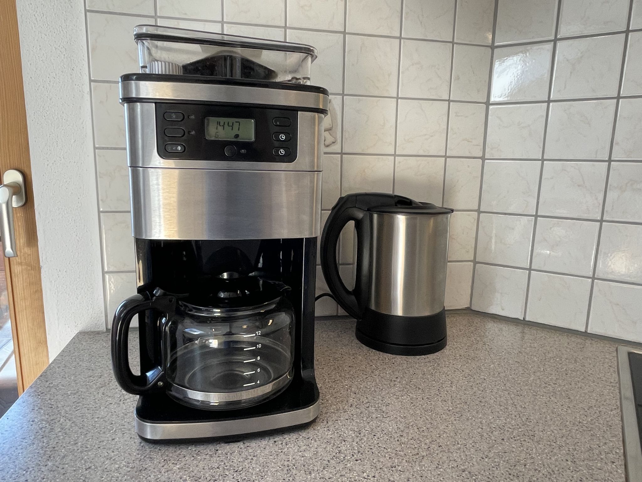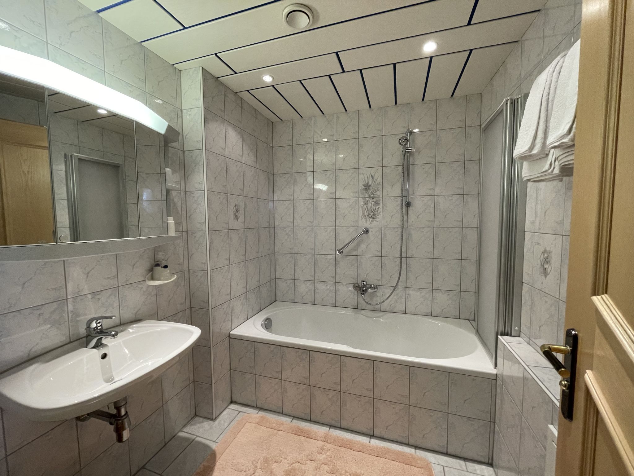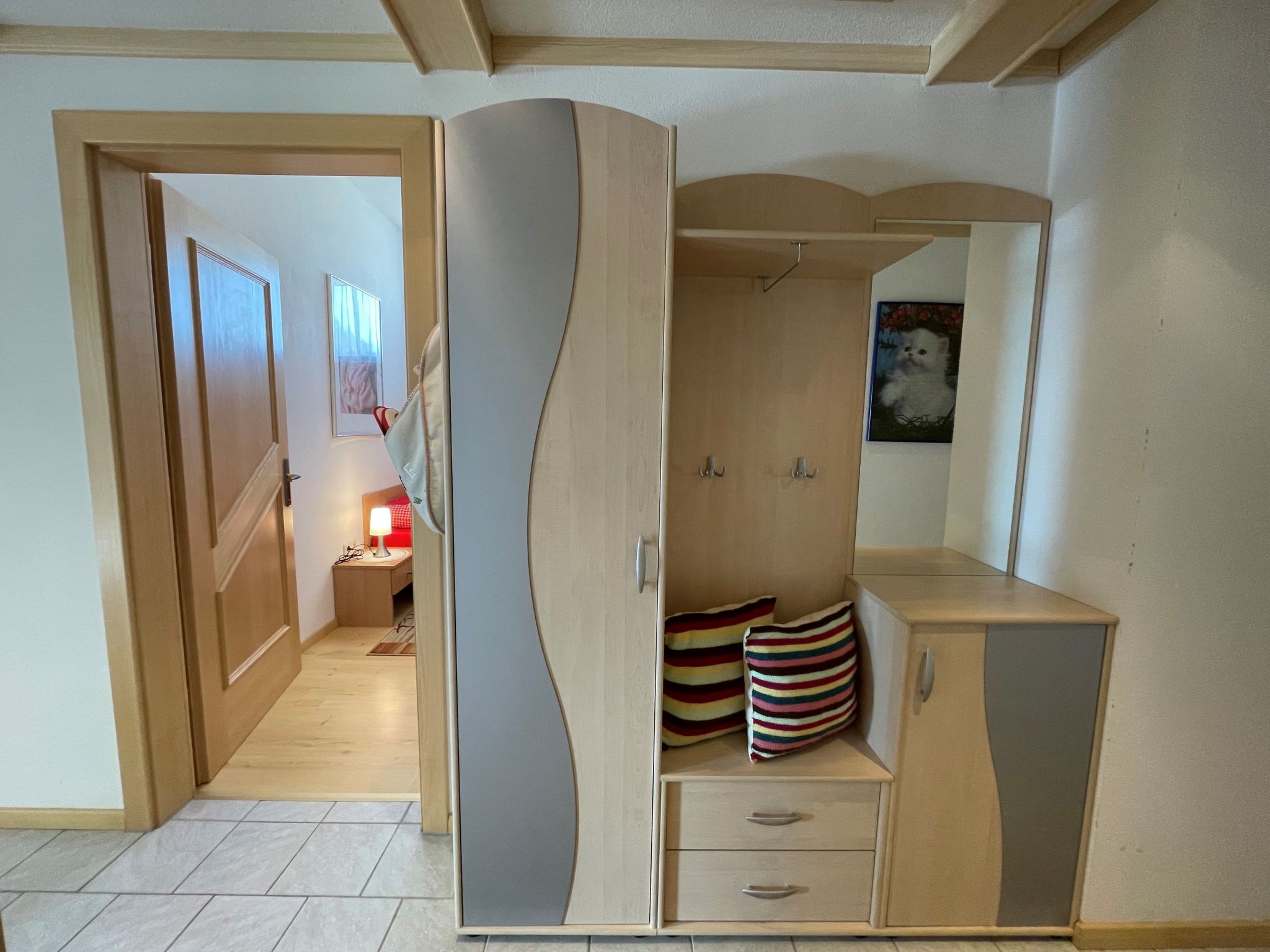 Großzügige, gut ausgestattete 4-Zimmer-Wohnung, 2. Etage, ca. 90 m². Über Aussentreppe und internes Trepenhaus erreichbar. Separater Eingang. Flur. Wohnraum mit Sitzgruppe, SAT-TV (Flachbildschirm) und Balkonausgang. Große Wohnküche (4 Ceranfelder, Backofen, Mikrowelle, Geschirrspüler, Kühlschrank, Kaffeemaschine, Wasserkocher, Toaster) mit Essplatz (Eckbank) und Balkonausgang. Kleiner Abstellraum mit Gefriertruhe. Doppelzimmer. Doppelzimmer mit Terrassenausgang. Zweibettzimmer. Bad. Sep. WC.