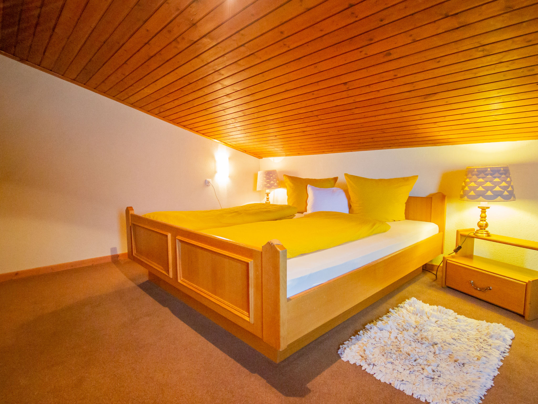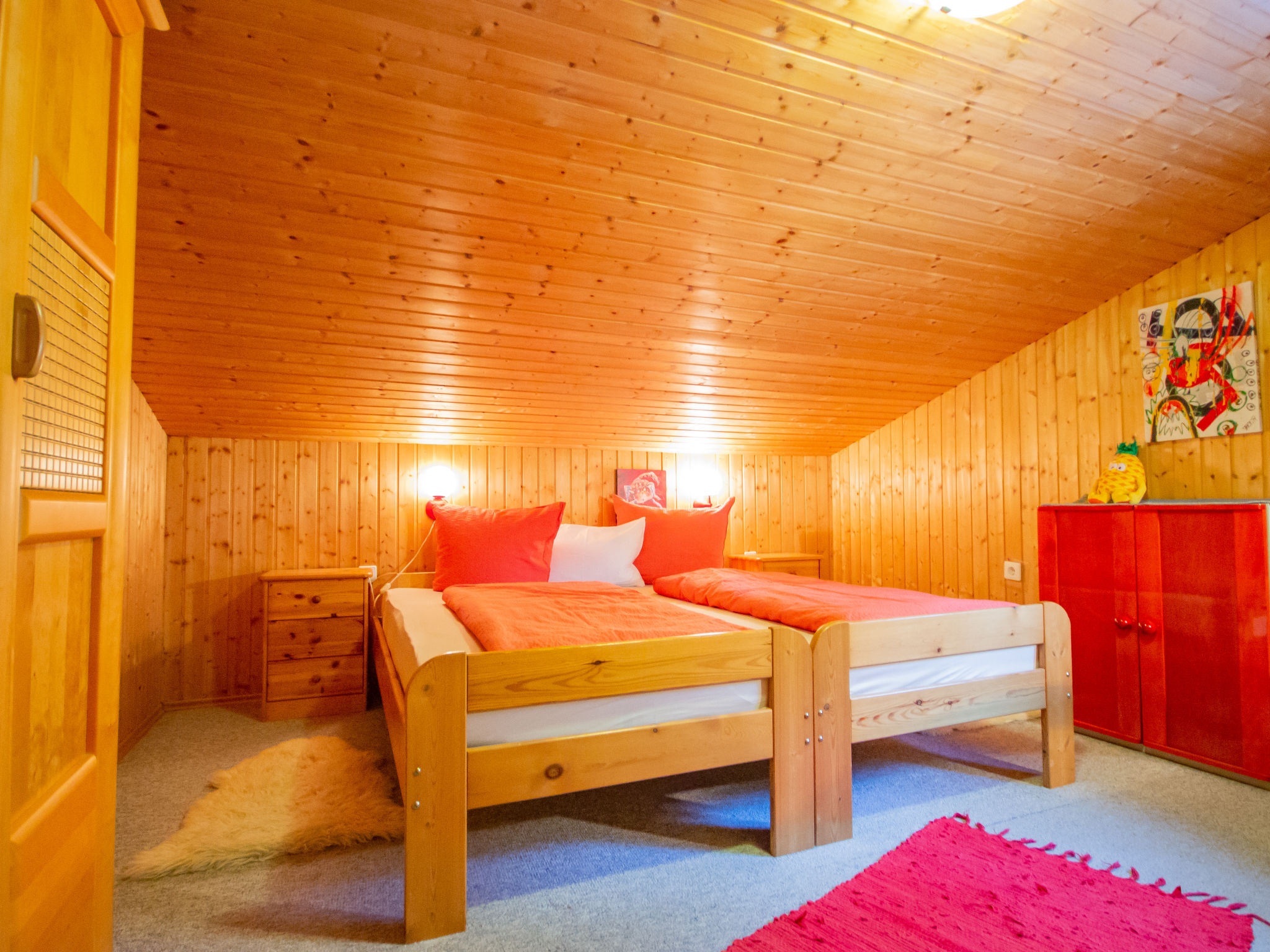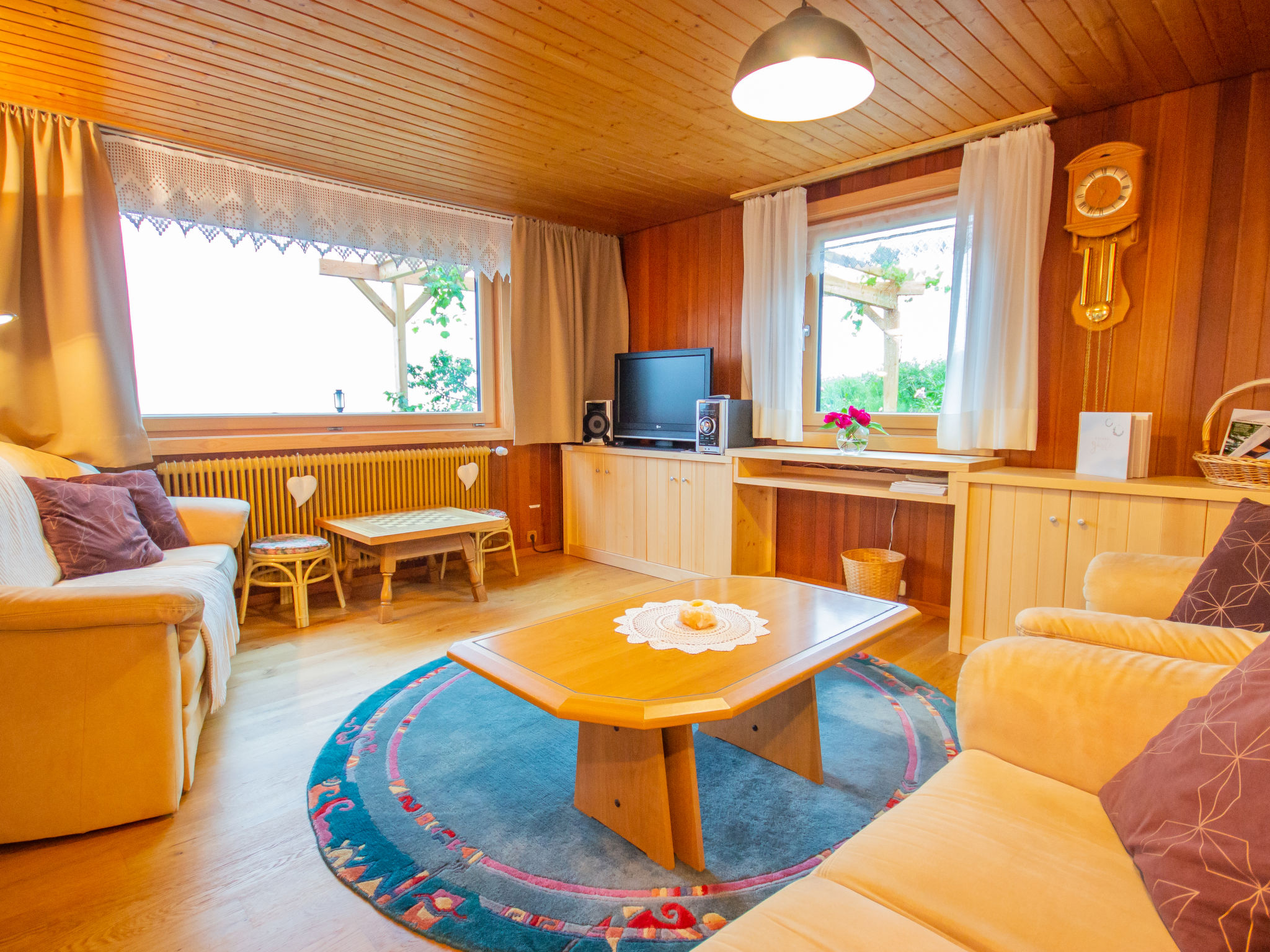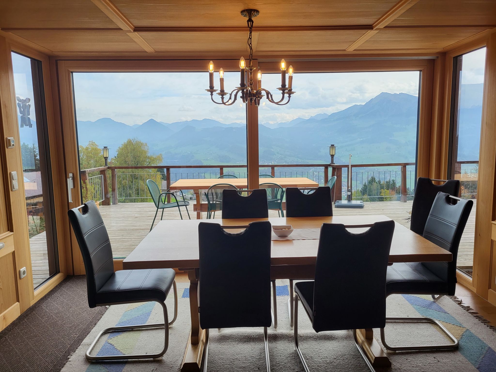 6-Zimmer-Chalet 190 m2. Stilvoll und gemütlich eingerichtet: Eingang. Grosses Wohnzimmer mit Panoramafenster mit Kabel-TV, Stereoanlage, DVD und Kachelofen. Ausgang zum Garten, zur Terrasse. Offener Salon mit Wintergarten. Küche (Backofen, Geschirrspüler, 4 Glaskeramikherd Platten, Mikrowelle, Tiefkühler) mit Esstisch. Dusche/WC, Doppelwaschbecken. Fussbodenheizung. Obergeschoss: 3 Doppelzimmer. 1 abgeschrägtes Zimmer mit 2 Betten. Galerie mit Sat-TV. Bad/WC. Grosse Terrasse 44 m2. Terrassenmöbel, Gartengrill, Liegestühle. Herrliche Panoramasicht auf die Berge und die Landschaft. Zur Verfügung: Waschmaschine, Babybett, Haartrockner. Internet (Wireless LAN, gratis). Bitte beachten: Nichtraucher-Haus.