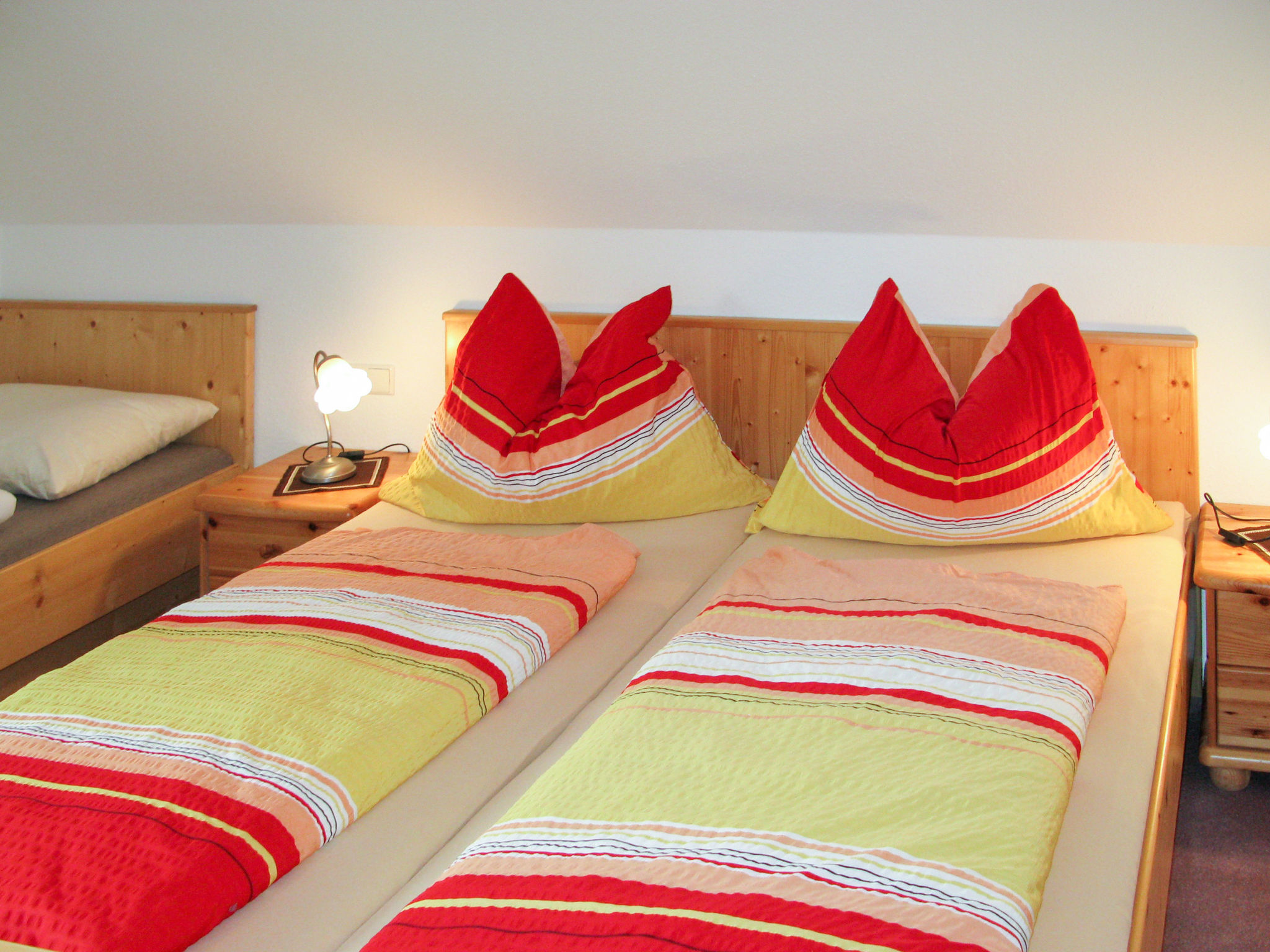 4-Zimmer-Haus, 2 Etagen, ca. 110 m². Erdgeschoss: Flur mit Garderobe. Wohn-/Schlafraum mit Sitzgruppe/Doppelbettcouch. Küche (4 Platten, Backofen, Mikrowelle, Geschirrspüler, Kühlschrank, Kaffeemaschine, Wasserkocher, Toaster) mit Essplatz (Eckbank). Kleines Doppelzimmer mit Dusche/WC. Sep.WC. 1. Etage (leichte Dachschräge): Doppelzimmer. Schlafzimmer mit Doppelbett und Einzelbett. Großes Bad mit Badewanne/Dusche/Doppelwaschbecken/WC. Flexibilität bei der Bettenaufteilung: Es stehen mehr Schlafmöglichkeiten zur Verfügung als die maximal zugelassene Personenzahl, diese darf dennoch nicht überschritten werden.