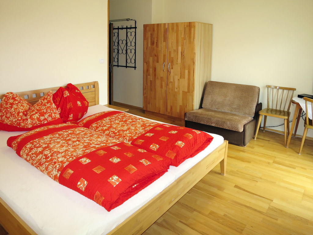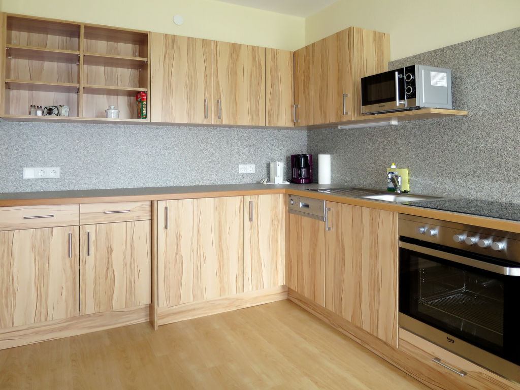 3-Zimmer-Wohnung, 2. Etage, ca. 56 m². Wohnküche (4 Ceranfelder, Backofen, Mikrowelle, Geschirrspüler, Kühlschrank, Kaffeemaschine, Wasserkocher, Toaster) mit Essplatz und Balkonausgang. Doppelzimmer (durch dieses Zimmer wird die Wohnung betreten) mit Dusche/WC und Balkonausgang. Schlafzimmer mit Doppelbett und Bettcouch, Dusche/WC und Balkonausgang. Hinweis: Bei Buchung zum Preis für 2 Personen bleibt das Schlafzimmer mit Doppelbett und Bettcouch verschlossen. Bei Belegung mit weniger Personen als der maximalen Personenzahl stehen nicht alle Wohneinheiten zur Verfügung.