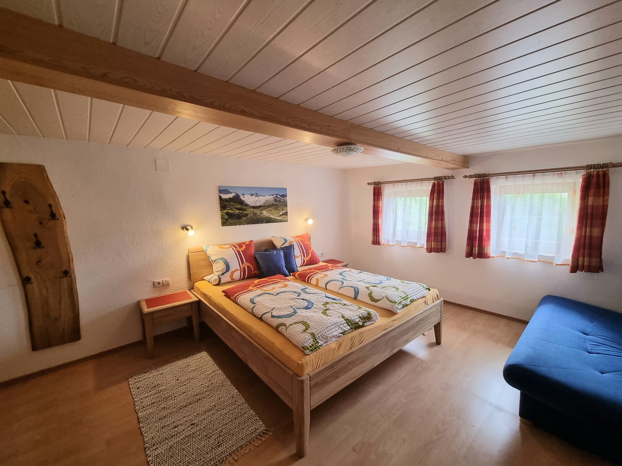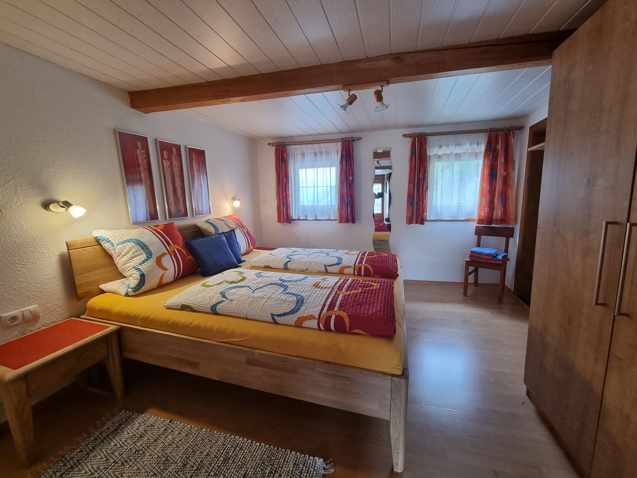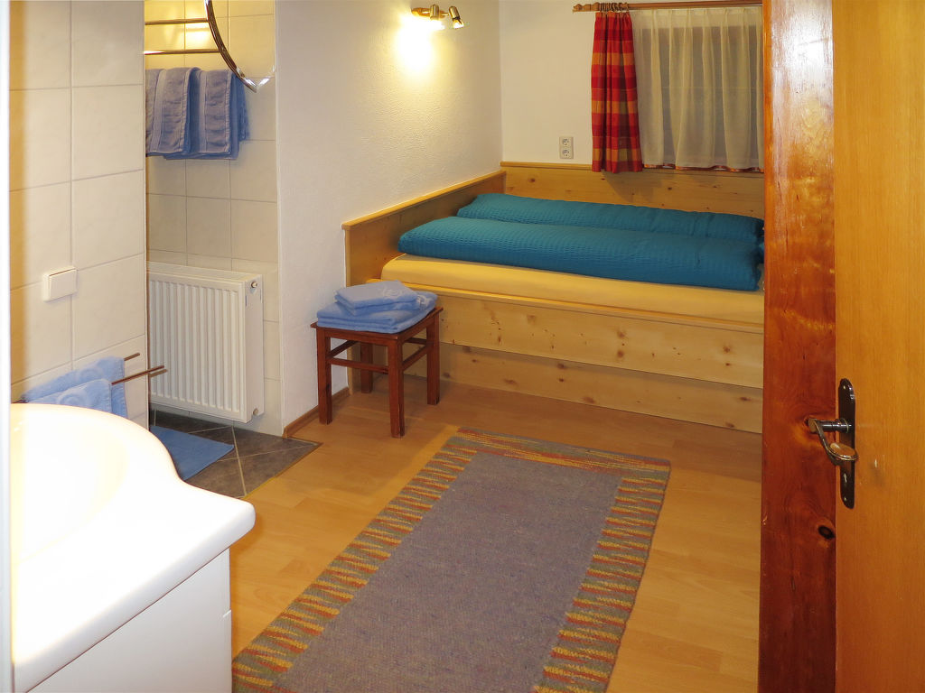 4-Zimmer-Hausteil, 2 Etagen, ca. 110 m². Erdgeschoss: Separater Zugang. Gemütliche Bauernstube mit Kachelofen (Holz inklusive), Essplatz und Bettcouch. Küche (4 Ceranfelder, Backofen, Mikrowelle, Geschirrspüler, Kühlschrank, Kaffeemaschine, Wasserkocher, Toaster) mit Essplatz. Sep.WC. 1. Etage: Flur mit Balkonausgang. Doppelzimmer mit Sat-TV und Dusche. Schlafzimmer mit Doppelbett, Bettcouch und Waschbecken, von hier Zugang zu kleinem Schlafzimmer mit franz. Bett, Dusche, Balkon. Sep.WC. Bei Belegung mit weniger Personen als der maximalen Personenzahl stehen nicht alle Wohneinheiten zur Verfügung.