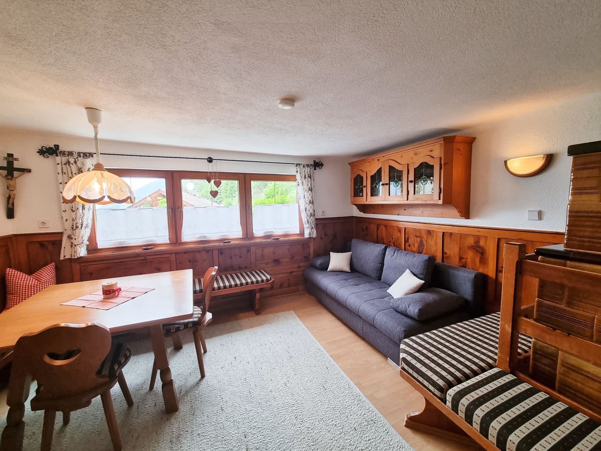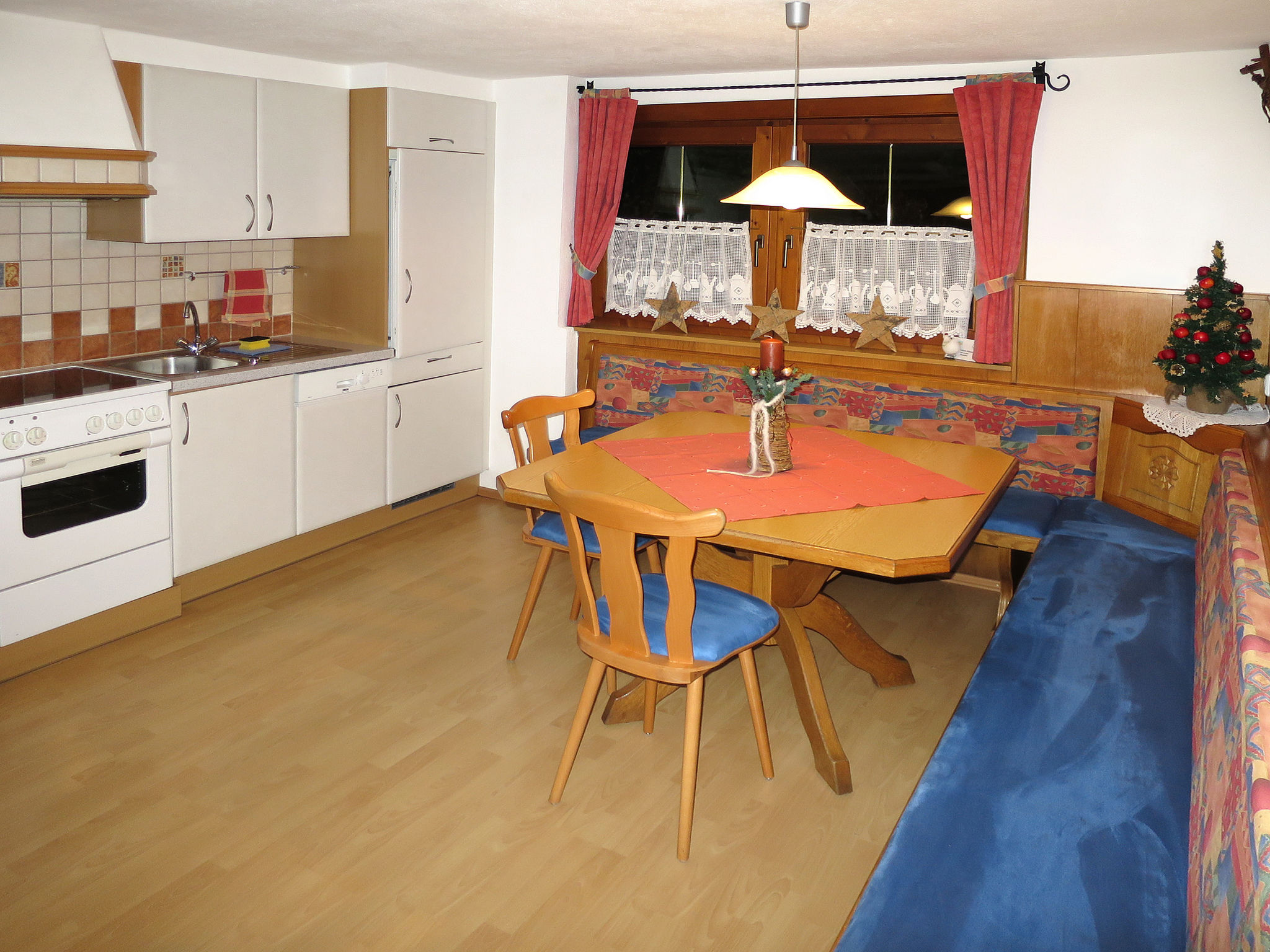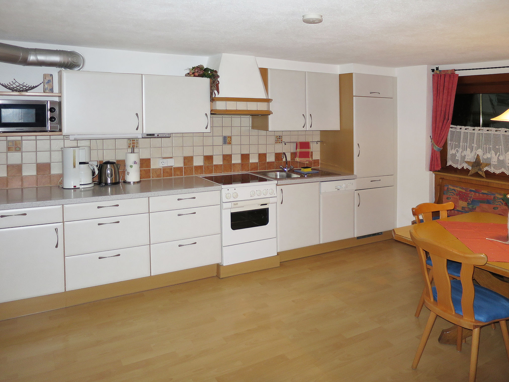 4-Zimmer-Hausteil, 2 Etagen, ca. 110 m². Erdgeschoss: Separater Zugang. Gemütliche Bauernstube mit Kachelofen (Holz inklusive), Essplatz und Bettcouch. Küche (4 Ceranfelder, Backofen, Mikrowelle, Geschirrspüler, Kühlschrank, Kaffeemaschine, Wasserkocher, Toaster) mit Essplatz. Sep.WC. 1. Etage: Flur mit Balkonausgang. Doppelzimmer mit Sat-TV und Dusche. Schlafzimmer mit Doppelbett, Bettcouch und Waschbecken, von hier Zugang zu kleinem Schlafzimmer mit franz. Bett, Dusche, Balkon. Sep.WC. Bei Belegung mit weniger Personen als der maximalen Personenzahl stehen nicht alle Wohneinheiten zur Verfügung.