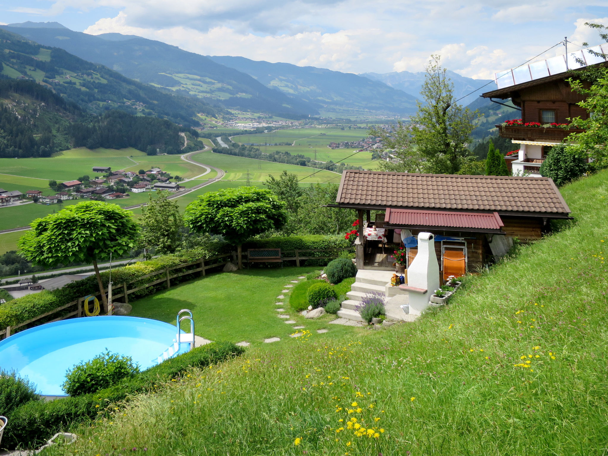Das Haus EGGER, ein Hausteil, steht in Hanglage im Ortsteil Distelberg, mit herrlicher Aussicht auf die Zillertaler Alpen. Freizeitpark mit Badesee, Erlebnishallenbad, Westernfort, Reiten, Spielplatz, Kettcar-Bahn 1,5 km. Restaurant 1,5 km, Aschau 2 km, Zell 4 km. Offenes Grundstück, umgeben von Wiesen und Feldern. Parkplatz. Die Vermieter, die im vorderen Teil des Hauses wohnen, verkaufen Eier, Honig und Schnaps. Gemütliche Grillhütte zur Mitbenutzung (Anmeldung). Zum Hausteil gehört ein Pool (Ø 4 m, Tiefe 1,20 m, 16.05.-26.09.), 6 Liegestühle sowie gemauerter Grill. Möblierte Terrasse und Freisitz. Balkon. Gemütliche und feriengerechte Einrichtung. Holzgetäfelte Wände. Fliesen- und Laminatboden. Sat-TV. Internetzugang (WLAN, inklusive). Waschmaschine, 2 Haartrockner. Pellets-Zentralheizung. Hinweis: Rauchen ist im Haus nicht gestattet. Winter-Infos: Skistationen Zillertal-Arena und Hochzillertal jeweils 3,5 km. Zufahrt ca. 1 km über Bergstraße, Schneeketten können erforderlich sein. Im Haus Skiabstellmöglichkeit und Skischuhtrockner.