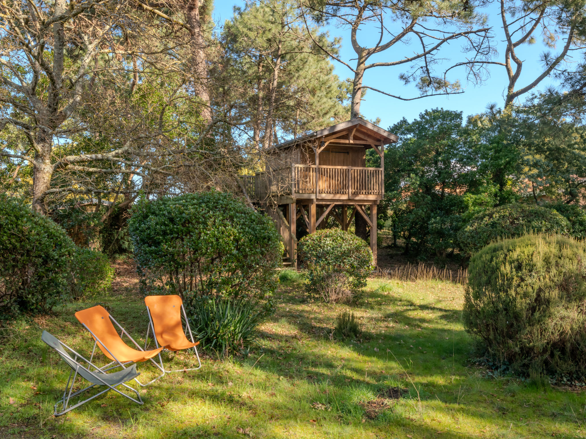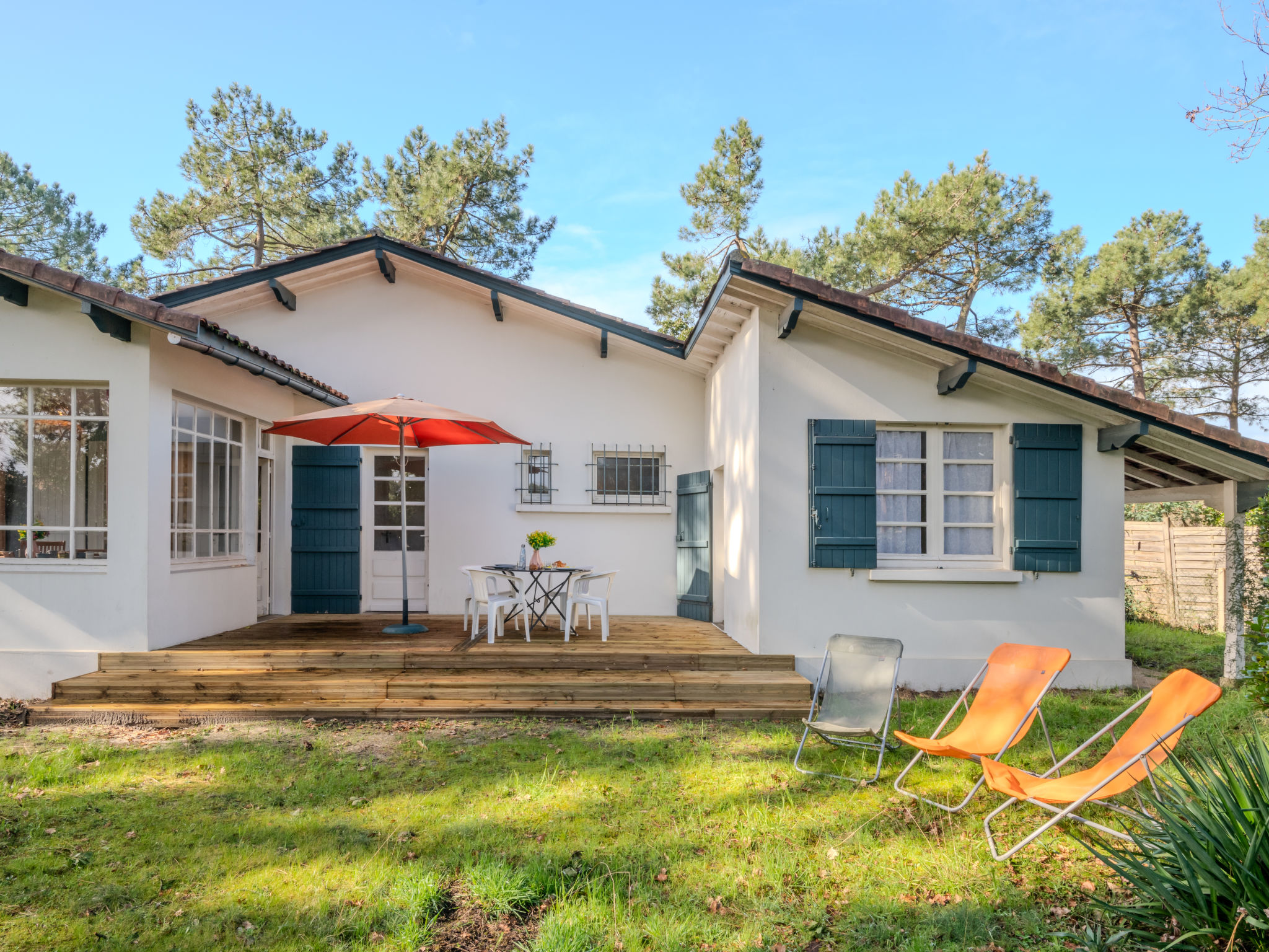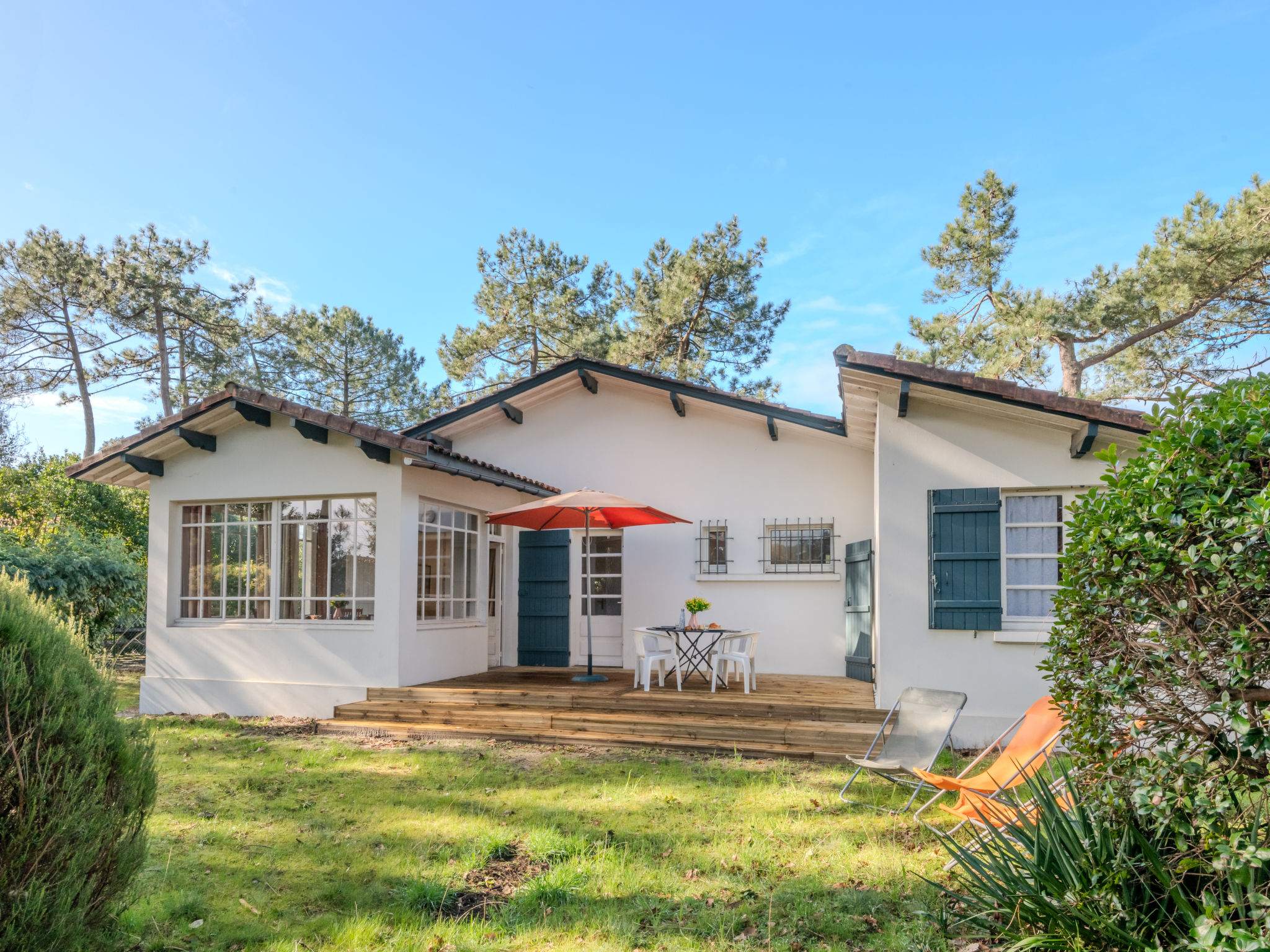 Einfamilienhaus "Les Bruyères". Im Ort, 1.2 km vom Zentrum von Mimizan-Plage, 1.1 km vom Meer, 1.1 km vom Strand, 100 m vom Fluss. Zur Alleinbenutzung: naturbelassenes Grundstück 1'300 m2 (eingezäunt) mit Bäumen, Parkplatz auf dem Grundstück. Supermarkt 1.2 km, Bahnstation "Labouheyre" 30 km, Sandstrand 1.1 km, Park "Landes Aventure" 6 km, Hallenbad 6 km, Badesee "Aureilhan" 10 km. Golfplatz (9 Loch) 6 km, Surfschule 1.1 km. Nahe gelegene Sehenswürdigkeiten: Arcachon 70 km, Bordeaux 120 km, Biscarosse 40 km, Centre Nautique 7 km, Casino Mimizan Plage. Wandergebiete: Parc naturel régional des Landes.