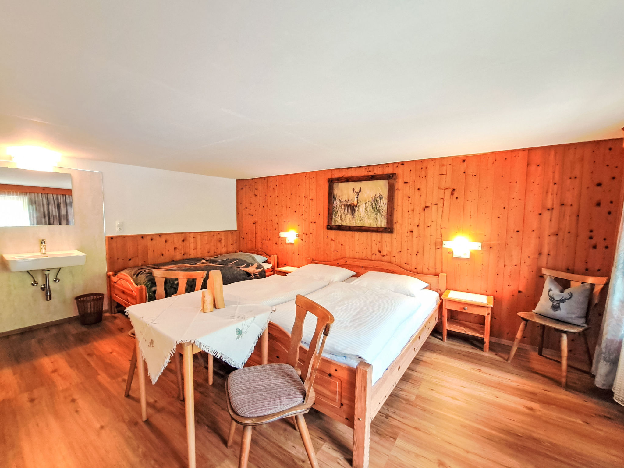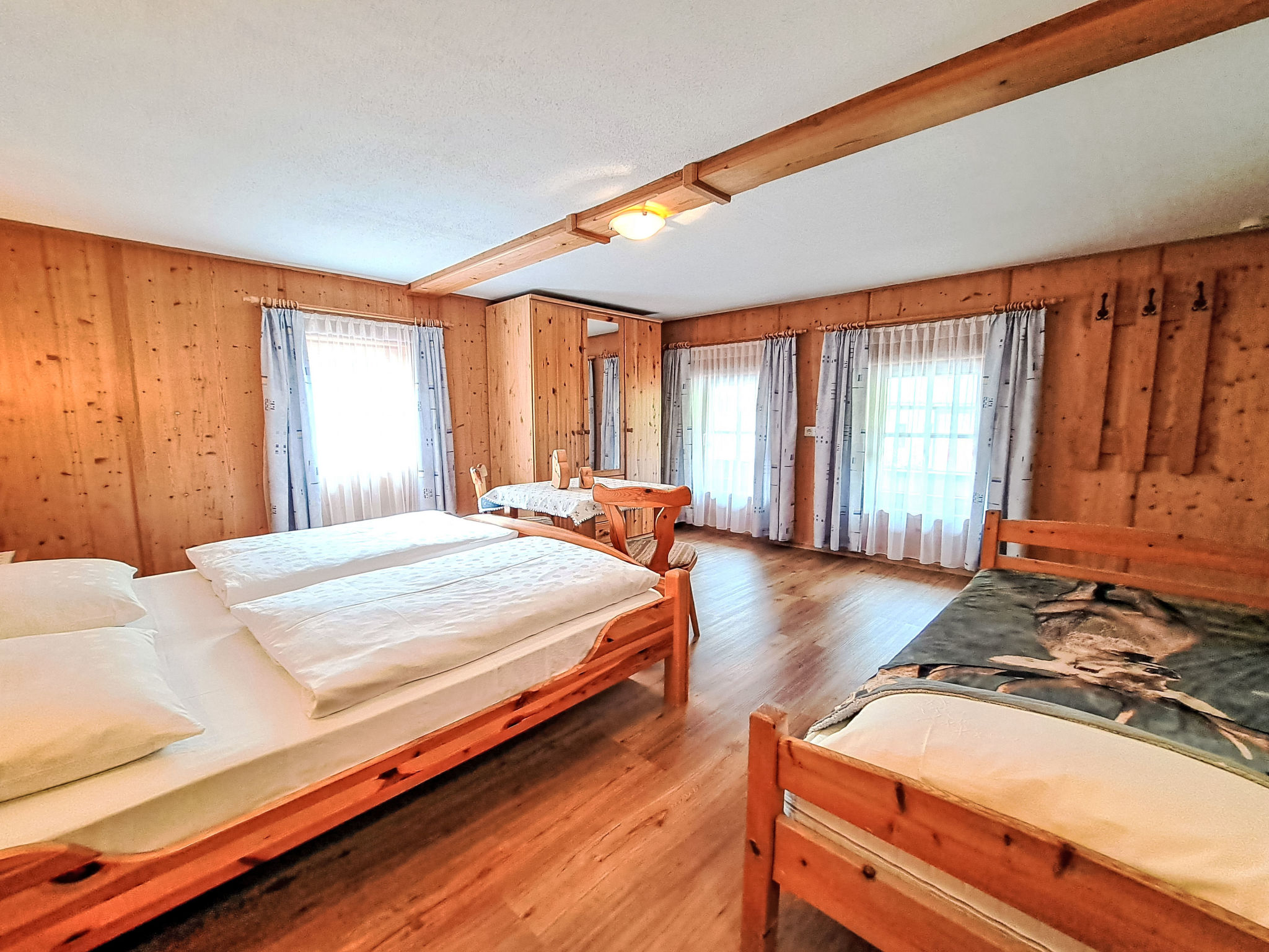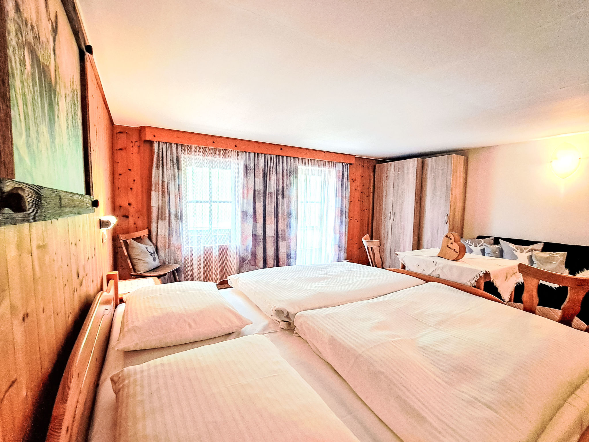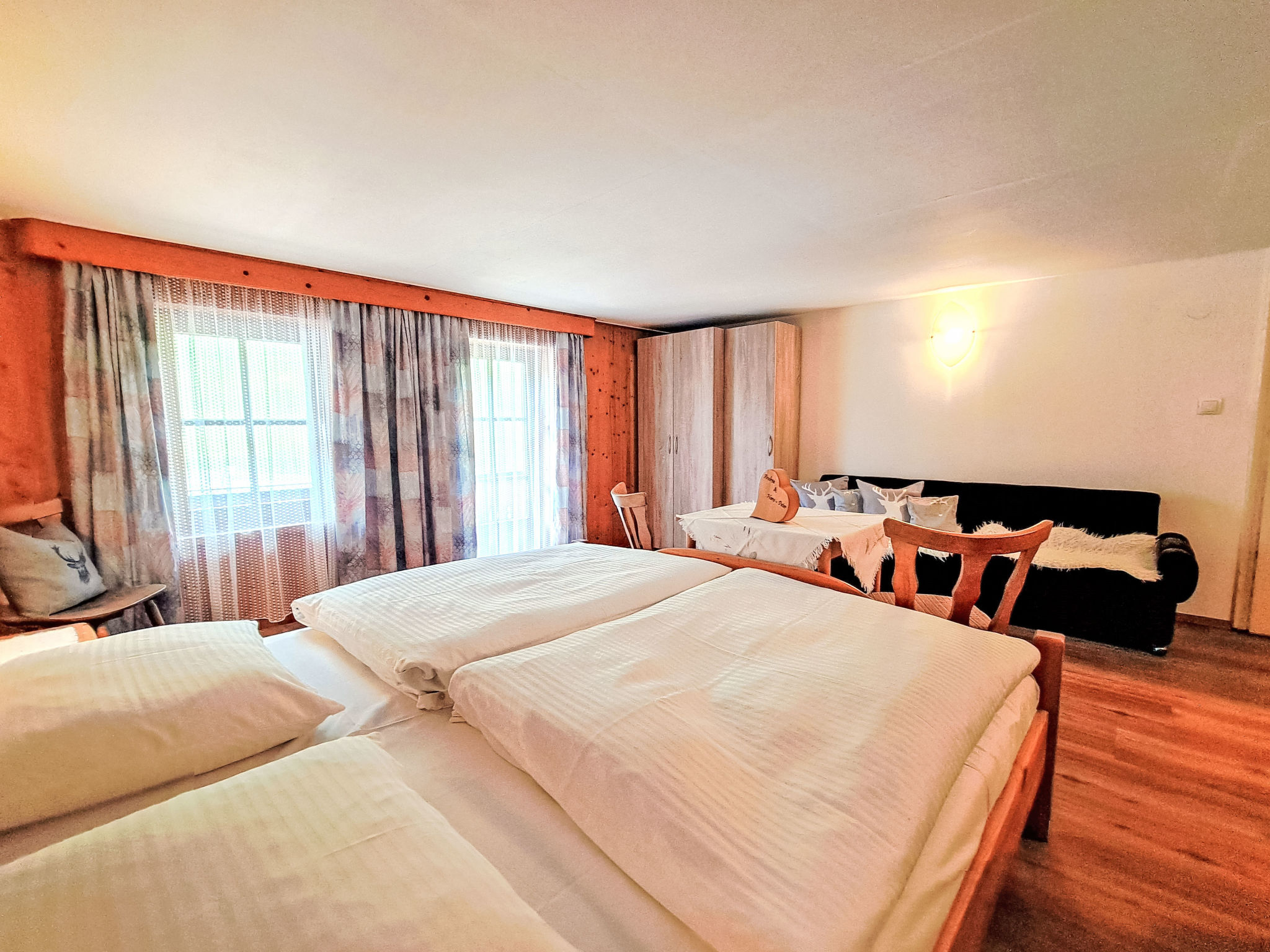 7-Zimmer-Wohnung, 2 Etagen, ca. 135 m². Innentreppe in die 1. Etage: Wohnküche (4 Ceranfelder, Backofen, Geschirrspüler, Kühl-/Gefrierkombination, Kaffeemaschine, Wasserkocher, Mikrowelle, Toaster) mit Essplatz. Schlafzimmer mit Doppelbett und Einzelbett. Doppelzimmer. Dusche/WC. 2. Etage: 2 Schlafzimmer, jeweils mit Doppelbett, Einzelbett und Balkonausgang. Doppelzimmer. Einzelzimmer. 2x Dusche. 2x Sep.WC. Alle Schlafzimmer mit Waschbecken. Die übrigen Zimmer im Erdgeschoss und in der 1. Etage werden vom Vermieter privat genutzt. Hinweis: Bei Buchung zum Preis für 6 Personen bleiben 2 Dreibettzimmer und das Doppelzimmer mit Dusche/WC in der 1. Etage verschlossen, bei Buchung zum Preis für 9 Personen bleibt 1 Dreibettzimmer und das Doppelzimmer mit Dusche/WC in der 1. Etage verschlossen, bei Buchung zum Preis für 12 Personen bleibt das Doppelzimmer mit Dusche/WC in der 1. Etage verschlossen. Bei Belegung mit weniger Personen als der maximalen Personenzahl stehen nicht alle Wohneinheiten zur Verfügung.