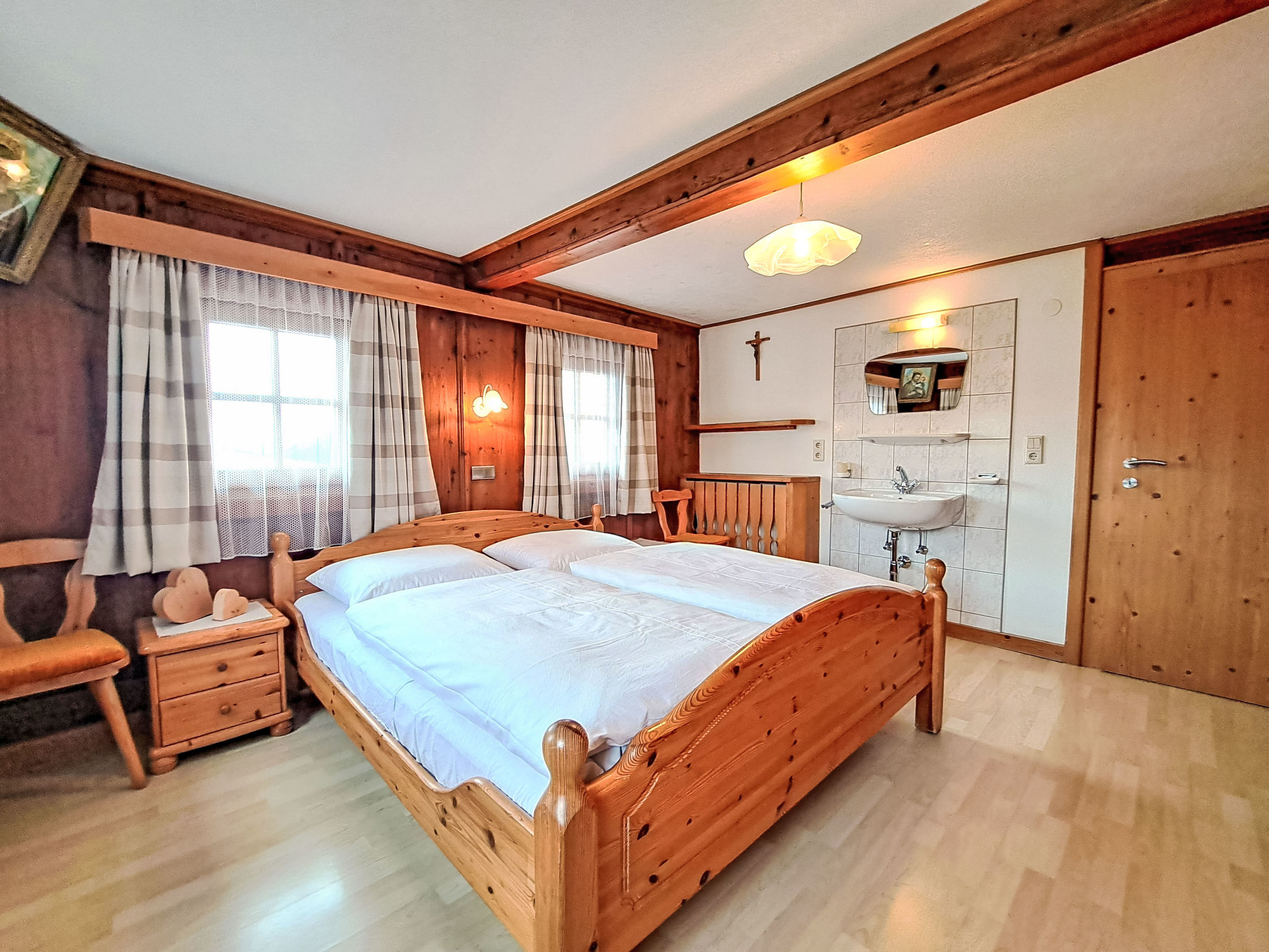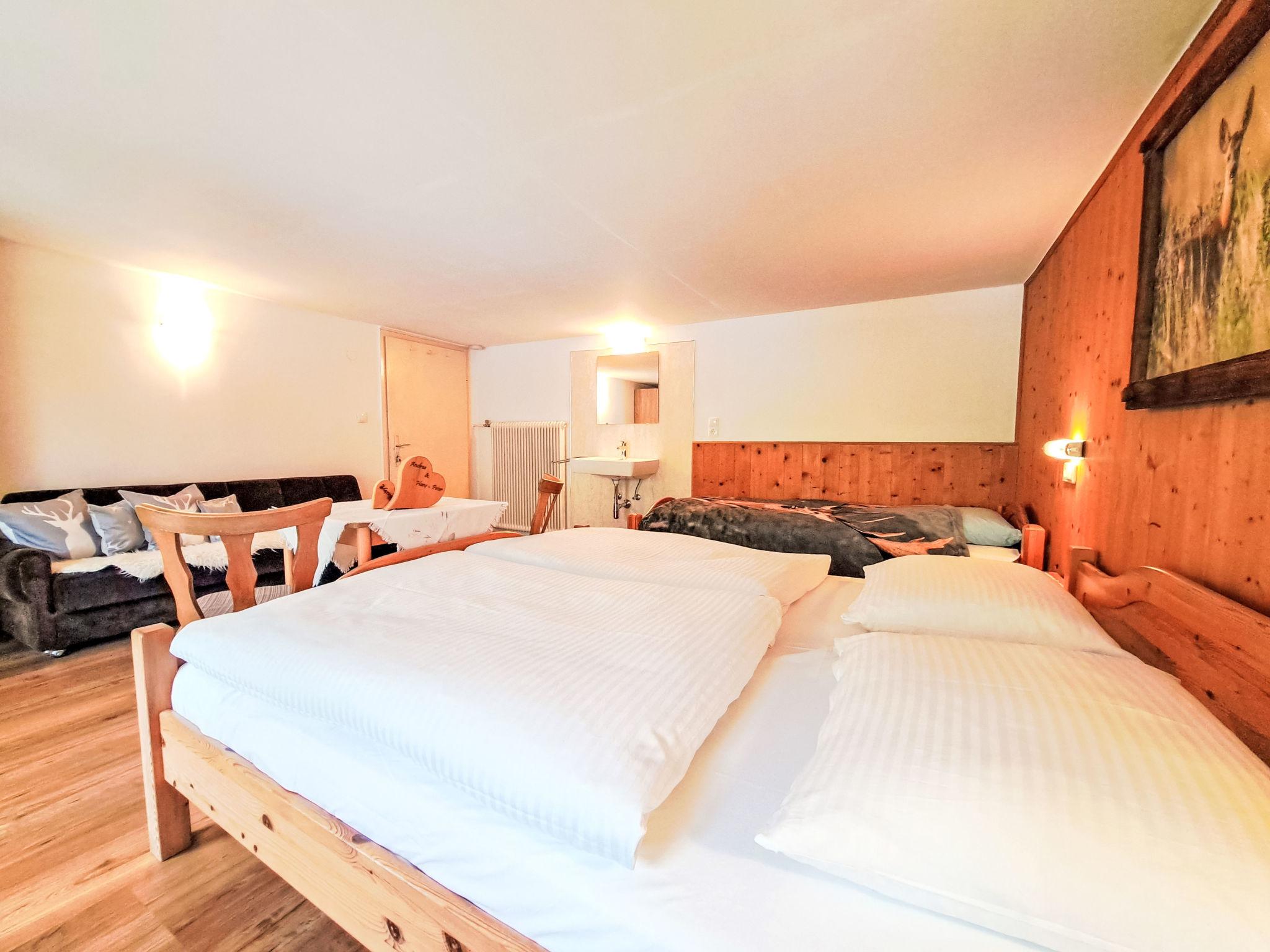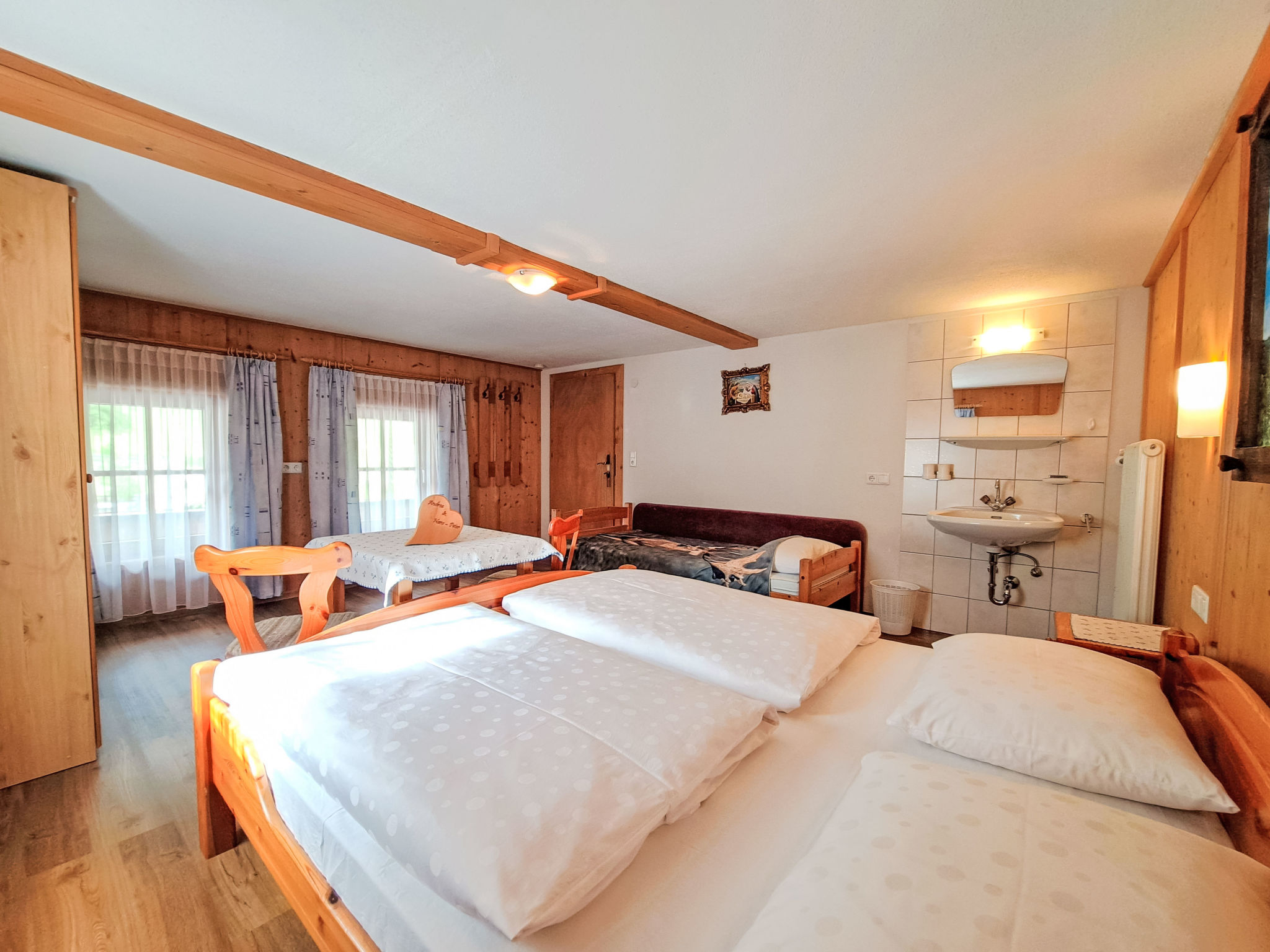 7-Zimmer-Wohnung, 2 Etagen, ca. 135 m². Innentreppe in die 1. Etage: Wohnküche (4 Ceranfelder, Backofen, Geschirrspüler, Kühl-/Gefrierkombination, Kaffeemaschine, Wasserkocher, Mikrowelle, Toaster) mit Essplatz. Schlafzimmer mit Doppelbett und Einzelbett. Doppelzimmer. Dusche/WC. 2. Etage: 2 Schlafzimmer, jeweils mit Doppelbett, Einzelbett und Balkonausgang. Doppelzimmer. Einzelzimmer. 2x Dusche. 2x Sep.WC. Alle Schlafzimmer mit Waschbecken. Die übrigen Zimmer im Erdgeschoss und in der 1. Etage werden vom Vermieter privat genutzt. Hinweis: Bei Buchung zum Preis für 6 Personen bleiben 2 Dreibettzimmer und das Doppelzimmer mit Dusche/WC in der 1. Etage verschlossen, bei Buchung zum Preis für 9 Personen bleibt 1 Dreibettzimmer und das Doppelzimmer mit Dusche/WC in der 1. Etage verschlossen, bei Buchung zum Preis für 12 Personen bleibt das Doppelzimmer mit Dusche/WC in der 1. Etage verschlossen. Bei Belegung mit weniger Personen als der maximalen Personenzahl stehen nicht alle Wohneinheiten zur Verfügung.