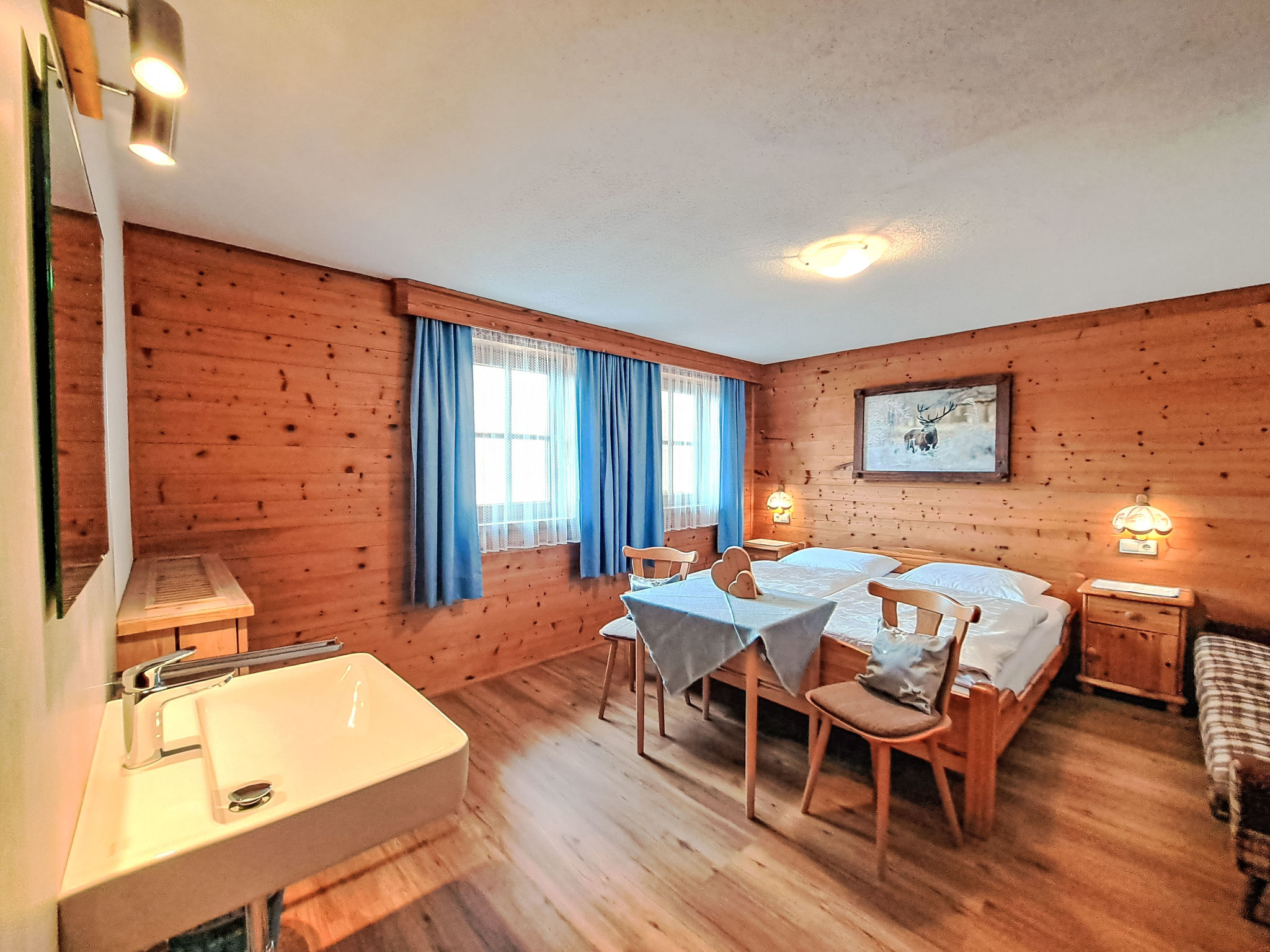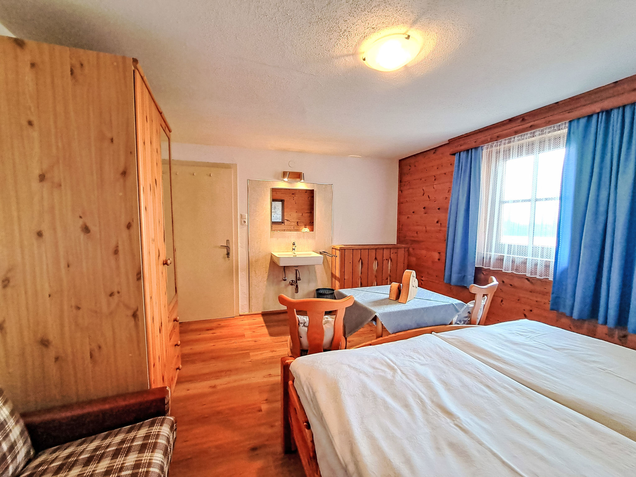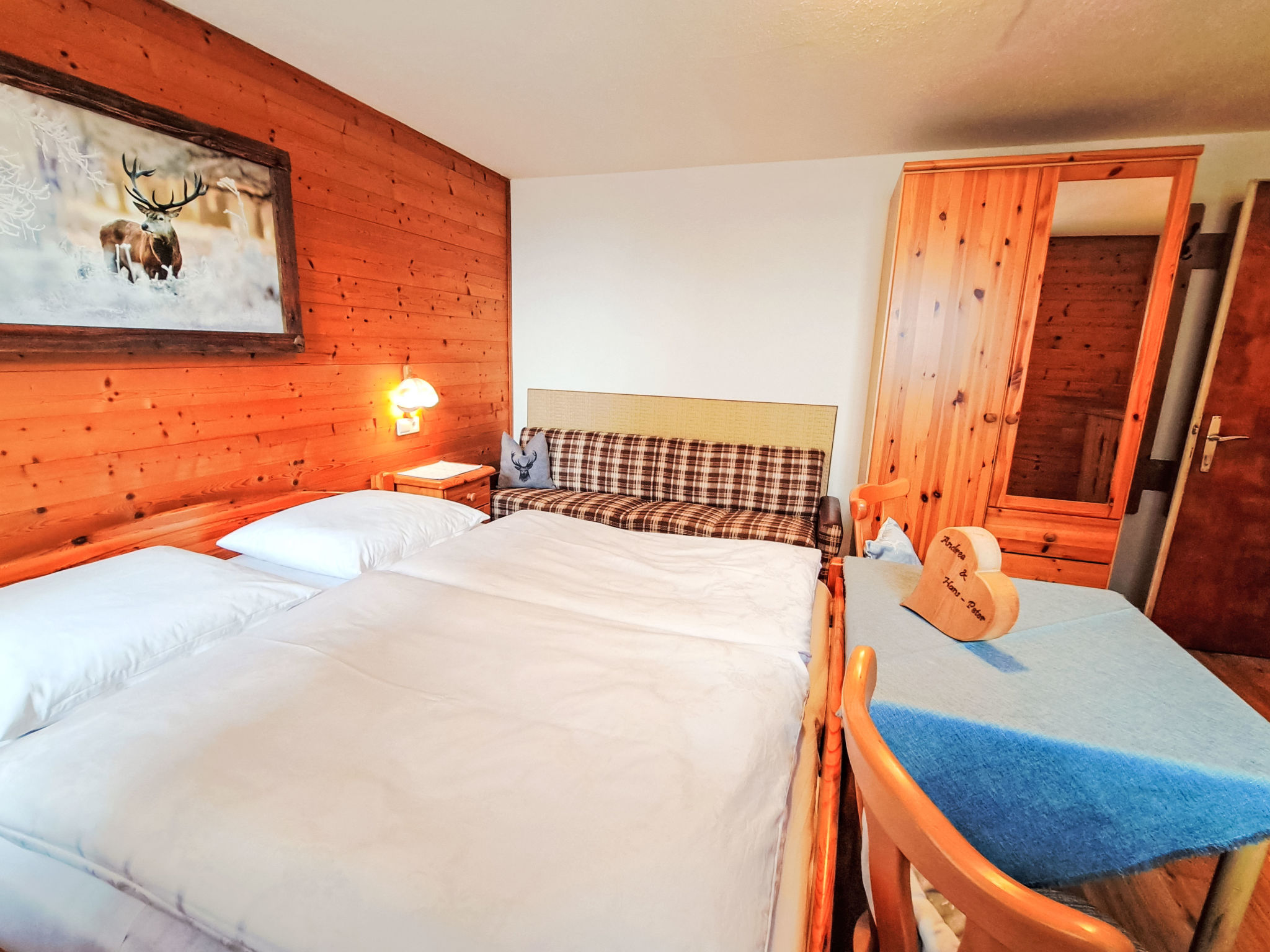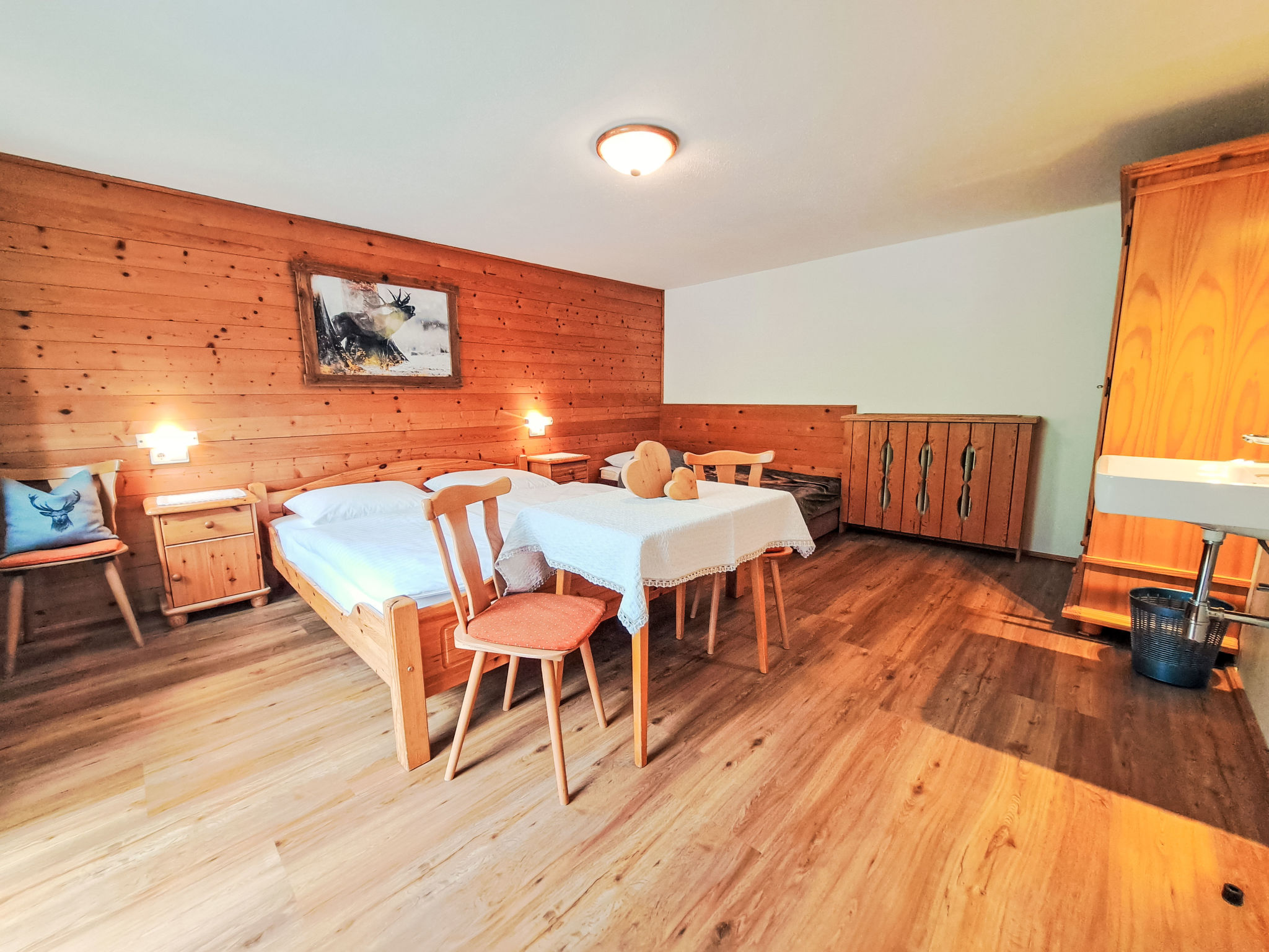 7-Zimmer-Wohnung, 2 Etagen, ca. 135 m². Innentreppe in die 1. Etage: Wohnküche (4 Ceranfelder, Backofen, Geschirrspüler, Kühl-/Gefrierkombination, Kaffeemaschine, Wasserkocher, Mikrowelle, Toaster) mit Essplatz. Schlafzimmer mit Doppelbett und Einzelbett. Doppelzimmer. Dusche/WC. 2. Etage: 2 Schlafzimmer, jeweils mit Doppelbett, Einzelbett und Balkonausgang. Doppelzimmer. Einzelzimmer. 2x Dusche. 2x Sep.WC. Alle Schlafzimmer mit Waschbecken. Die übrigen Zimmer im Erdgeschoss und in der 1. Etage werden vom Vermieter privat genutzt. Hinweis: Bei Buchung zum Preis für 6 Personen bleiben 2 Dreibettzimmer und das Doppelzimmer mit Dusche/WC in der 1. Etage verschlossen, bei Buchung zum Preis für 9 Personen bleibt 1 Dreibettzimmer und das Doppelzimmer mit Dusche/WC in der 1. Etage verschlossen, bei Buchung zum Preis für 12 Personen bleibt das Doppelzimmer mit Dusche/WC in der 1. Etage verschlossen. Bei Belegung mit weniger Personen als der maximalen Personenzahl stehen nicht alle Wohneinheiten zur Verfügung.