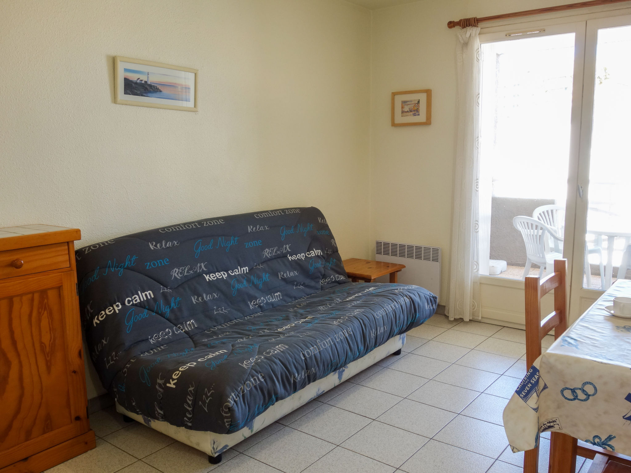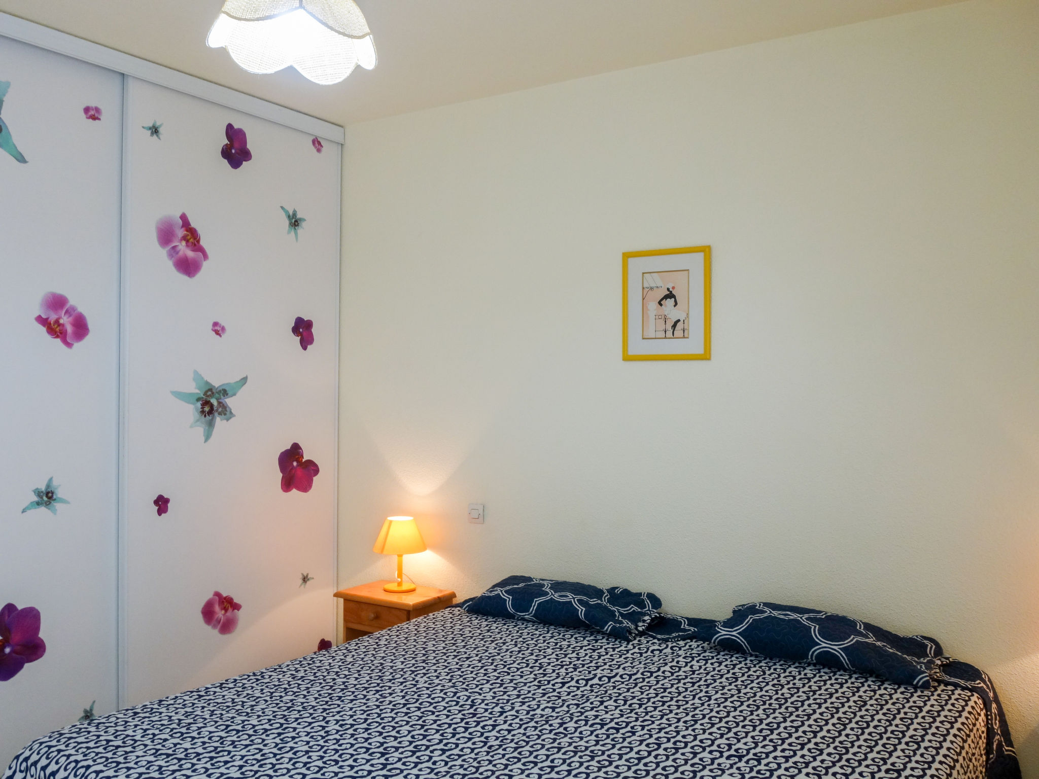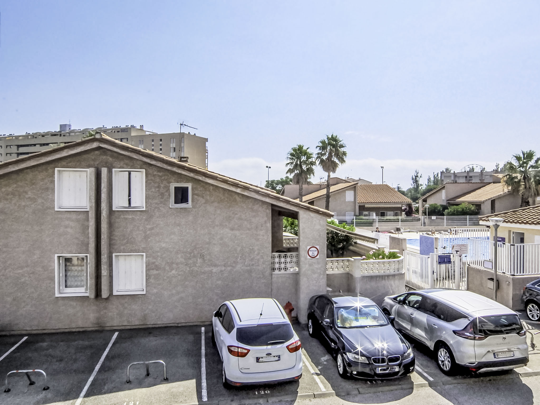 2-Zimmer-Wohnung 35 m2 im 1. Stock. Wohn-/Esszimmer mit 1 Doppeldiwanbett und TV (Flachbildschirm). Ausgang zur Terrasse. 1 Zimmer mit 1 franz. Bett (140 cm, Länge 190 cm). Kochnische (2 Kochplatten, Mini-Backofen, Geschirrspüler, Mikrowelle, Tiefkühler, elektrische Kaffeemaschine). Bad/WC. Terrasse 10 m2, überdacht, Ostlage. Terrassenmöbel. Sicht auf das Schwimmbad. Zur Verfügung: Waschmaschine, Babybett. Internet (Wireless LAN, extra). Parkplatz Nr. 123 intérieur. Bitte beachten: Maximal 1 Haustier/Hund erlaubt. Rauchmelder. Inserat einer Privatperson nach Artikel 155, IV, CGI.