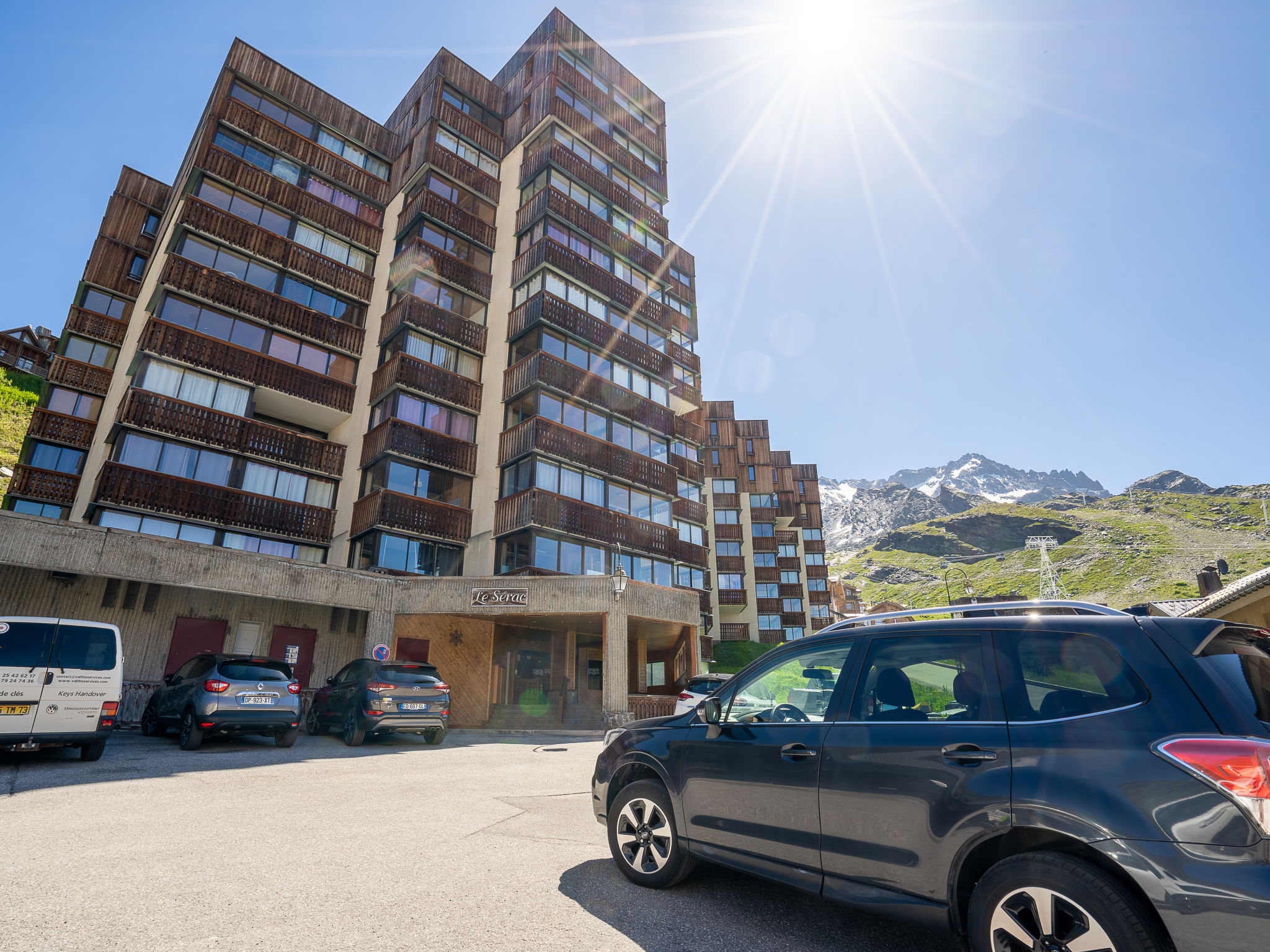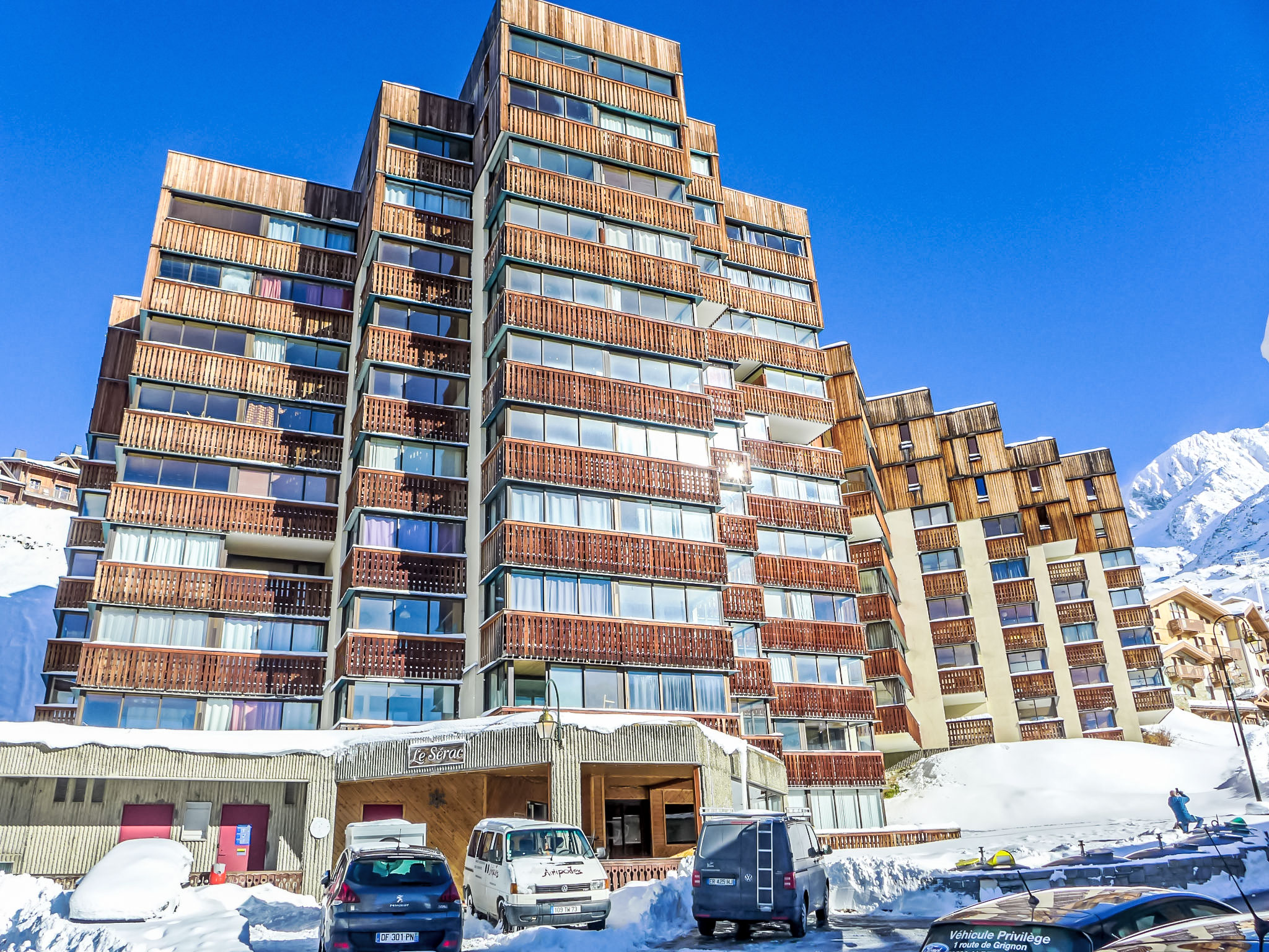 Residenz "Le Sérac", auf 4 Stockwerken. Oberhalb von Val Thorens, im Ortsteil Péclet, im Ortszentrum, direkt am Skigebiet. Im Hause: Wireless LAN (extra). Fahrstuhl, Zentralheizung. Öffentliches Parkhaus in 200 m, extra. Einkaufsgeschäft 100 m, Lebensmittelgeschäft, Supermarkt 150 m, Einkaufszentrum 100 m, Restaurant 50 m, Bar 250 m, Bäckerei 150 m, Café 50 m, Fußgängerzone 100 m, Zentrum zu Fuss in 5 Minuten erreichbar, Bushaltestelle "Navette Gratuit" 100 m. Skisportanlagen 100 m, Skipisten, Skiverleih 50 m, Skischule 150 m, Ski-Kindergarten, Eisfeld, Kinderspielplatz 50 m. Bekannte Skigebiete sind gut erreichbar: 3 Vallées. Bekannte Seen in der Umgebung sind gut erreichbar: Lac du lou 1 km, Lac Du menuieres 800 m.