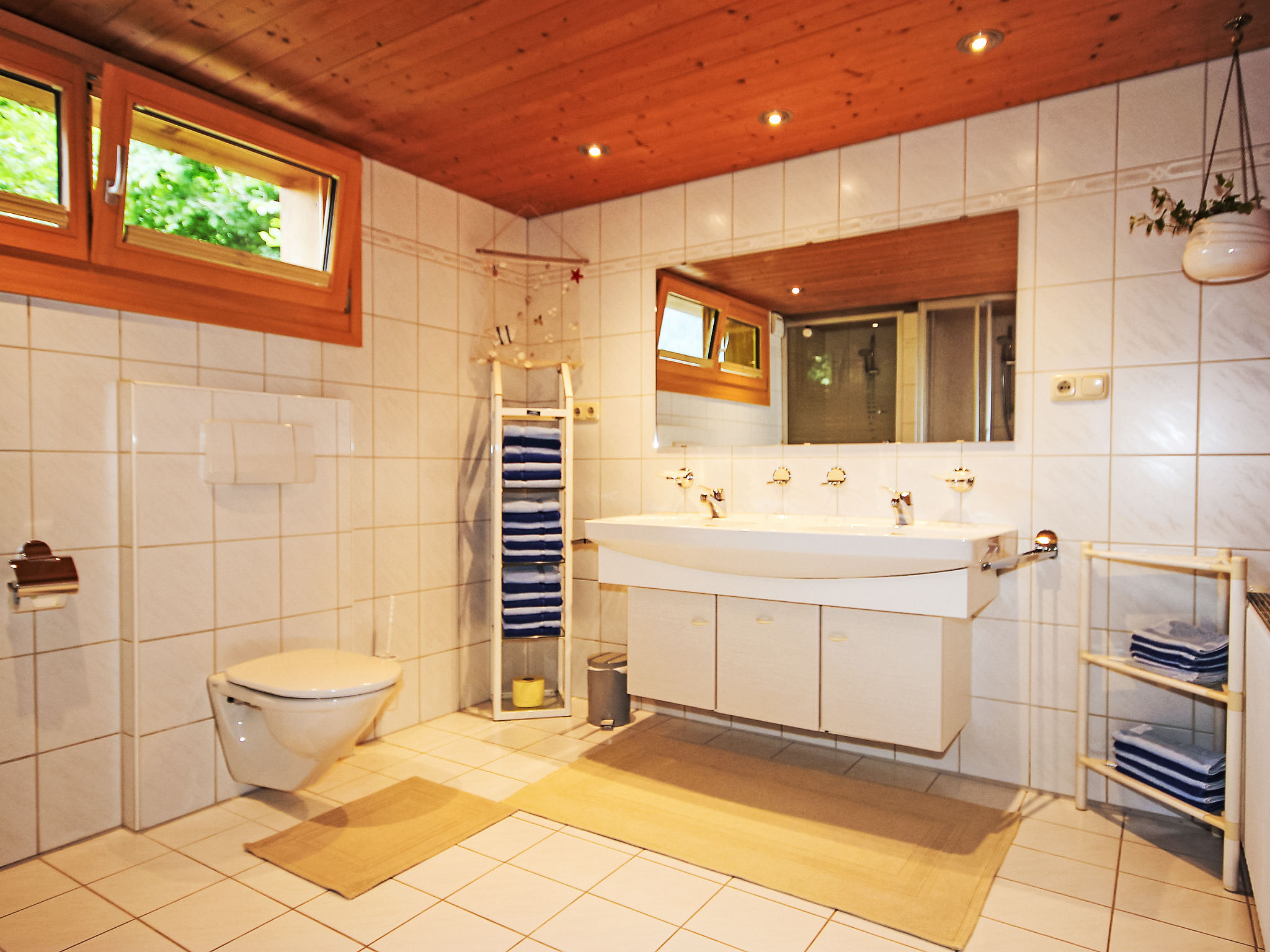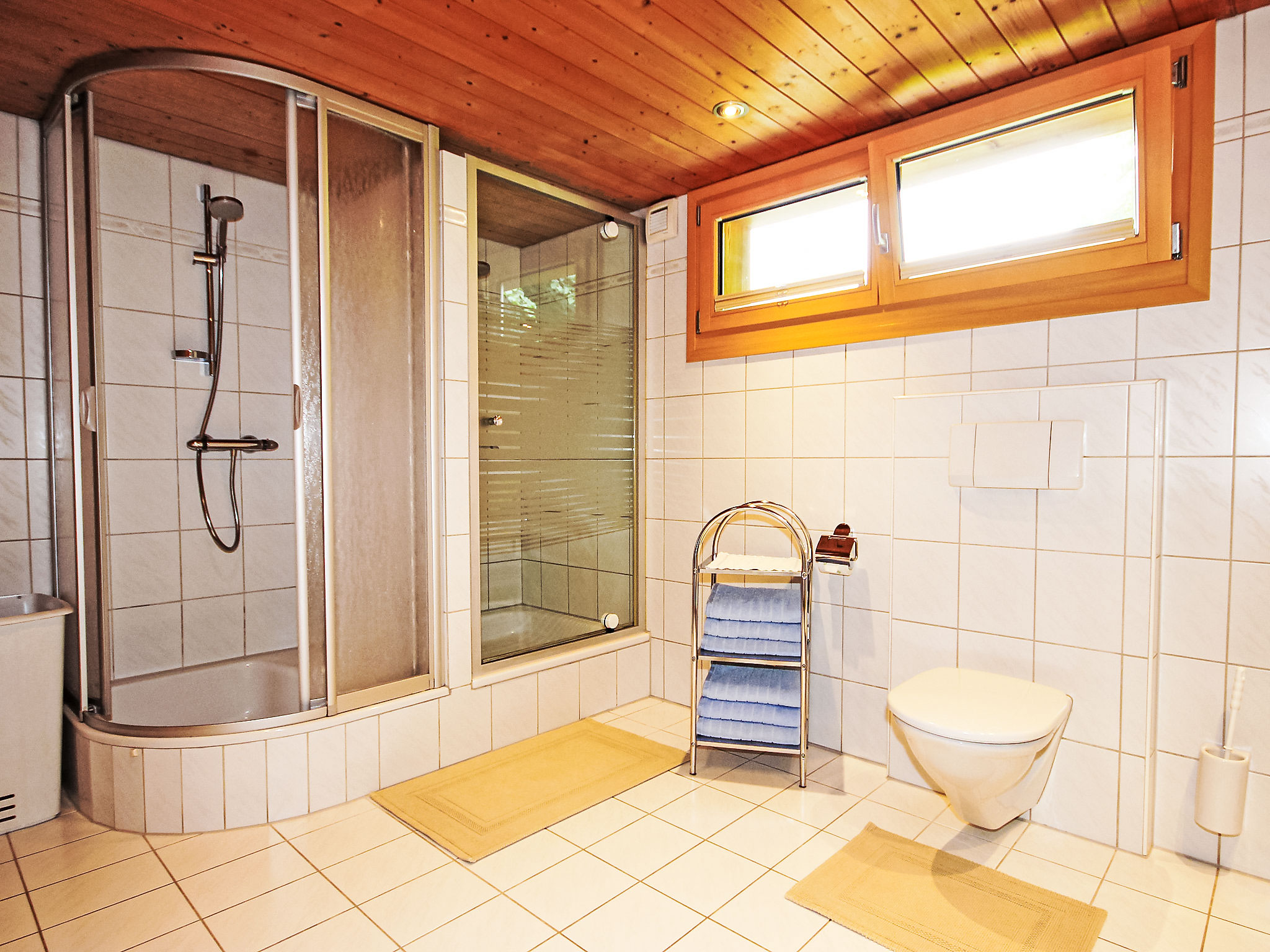 5-Zimmer-Haus 125 m2 auf 2 Stockwerken. Grosses Wohnzimmer mit Essecke, Sat-TV, Radio und DVD. 1 Zimmer mit 1 x 2 Etagenbetten, 1 Doppelbett. Küche (Backofen, Geschirrspüler, 4 Glaskeramikherd Platten, Mikrowelle, Tiefkühler) mit Essecke. Dusche/WC. Obergeschoss: 1 Doppelzimmer mit Waschbecken. Ausgang zum Balkon. 1 abgeschrägtes Doppelzimmer. Ausgang zum Balkon. 1 Doppelzimmer mit Waschbecken. Dusche/WC, Doppelwaschbecken. Balkon 8 m2, Terrasse 20 m2. Schöne Sicht auf die Berge. Zur Verfügung: Waschmaschine, Wäschetrockner, Kinderhochstuhl, Babybett. Internet (Wireless LAN, gratis). Parkplatz (3 Autos). Bitte beachten: Nichtraucher-Unterkunft.