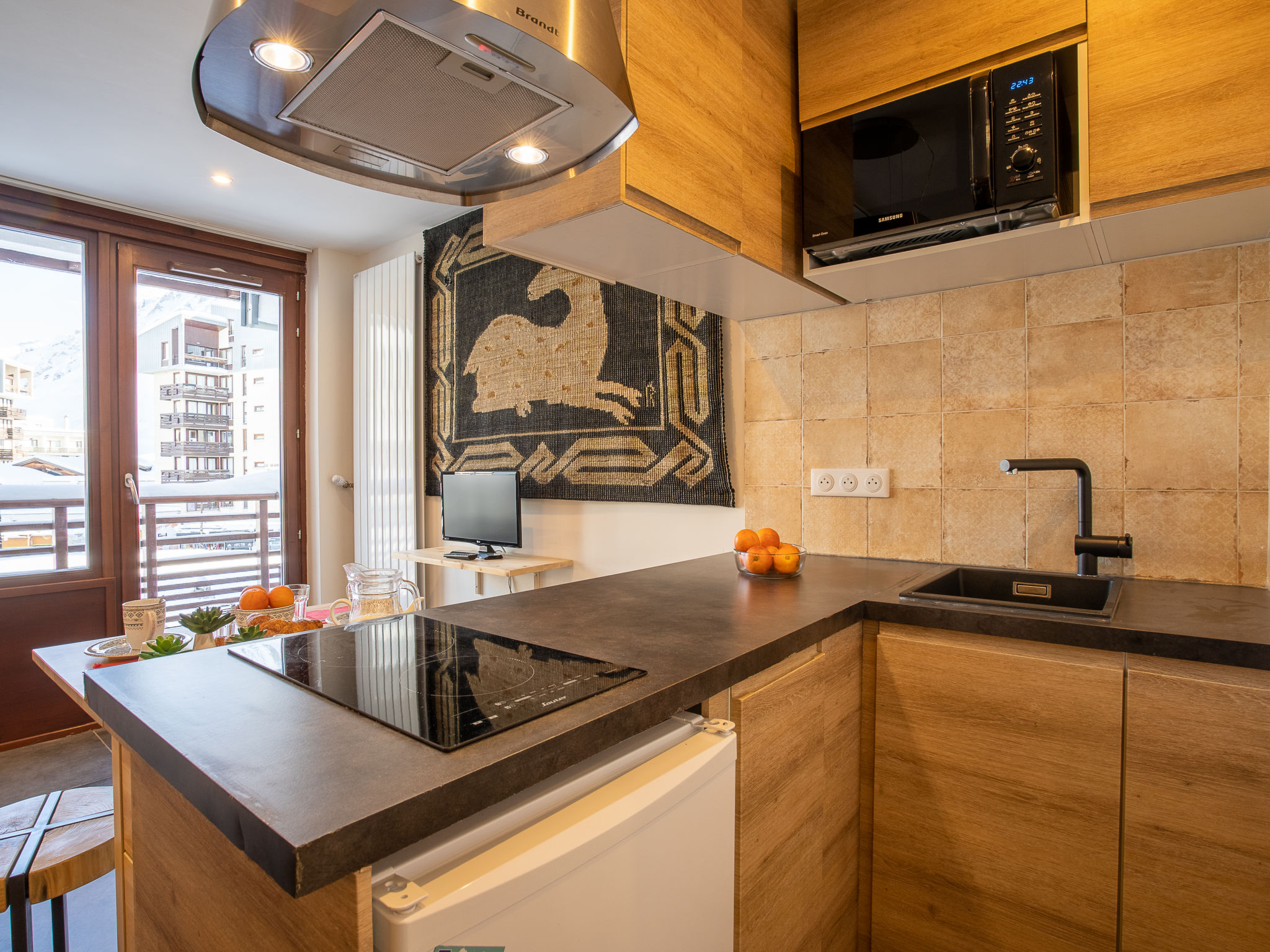 Val Claret: Im Einkaufszentrum Residenz "Le Curling B". Im Ortszentrum von Tignes le Val Claret, 200 m vom Skigebiet. In der Anlage: Fahrstuhl, Skiraum, Zentralheizung. Einkaufsgeschäft, Supermarkt 20 m, Restaurant 10 m, Bar 5 m, Bäckerei 10 m, Hallenbad 2 km. Sportzentrum 800 m, Skisportanlagen, Skischule 200 m. Bekannte Skigebiete sind gut erreichbar: Espace Killy. Bitte beachten: Gratis Skibus. Bei guter Schneelage Zufahrt mit den Skiern bis zum Haus. Nacht Club/Disco in der Nähe 150 m vom Haus. In diesem Haus sind weitere Ferienwohnungen mietbar.