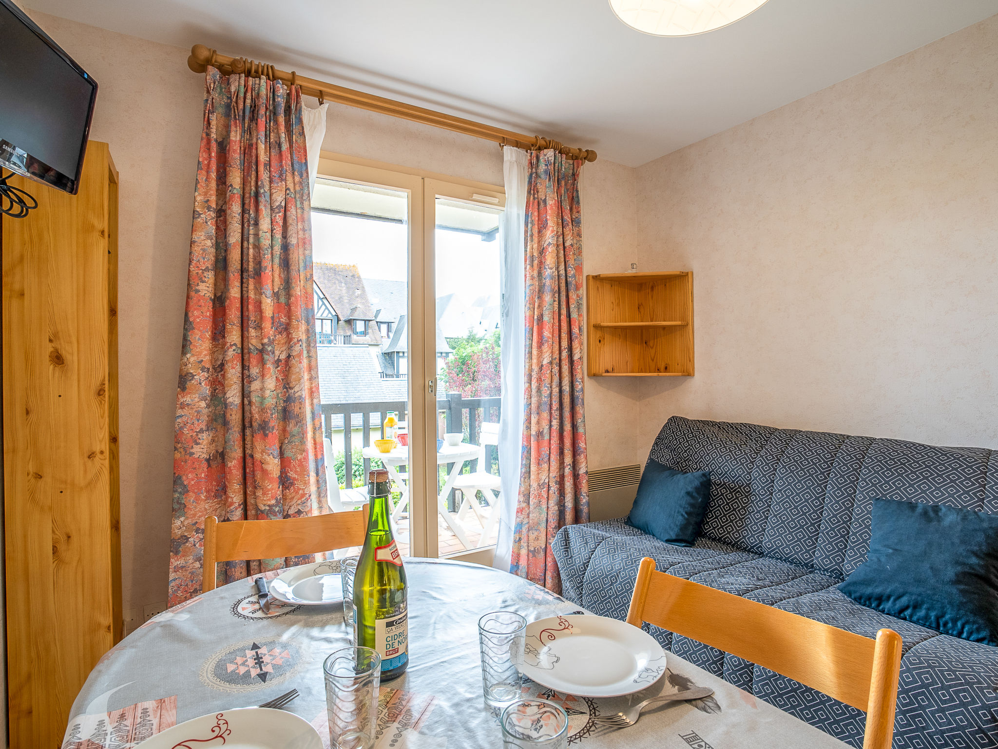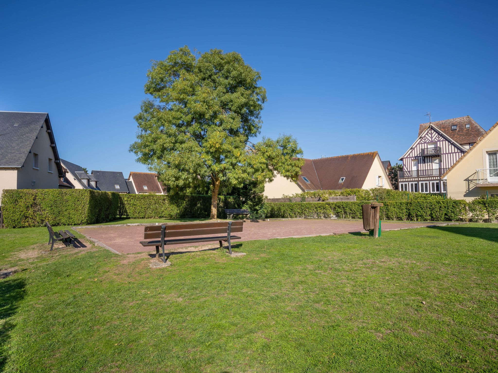 Residenz "Fleur Marine". Im Ort, 1 km vom Zentrum von Cabourg, 300 m vom Meer, 300 m vom Strand, direkter Zugang zum Strand. Parkplatz (beschränkte Anzahl). Einkaufsgeschäft 1 km, Supermarkt 900 m, Restaurant 1 km, Thermalbad"Thalassothérapie" 500 m. Golfplatz (9 Loch) 1.2 km, Sportzentrum 500 m. Bitte beachten: Das Foto ist nur ein Hausbeispiel. Bestehend aus 2-geschossigen Doppelhäusern und 3-geschossigen Gebäuden im normannischen Stil.