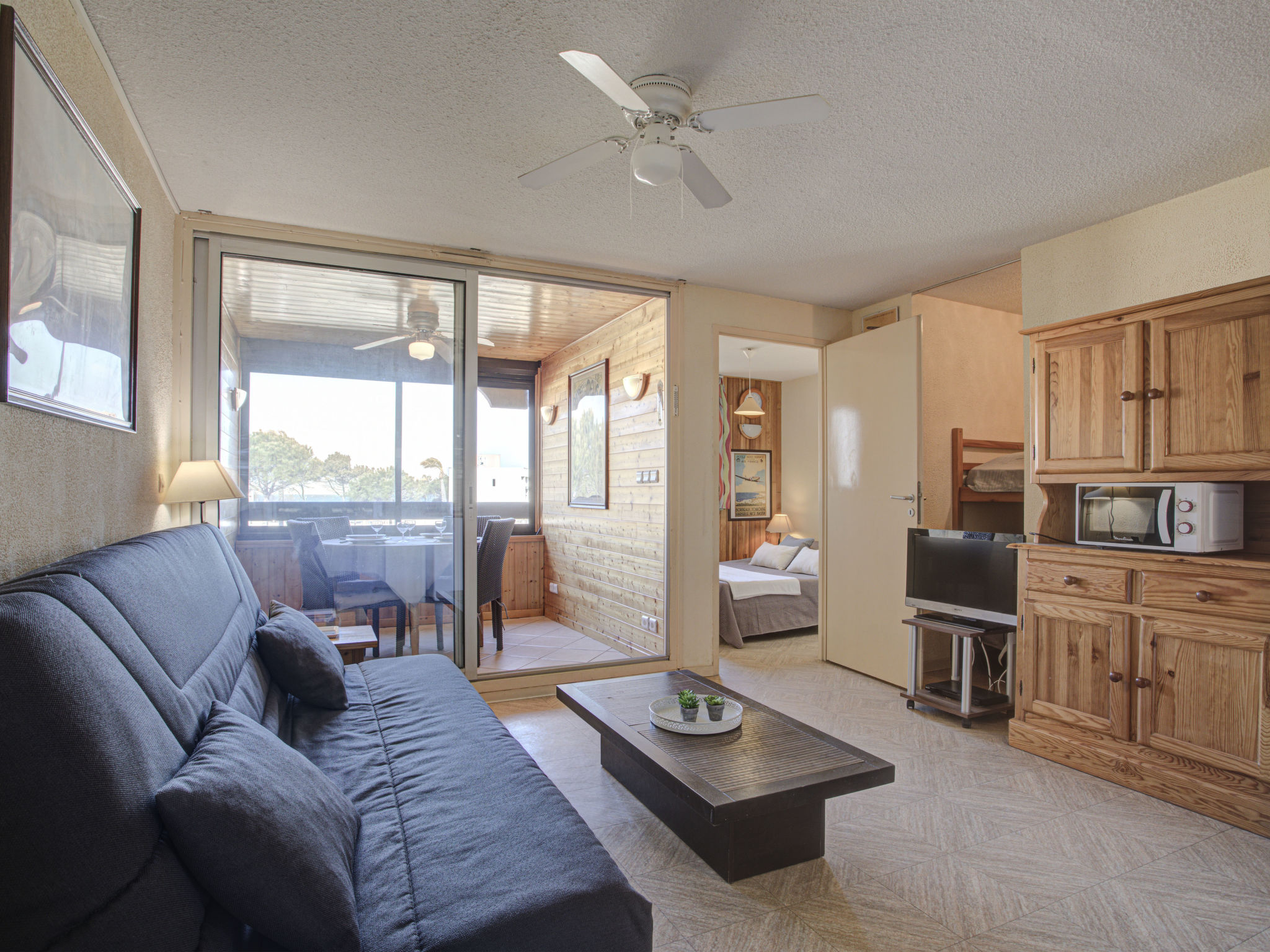 2-Zimmer-Wohnung 30 m2 im 2. Stock. Wohn-/Esszimmer mit TV (Flachbildschirm). Ausgang zur Loggia. Schlafnische mit 1 x 2 Etagenbetten (90 cm, Länge 180 cm). 1 Zimmer mit 1 franz. Bett (140 cm, Länge 190 cm). Kochnische (2 Kochplatten, Mini-Backofen, Mikrowelle, elektrische Kaffeemaschine). Dusche/WC. Balkonmöbel. Zur Verfügung: Internet (Wireless LAN, extra). Bitte beachten: Maximal 1 Haustier/Hund erlaubt. Rauchmelder. Geschlossener Balkon. Inserat einer Privatperson nach Artikel 155, IV, CGI.