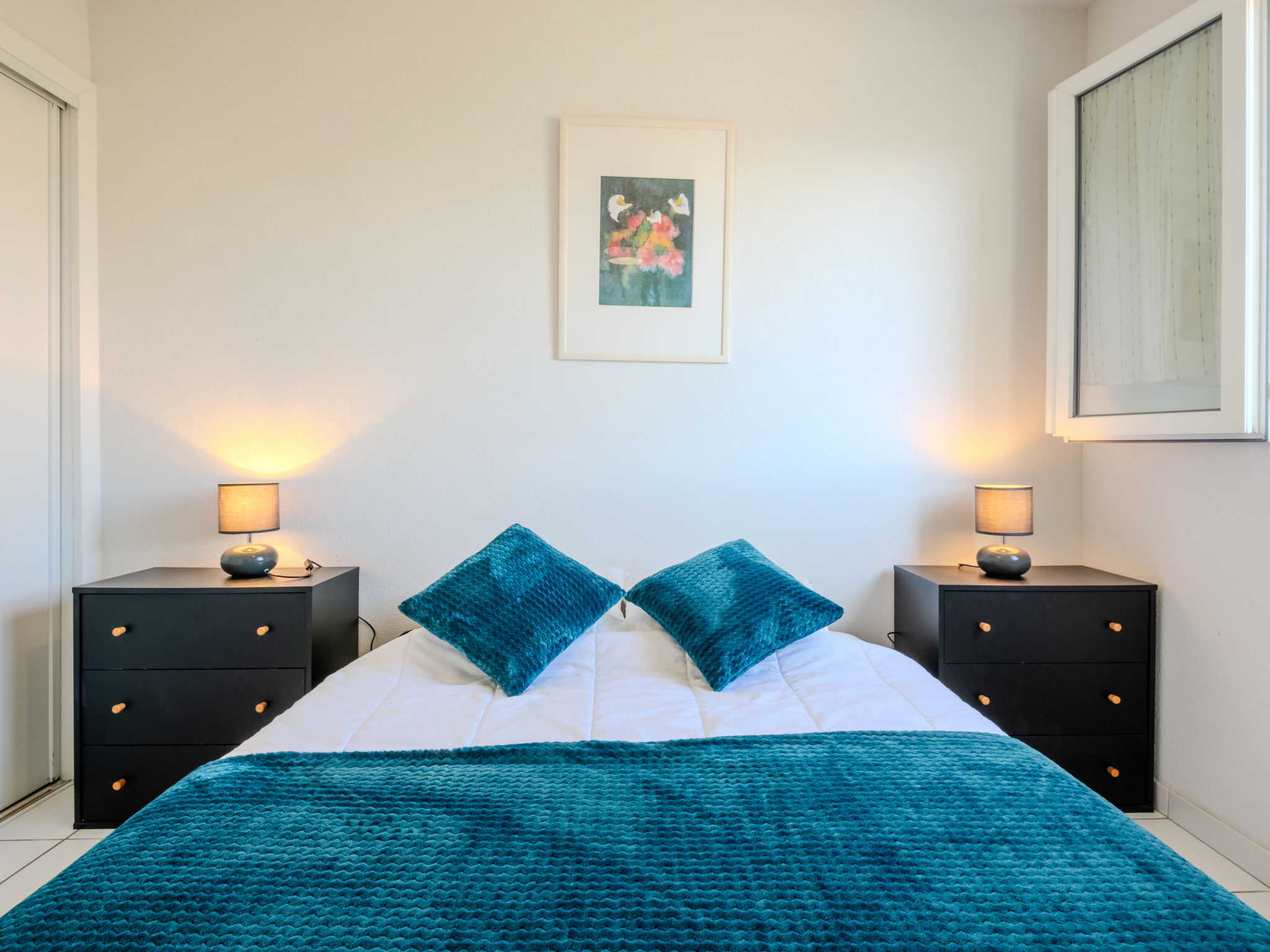 2-Zimmer-Wohnung 36 m2 im 2. Stock. Eingang mit 1 x 2 Etagenbetten (90 cm, Länge 190 cm). Wohn-/Esszimmer mit TV und Internationale TV-Sender (Flachbildschirm). Ausgang zum Balkon. 1 Zimmer mit 1 franz. Bett (1 x 140 cm, Länge 190 cm). Kochnische (2 Kochplatten, Mini-Backofen, Toaster, Mikrowelle, elektrische Kaffeemaschine). Dusche, sep. WC. E-Heizung. Balkon. Balkonmöbel. Sicht auf das Meer. Zur Verfügung: Waschmaschine. Internet (Wireless LAN, extra). Parkplatz (überdacht). Bitte beachten: geeignet für Familien. Rauchmelder. Inserat einer Privatperson nach Artikel 155, IV, CGI.