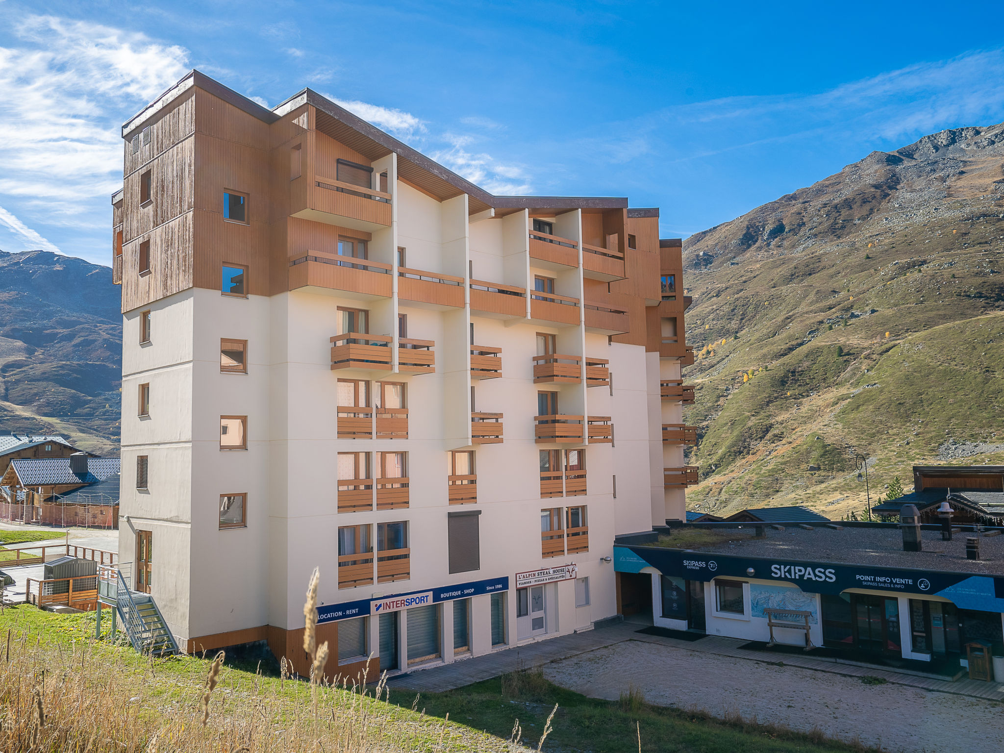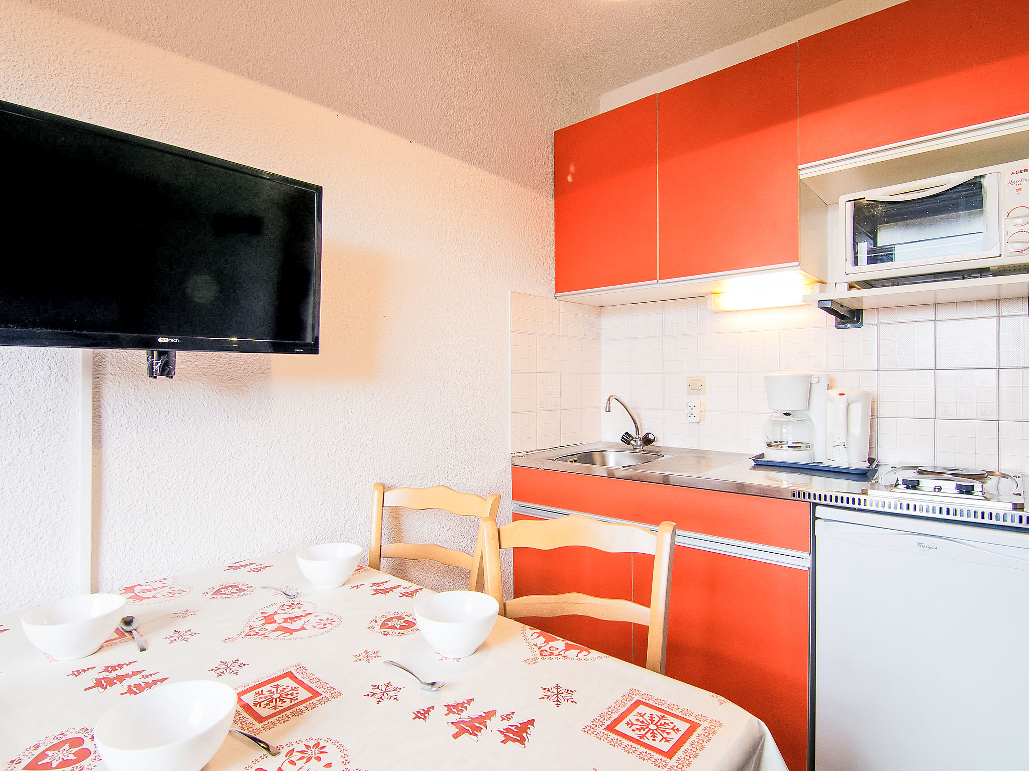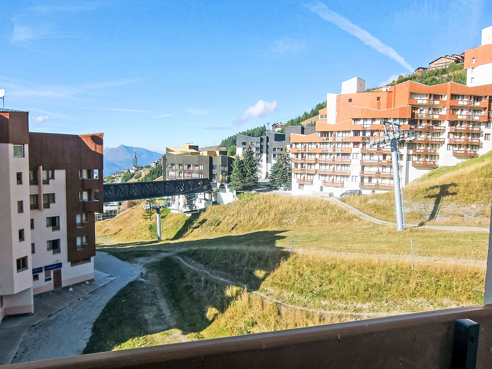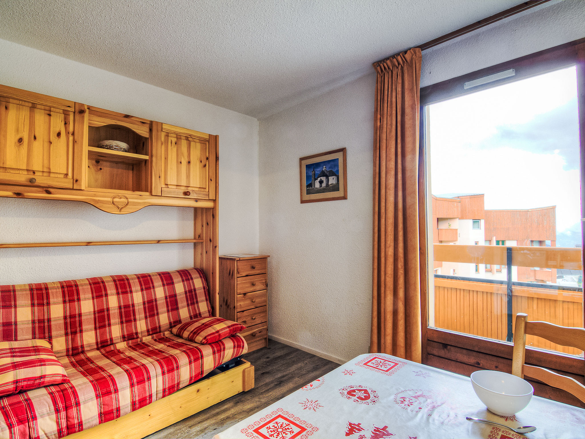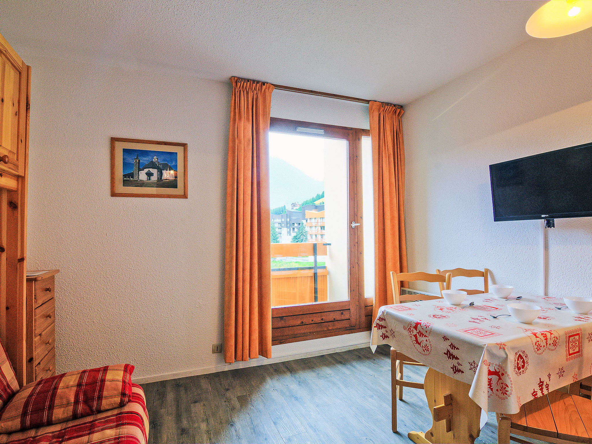 Residenz "Les Carlines 1". Im Ortsteil Bruyères, zentrale Lage. Im Hause: Fahrstuhl, Skiraum. Öffentliche Parkplätze. Supermarkt, Restaurant 10 m, Freibad 50 m. Skisportanlagen 30 m, Skipisten 10 m, Skischule 20 m, Eisfeld 50 m.