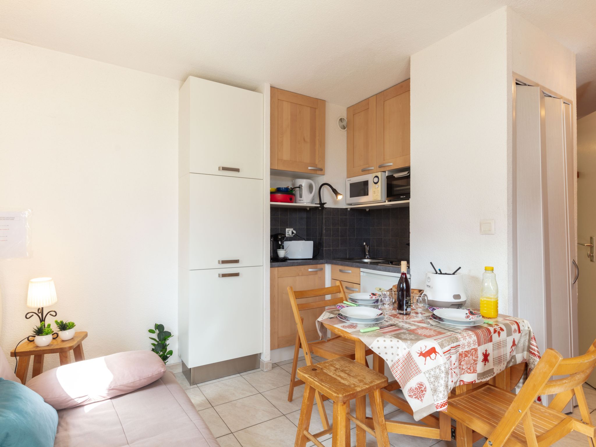 2-Zimmer-Wohnung 25 m2 im 1. Stock. Zweckmässig eingerichtet: kleines Wohn-/Esszimmer mit TV (Flachbildschirm). Ausgang zur Terrasse. Eingang mit 1 x 2 Etagenbetten (70 cm, Länge 190 cm). 1 Zimmer mit 1 franz. Bett (140 cm, Länge 190 cm). Kochnische (2 Kochplatten, Backofen, Toaster, Mikrowelle, elektrische Kaffeemaschine, Kapseln für die Kaffeemaschine (TASSIMO), Racletteofen, Fondue Set (Käse)). Dusche/WC. E-Heizung. Parkettböden. Balkon 6 m2, Westlage. Balkonmöbel, Liegestühle. Schöne Sicht auf die Landschaft. Zur Verfügung: Haartrockner. Internet (Wireless LAN, extra). Bitte beachten: Rauchmelder. Wohnung im Gebäude A. ACHTUNG: DIE SCHLÜSSEL ZUM GEBÄUDE «LA TOUSSUIRE» bekommen Sie im Corbier Interhome Büro. (Skigebiet «La Toussuire» ist 4 km entfernt). FÜR ANREISEN MIT DEM BUS: kontaktieren Sie uns bitte 48 Stunden im Voraus, um die Schlüsselübergabe zu vereinbaren. Internetverbindung (W-LAN) muss bezahlt werden. Inserat einer Privatperson nach Artikel 155, IV, CGI.