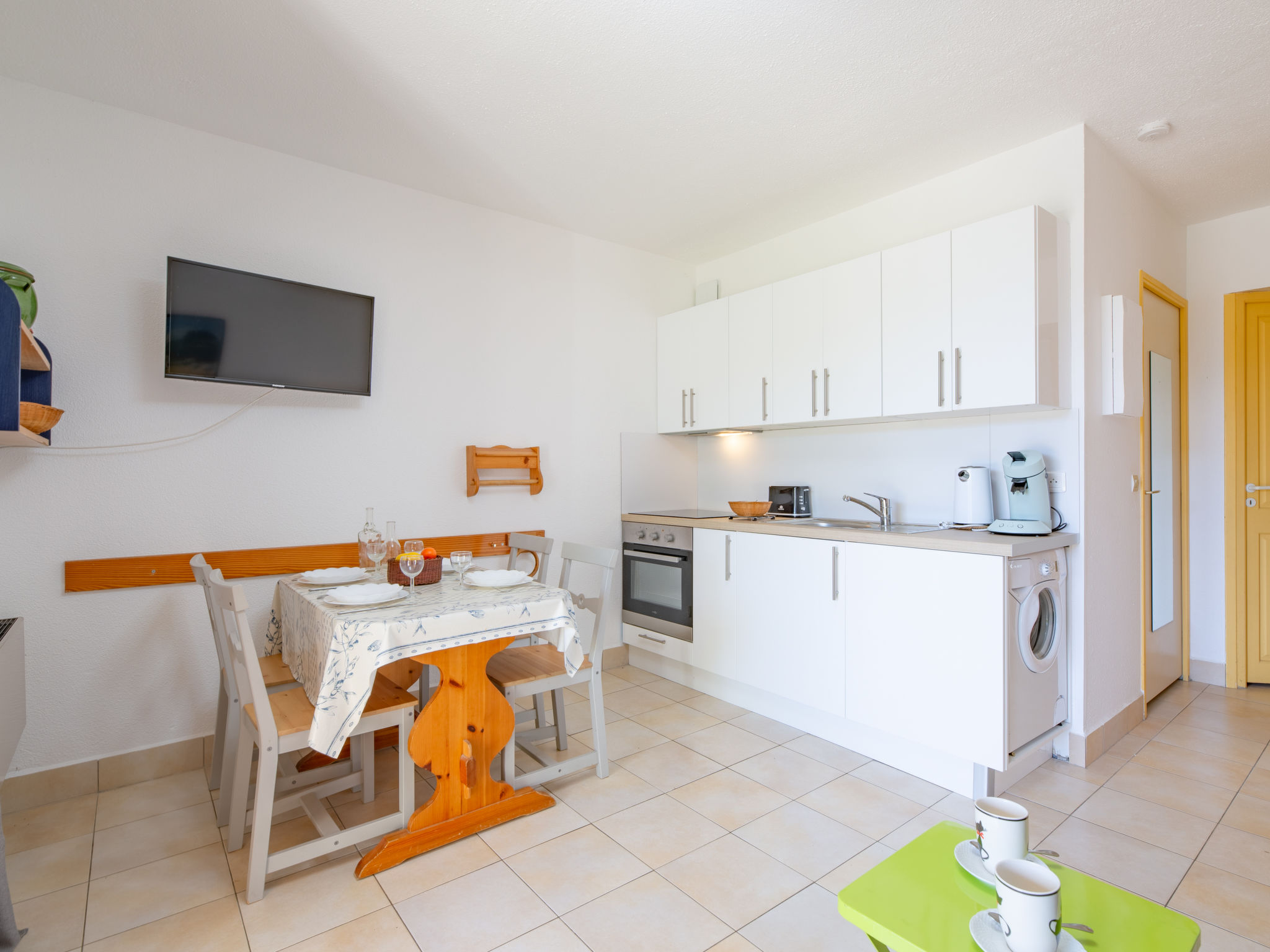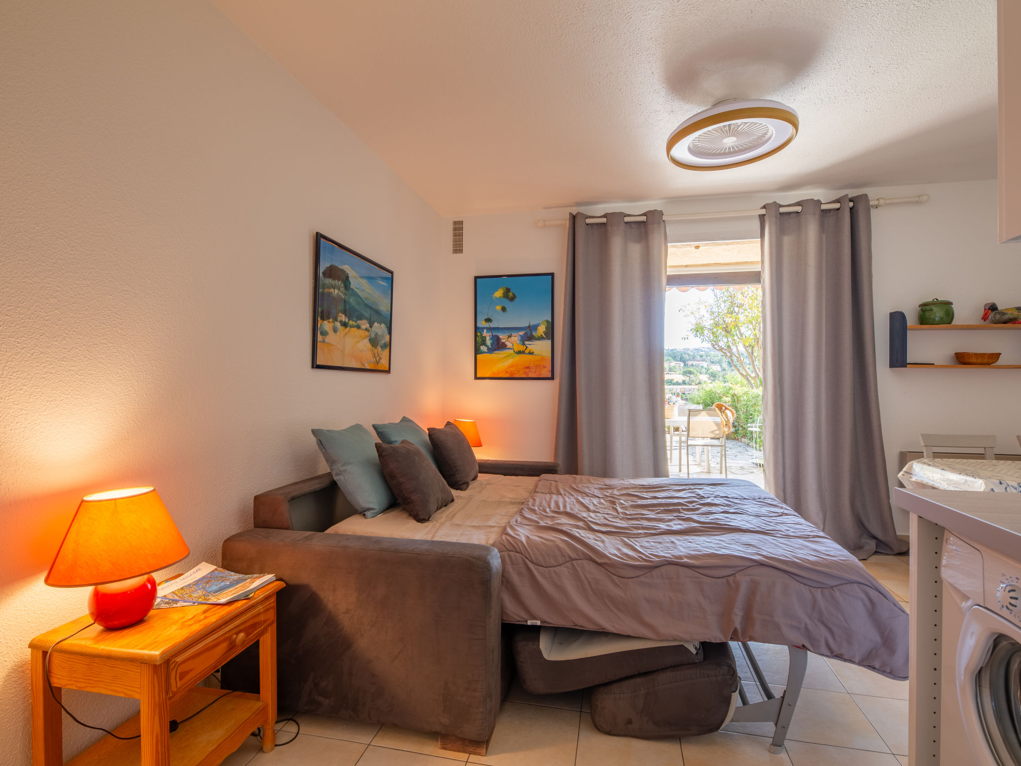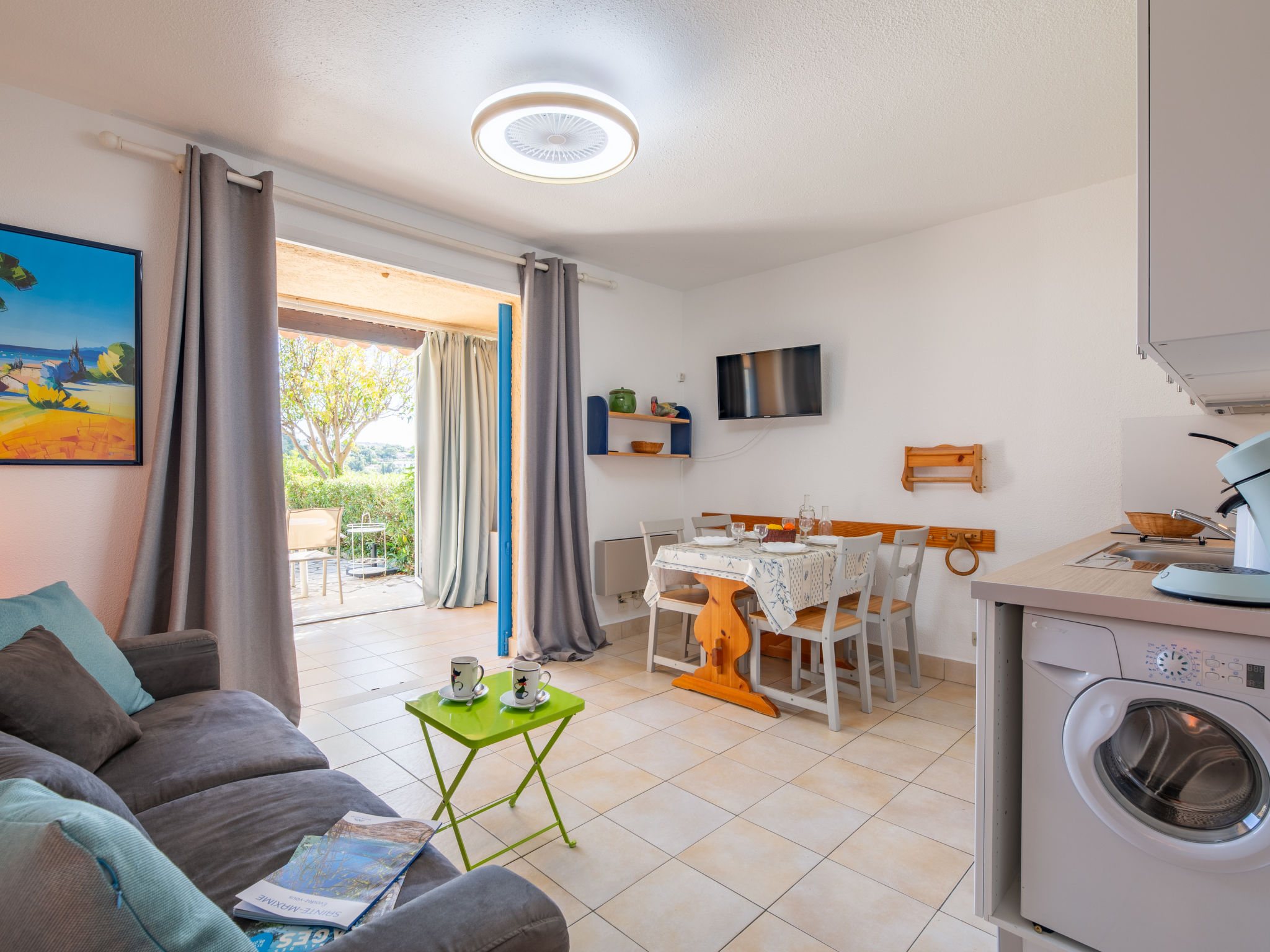 1-Zimmer-Wohnung 36 m2, im Erdgeschoss. Einfach und zweckmässig eingerichtet: Wohn-/Esszimmer mit 1 Doppeldiwanbett (140 cm, Länge 190 cm), TV. Ausgang zur Terrasse. Kabine mit 1 x 2 Etagenbetten (80 cm, Länge 190 cm). Kochnische (4 Kochplatten, Backofen, Toaster, Wasserkocher, Mikrowelle, elektrische Kaffeemaschine). Bad, sep. WC. E-Heizung. Grosse Terrasse 40 m2, Südlage. Terrassenmöbel. Sicht auf das Meer. Zur Verfügung: Waschmaschine. Internet (Wireless LAN, extra). Parkplatz. Bitte beachten: Nichtraucher-Unterkunft. Maximal 1 Haustier/Hund erlaubt. Rauchmelder. Die Wohnung ist über Treppen und einen Fussweg erreichbar. Inserat einer Privatperson nach Artikel 155, IV, CGI. 83107000188UE