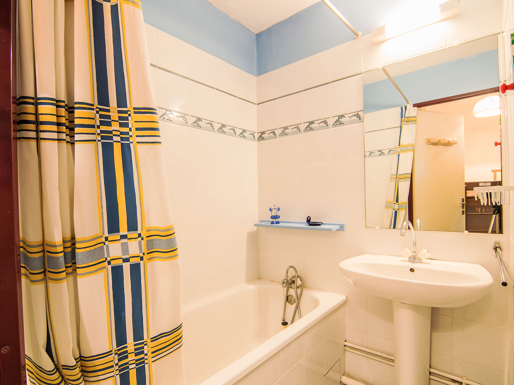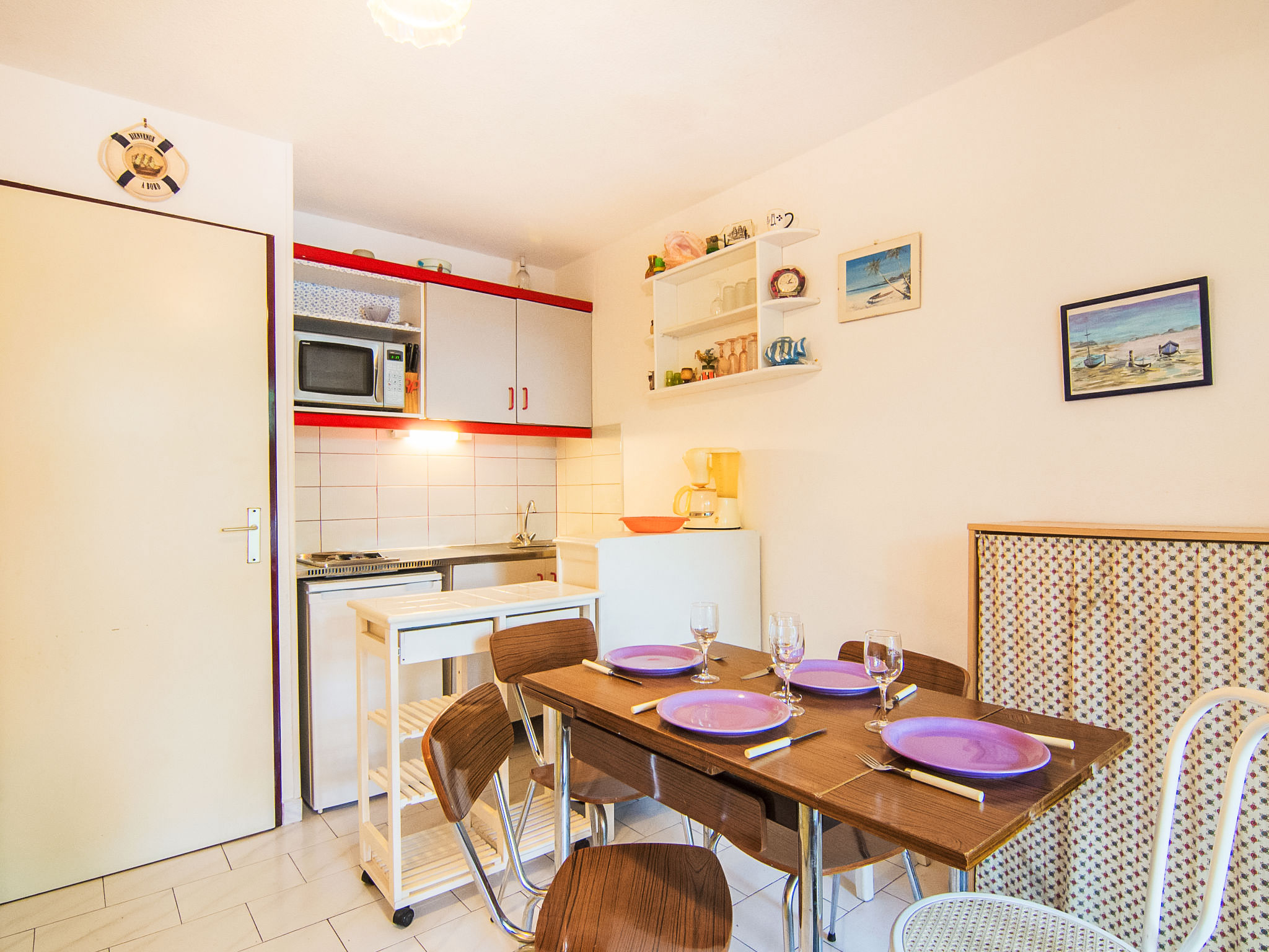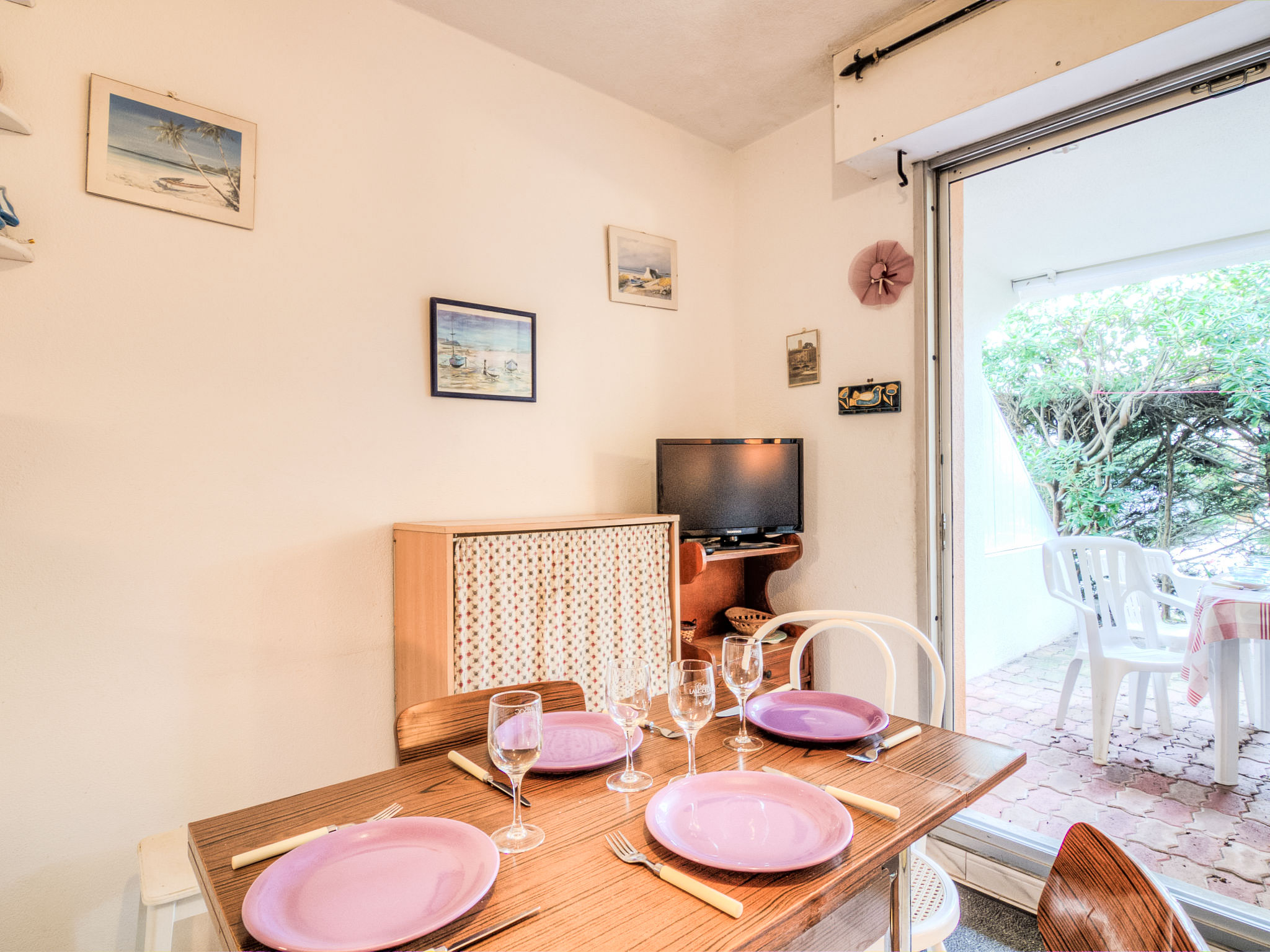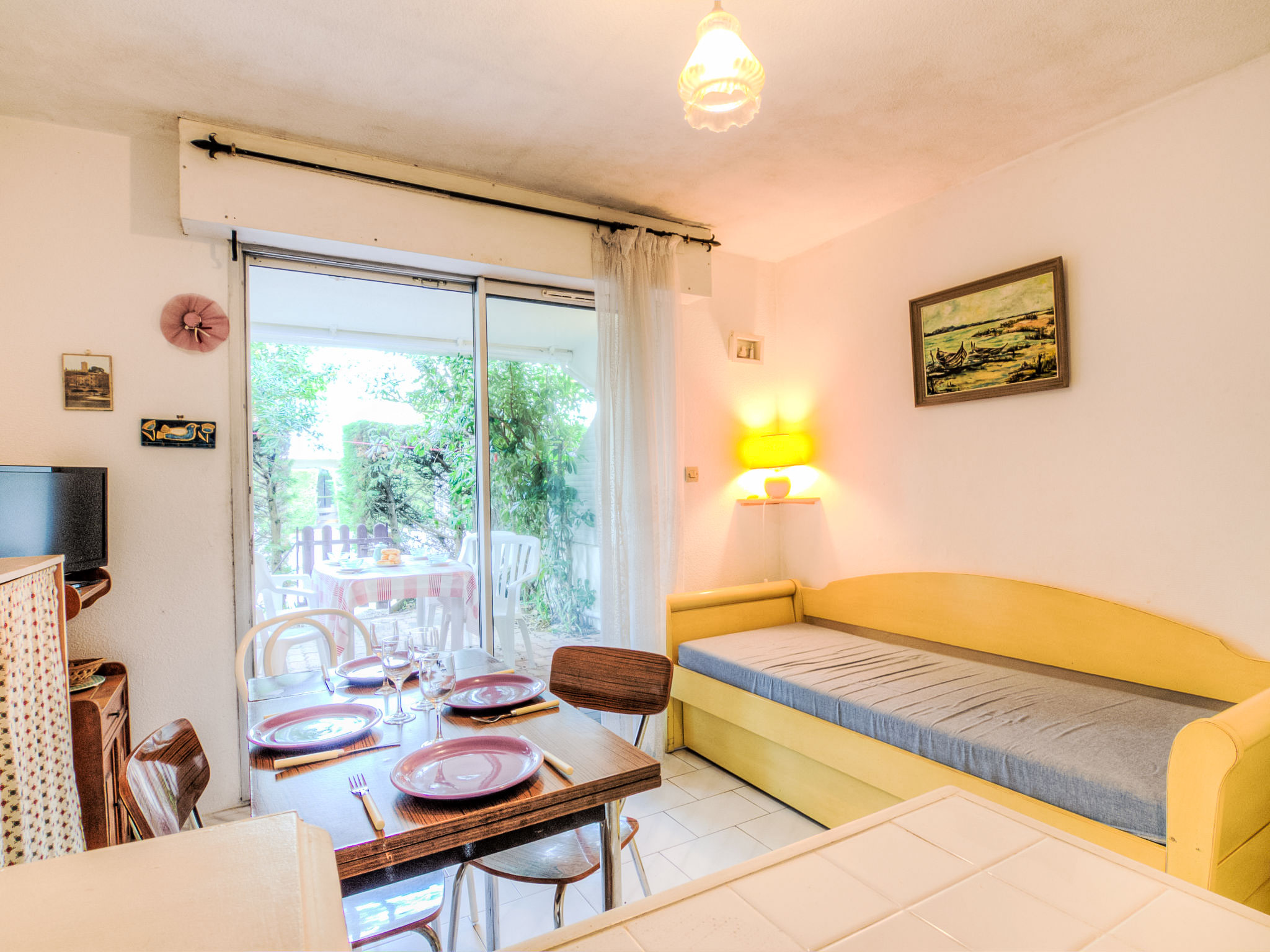 1-Zimmer-Studio 20 m2, im Erdgeschoss. Wohn-/Esszimmer mit 1 Doppeldiwanbett (2 x 80 cm, Länge 190 cm), TV (Flachbildschirm). Eingang mit 1 x 2 Etagenbetten (90 cm, Länge 190 cm). Kochnische (2 Kochplatten, Toaster, Wasserkocher, Mikrowelle, elektrische Kaffeemaschine). Bad/WC. Terrasse 12 m2. Terrassenmöbel. Zur Verfügung: Internet (Wireless LAN, extra). Parkplatz. Bitte beachten: Wohnung auf Parkplatzseite. Rauchmelder. Inserat einer Privatperson nach Artikel 155, IV, CGI.