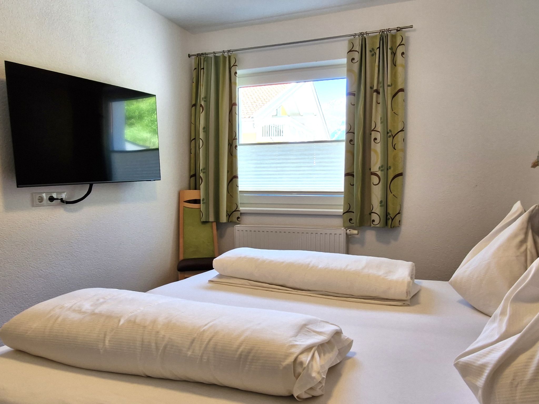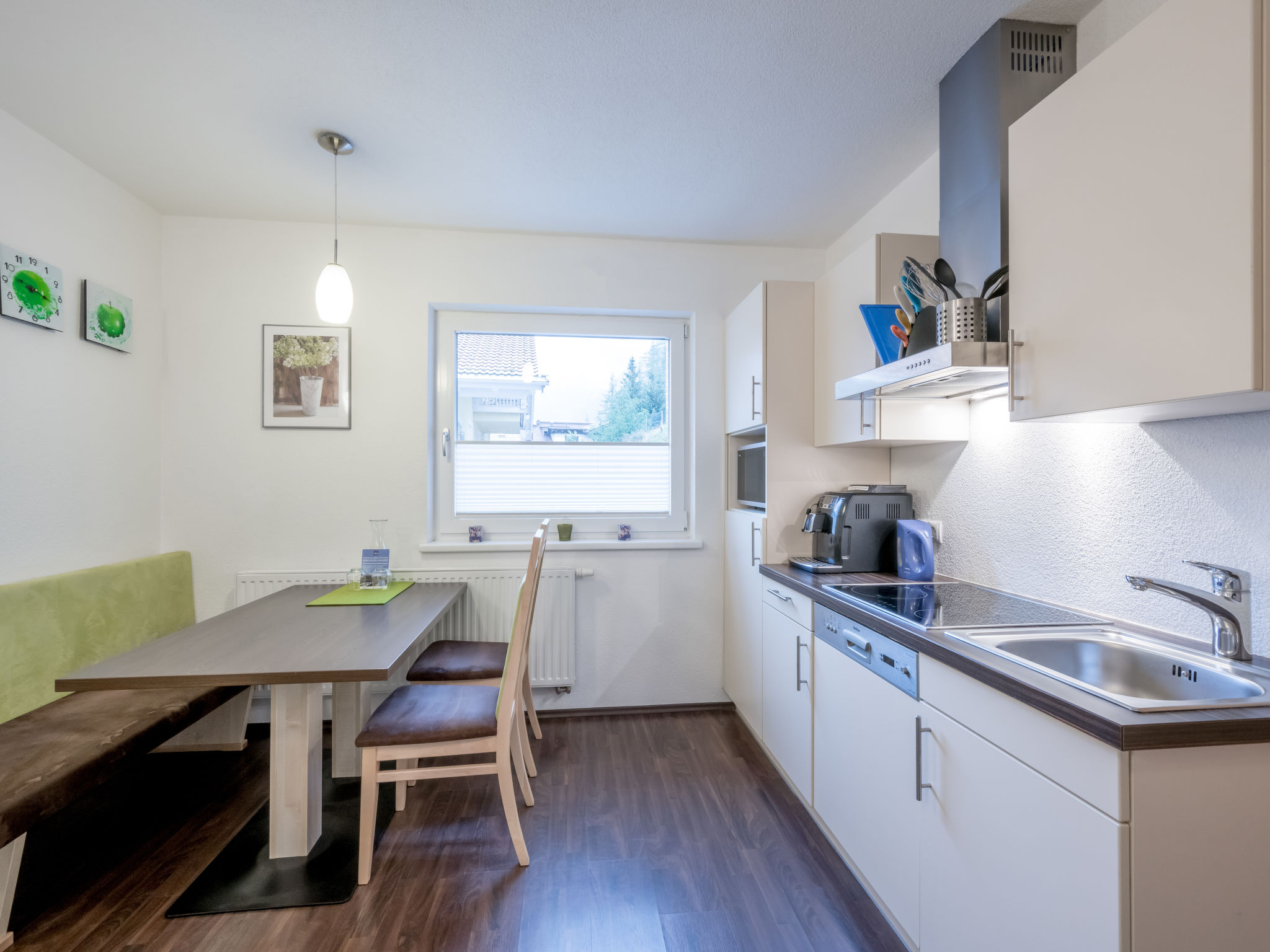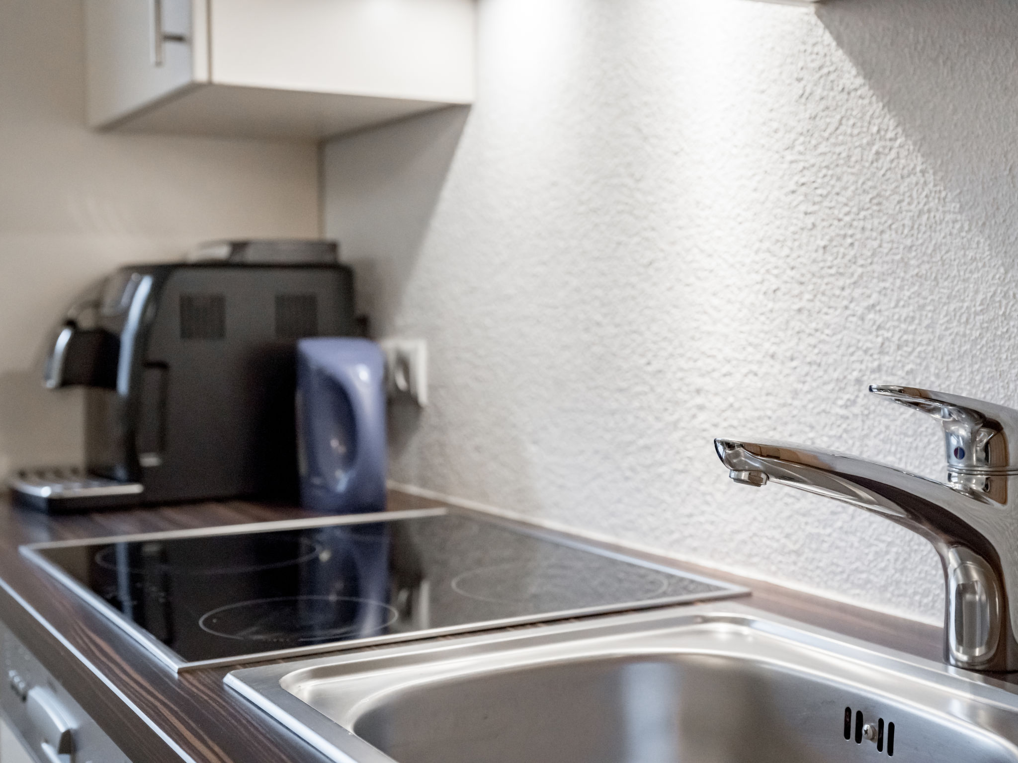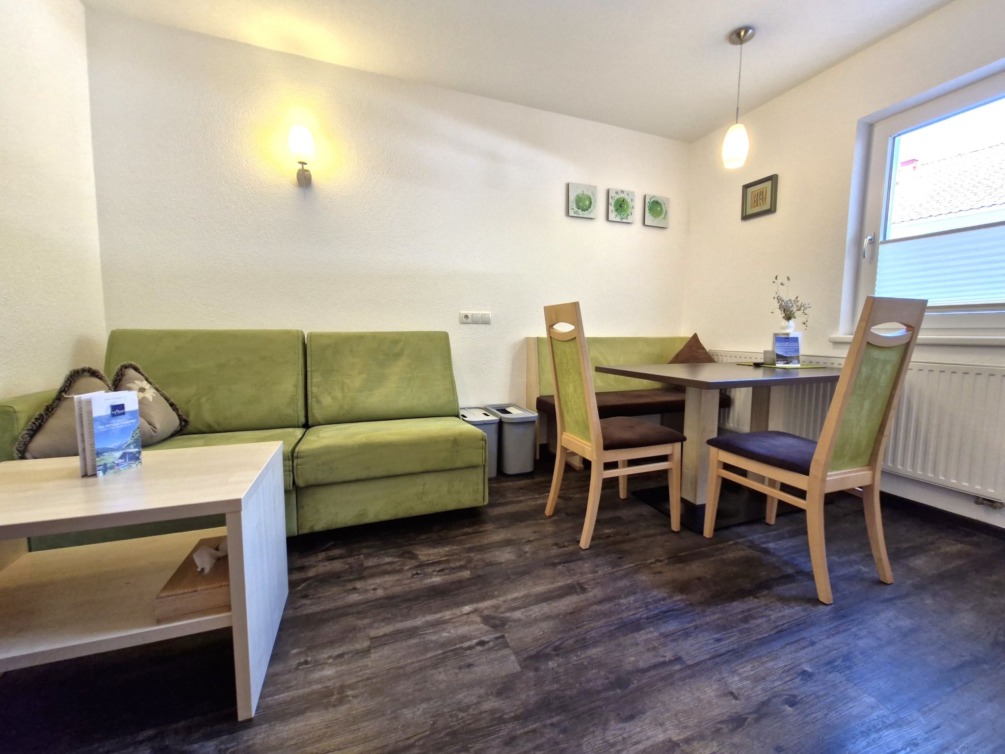 2-Zimmer-Wohnung, Erdgeschoss, ca. 27 m². Kleine Wohnküche (4 Ceranfelder, Mikrowelle, Geschirrspüler, Kühlschrank, Kaffeemaschine, Wasserkocher) mit Essplatz und Bettcouch. Doppelzimmer. Dusche/WC. Bei Belegung mit weniger Personen als der maximalen Personenzahl stehen nicht alle Wohneinheiten zur Verfügung.