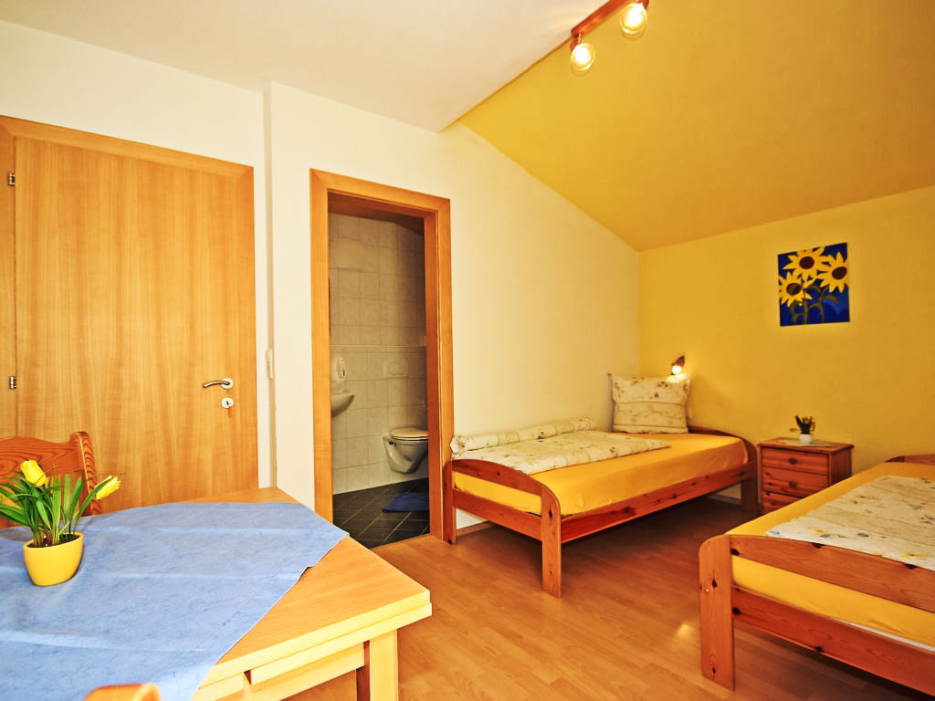 5-Zimmer-Wohnung 140 m2, im Obergeschoss. Geschmackvoll und gemütlich eingerichtet: Eingang. 2 Doppelzimmer, jedes Zimmer mit Dusche/WC und Sat-TV (Flachbildschirm). Ausgang zum Balkon. 2 Zimmer, jedes Zimmer mit 1 Bett, 1 Doppelbett, Dusche/WC und Sat-TV (Flachbildschirm). Ausgang zum Balkon. Grosse Wohnküche (Backofen, Geschirrspüler, 4 Glaskeramikherd Platten, Wasserkocher, Mikrowelle, Tiefkühler, elektrische Kaffeemaschine) mit Esstisch, Sat-TV (Flachbildschirm). 2 grosse Balkone, grosser Gartensitzplatz 200 m2. Terrassenmöbel. Schöne Sicht auf die Berge und die Landschaft. Zur Verfügung: Waschmaschine, Kinderhochstuhl. Internet (Wireless LAN, gratis). Die Wohnung ist ideal für Allergiker, da keine Teppiche vorhanden sind.