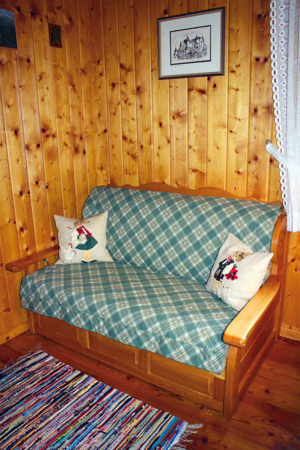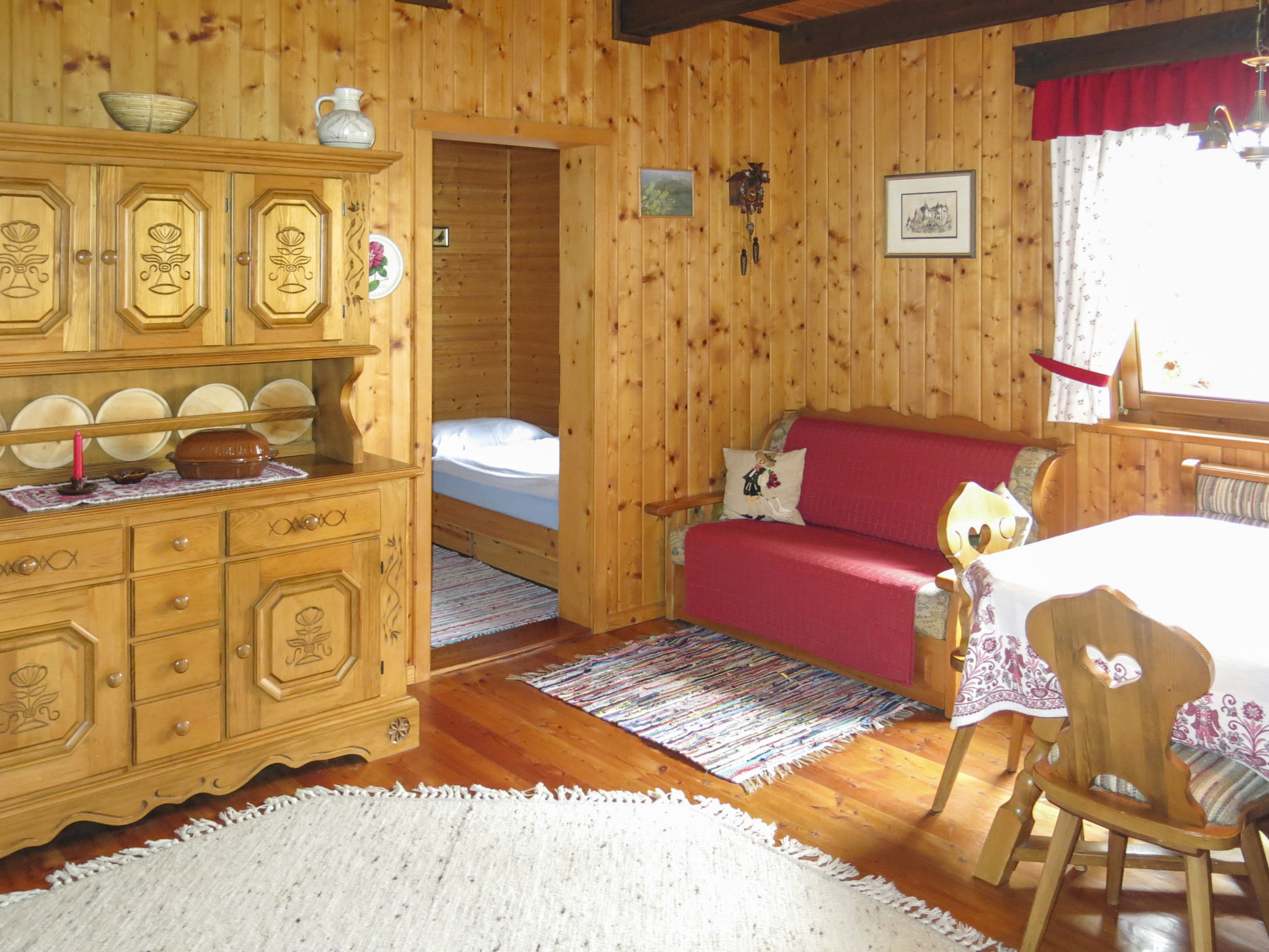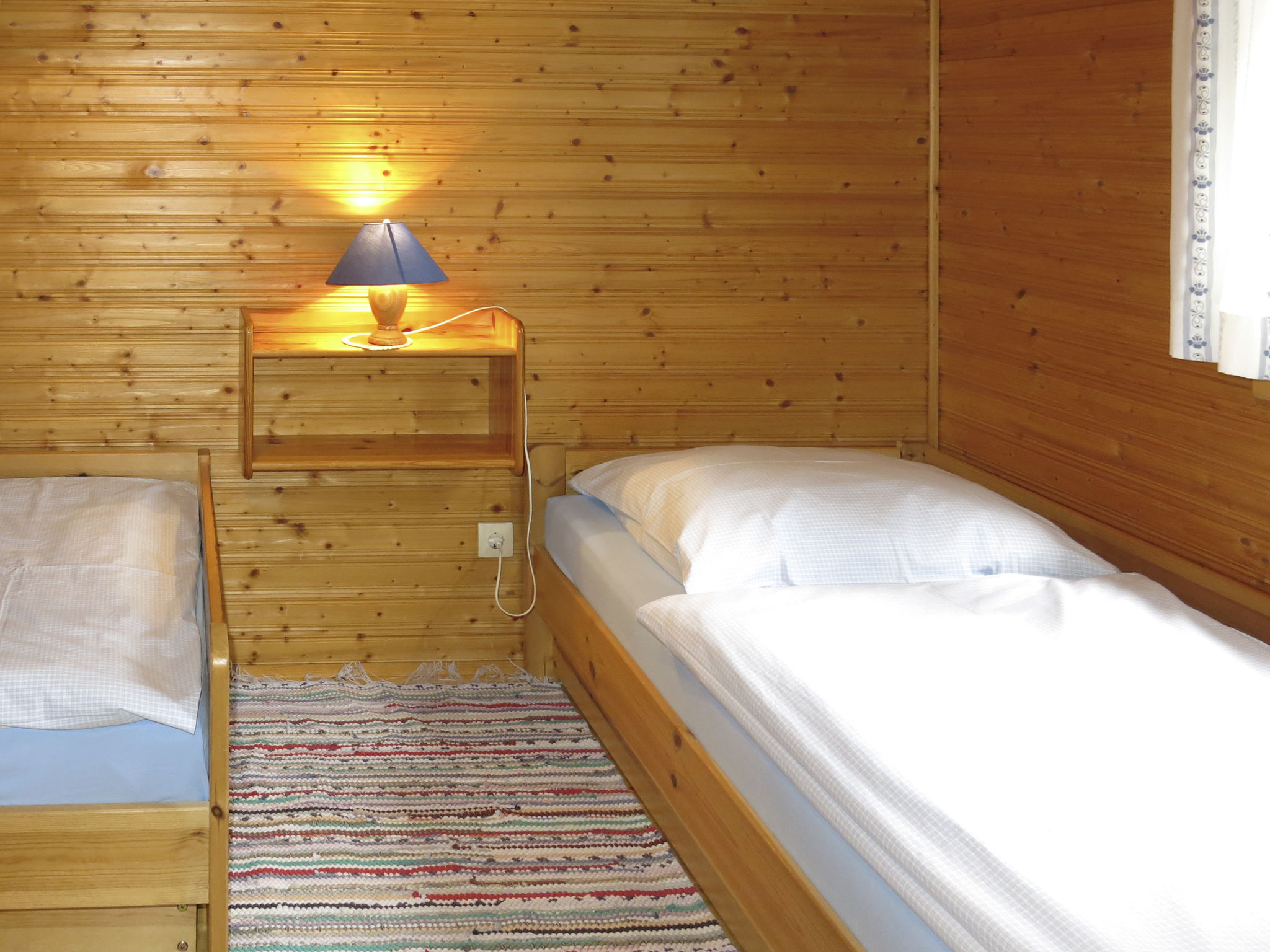 2-Zimmer-Haus, ca. 55 m². Wohnraum mit Sitzcouch, gemütlichem Essplatz mit Eckbank, Küchenzeile (2 Ceranfelder, Backofen, Kühlschrank, Wasserkocher, Toaster, Kaffeekapselmaschine inklusive Kapseln). Zweibettzimmer. Dusche/WC. 1-Zimmer-Hütte, ca. 12 m². Wohn-/Schlafraum mit Bettcouch, Etagenbett und Ausziehbett.