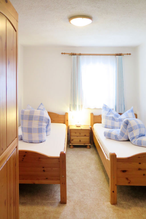 4-Zimmer-Wohnung, 3. Etage (mit Dachschräge), ca. 65 m². Flur mit Garderobe. Wohnküche (4 Platten, Backofen, Kühlschrank, Kaffeemaschine, Wasserkocher, Toaster) mit Essplatz, Balkonausgang. Doppelzimmer mit Balkonausgang. Doppelzimmer. Zweibettzimmer. Dusche/WC. Bei Belegung mit weniger Personen als der maximalen Personenzahl stehen nicht alle Wohneinheiten zur Verfügung.