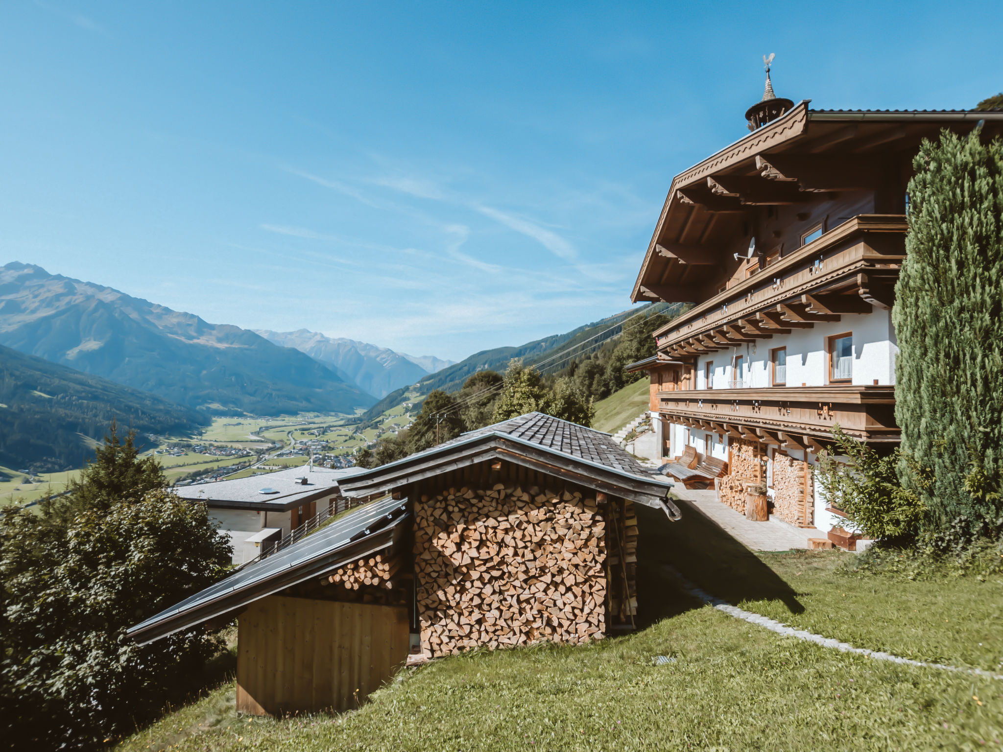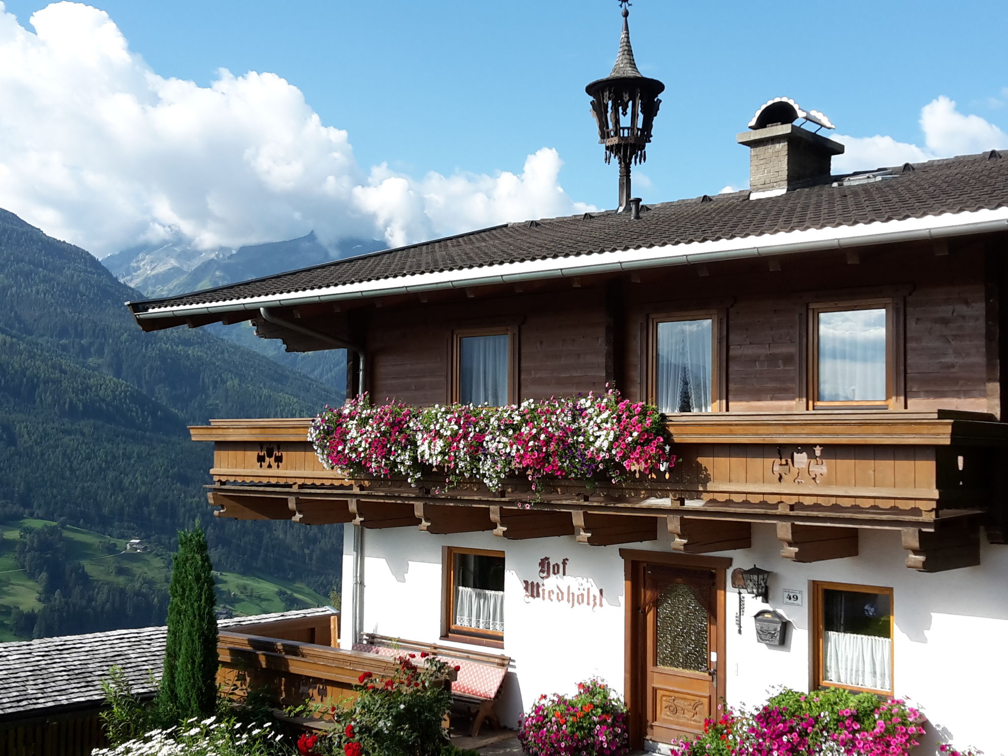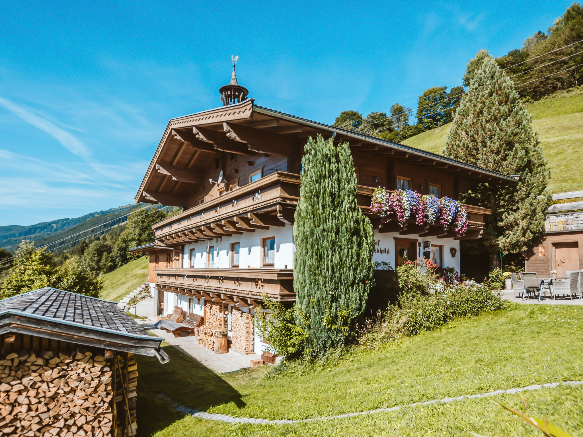 Haus WIEDHÖLZL mit 2 Ferienwohnungen, steht in sonniger Hanglage oberhalb von Bramberg, mit schöner Aussicht auf die Hohen Tauern. Ortsmitte Bramberg 3 km. Dort Einkaufsmöglichkeiten. Hollersbach 10 km. Beim Haus beginnen schöne Wanderwege. Zur Wohnung BMG 141 gehört eine Garage, weitere Parkplätze am Haus. Brötchenservice. Die Wohnung BMG 141 hat einen privaten Freisitz, BMG 142 mit Balkon. Garten mit Sonnenliegen, Sonnenschirm und Grill zur gemeinsamen Nutzung. Kinderspielplatz. Gemütliche, rustikale Einrichtung. In den Schlafzimmern teils Holzböden, Wand- und Deckenvertäfelungen. Jeweils Sat-TV. Internetzugang (WLAN, inklusive). Holz-Zentralheizung. Hinweise: Ein Zimmer im Erdgeschoss bleibt verschlossen. Rauchen ist in den Wohnungen nicht gestattet. Winter-Infos: Gondelbahn ins Skigebiet Wildkogel/Neukirchen und zur längsten Rodelbahn Europas (täglich bis 22 Uhr beleuchtet) 4 km. Einstieg ins Skigebiet Resterhöhe/Pass Thurn mit Anschluss an das Kitzbüheler Skigebiet 6,5 km. Loipe 4,5 km. Im Haus Ski- und Schuhabstellmöglichkeit im Heizraum.