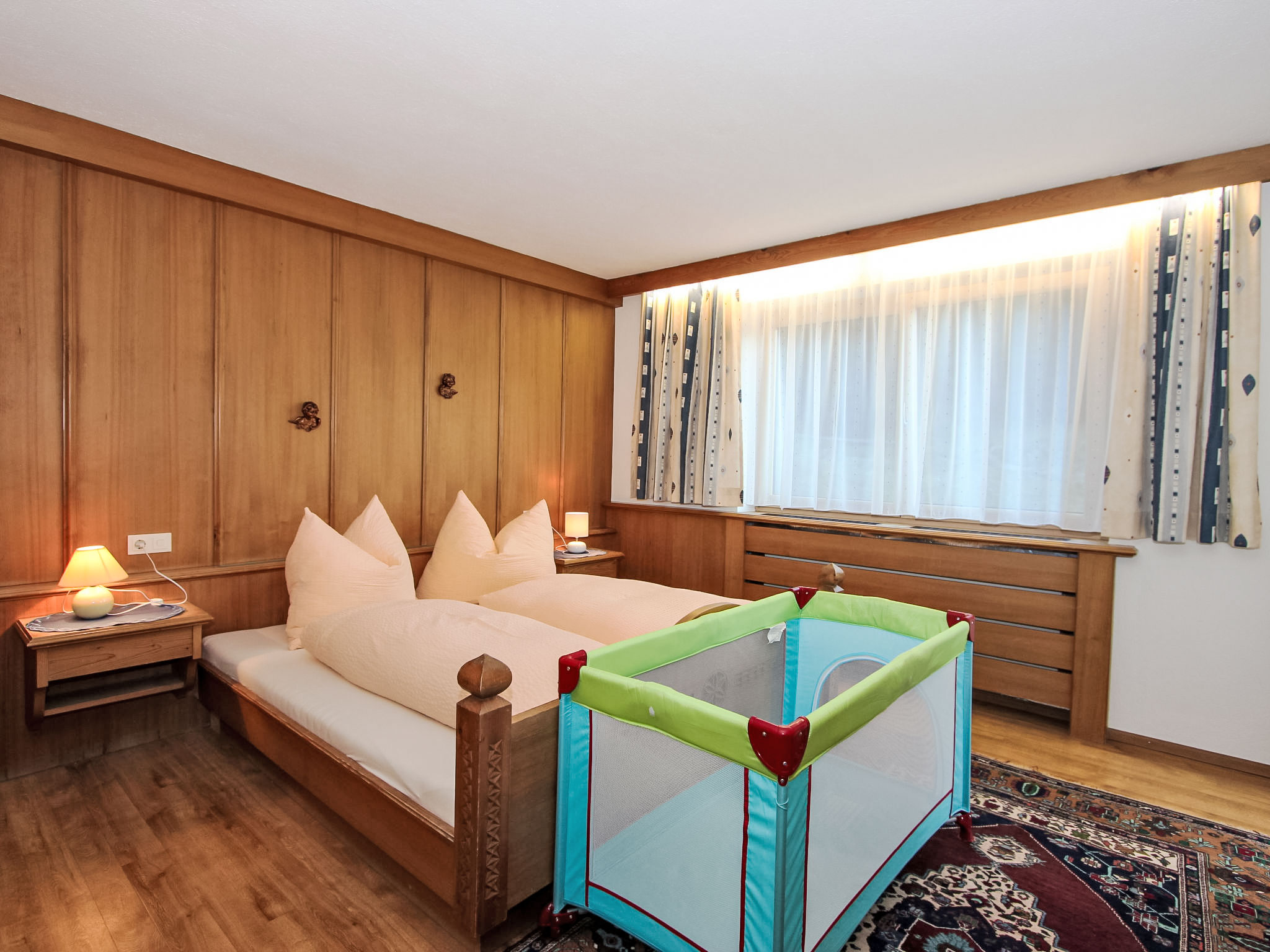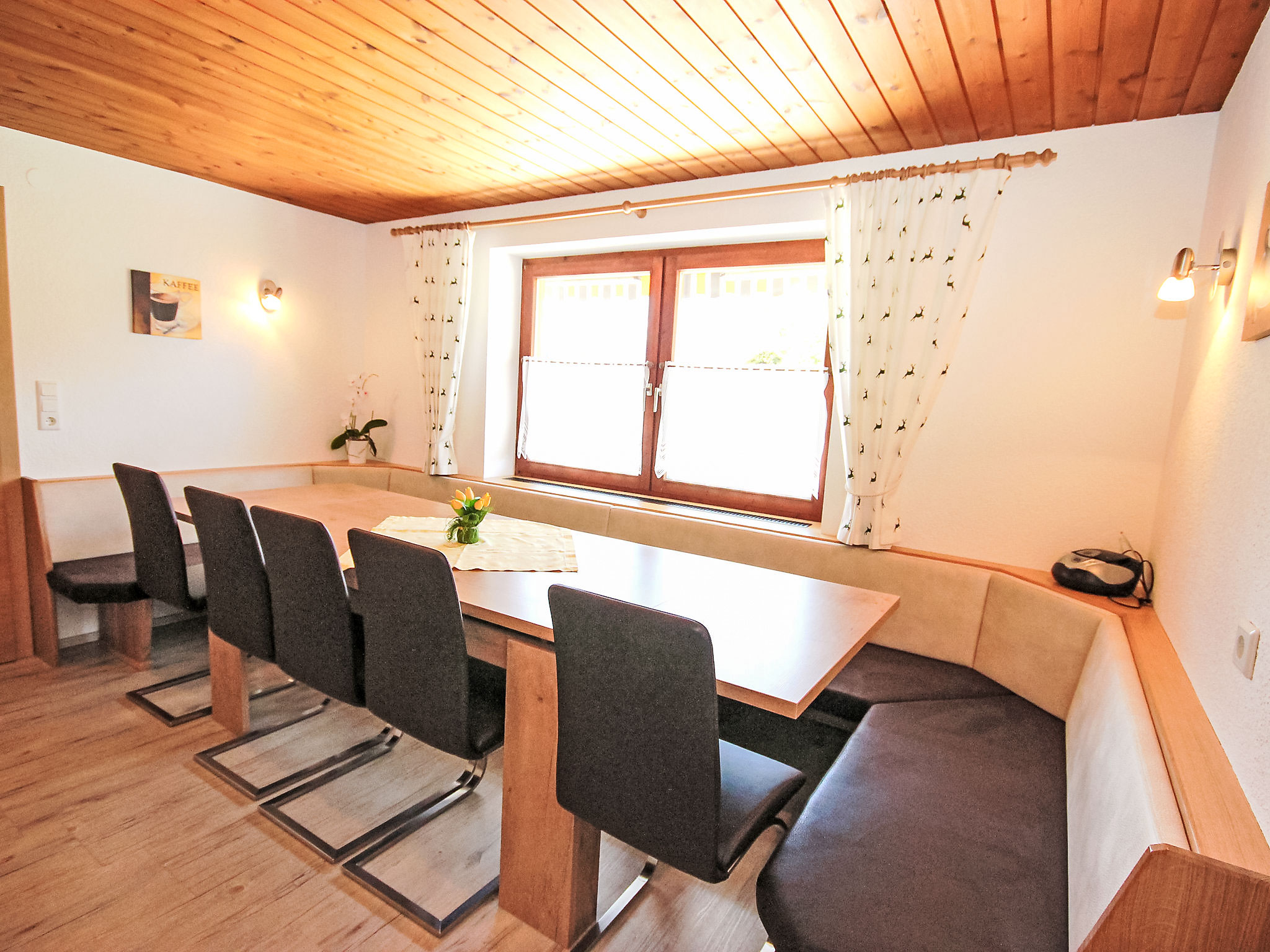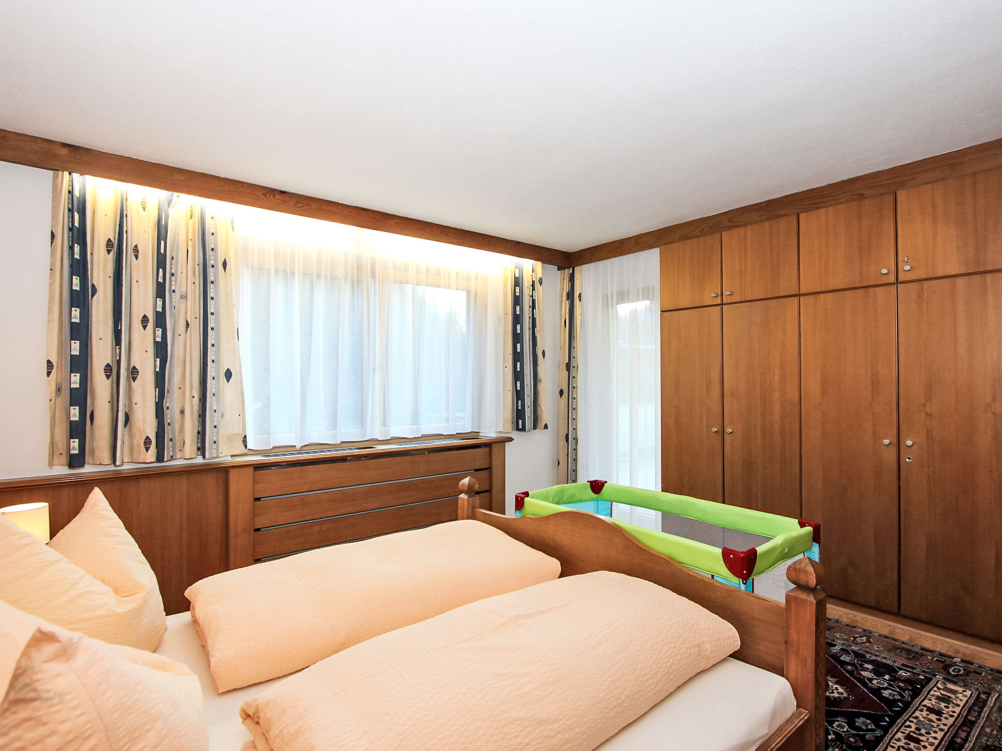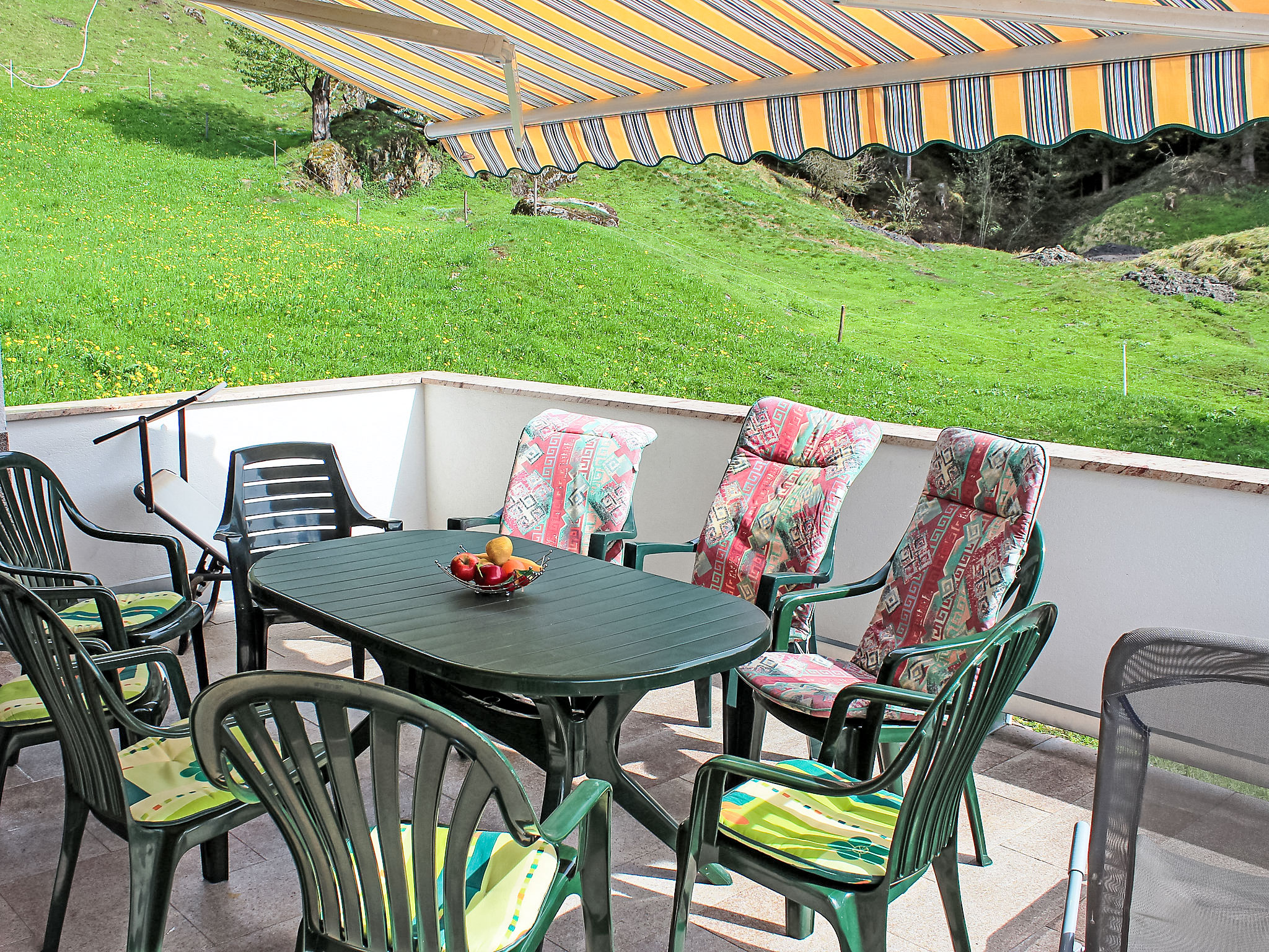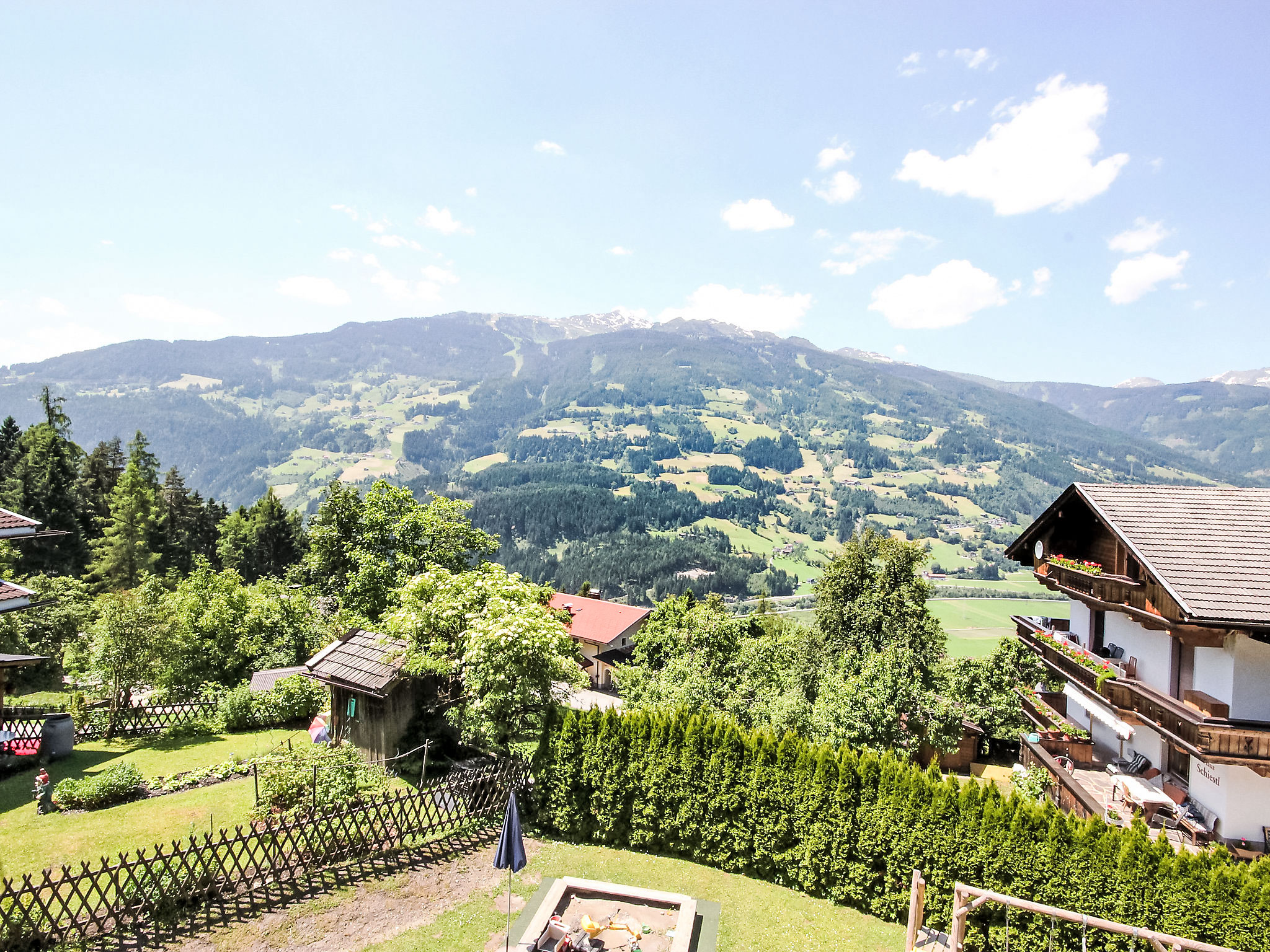 8-Zimmer-Haus 210 m2 auf 3 Stockwerken. Komfortabel und geschmackvoll eingerichtet: Eingang. Ausgang zum Garten. 2 Zimmer, jedes Zimmer mit 1 Doppelbett und 1 Ausziehbett (1 Pers.). Grosse Wohnküche (Backofen, Geschirrspüler, 4 Glaskeramikherd Platten) mit Esstisch, Radio und CD. Dusche/WC, sep. WC. Obergeschoss: Eingang. Wohnzimmer mit 2 Diwanbetten und Sat-TV (Flachbildschirm). Ausgang zum Garten, zum Balkon, zur Terrasse. 1 Doppelzimmer. Ausgang zum Garten, zur Terrasse. Wohnküche (Backofen, Geschirrspüler, 4 Glaskeramikherd Platten, Mikrowelle) mit Esstisch, 1 Diwanbett, Radio und CD. Bad, sep. WC. 2. Obergeschoss: 3 Zimmer, jedes Zimmer mit 1 Doppelbett und 1 Ausziehbett (1 Pers.), Waschbecken. Ausgang zum Balkon. 1 kleines Zimmer mit 1 x 2 Etagenbetten. 2 Duschen, 2 sep. WC's. Das Wohnzimmer ist eine Bauernstube. 2 grosse Balkone, Terrasse. Terrassenmöbel, Liegestühle (5). Herrliche Panoramasicht auf die Berge, das Tal und die Landschaft. Zur Verfügung: Kinderhochstuhl. Internet (Wireless LAN, gratis). Bitte beachten: Nichtraucher-Unterkunft. Schöner Grillplatz vorhanden.