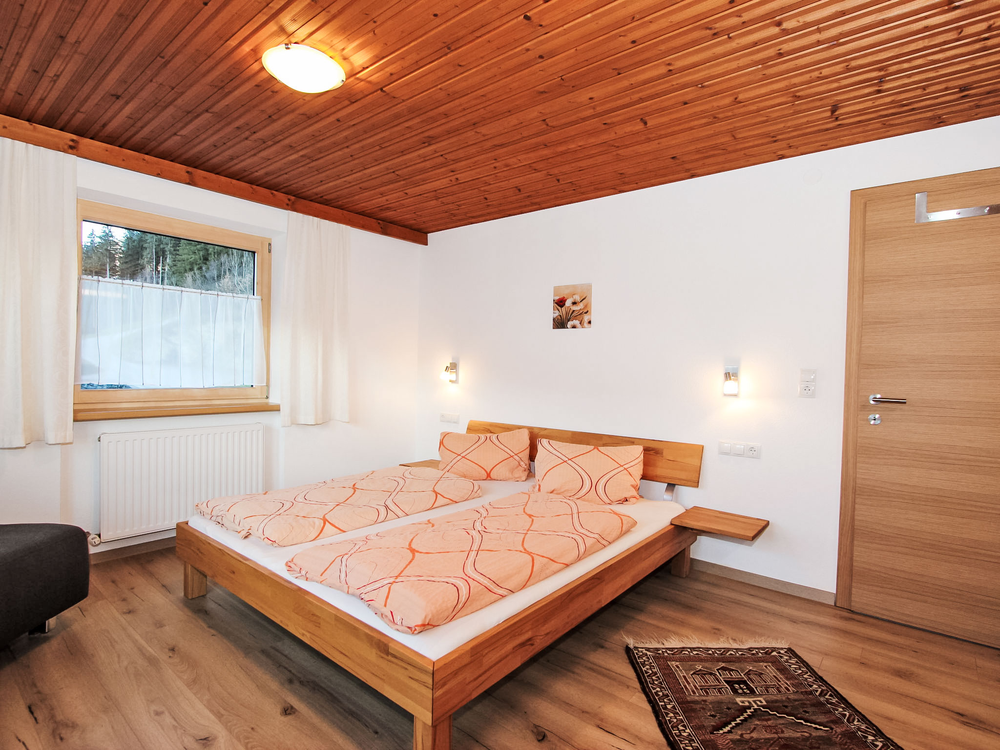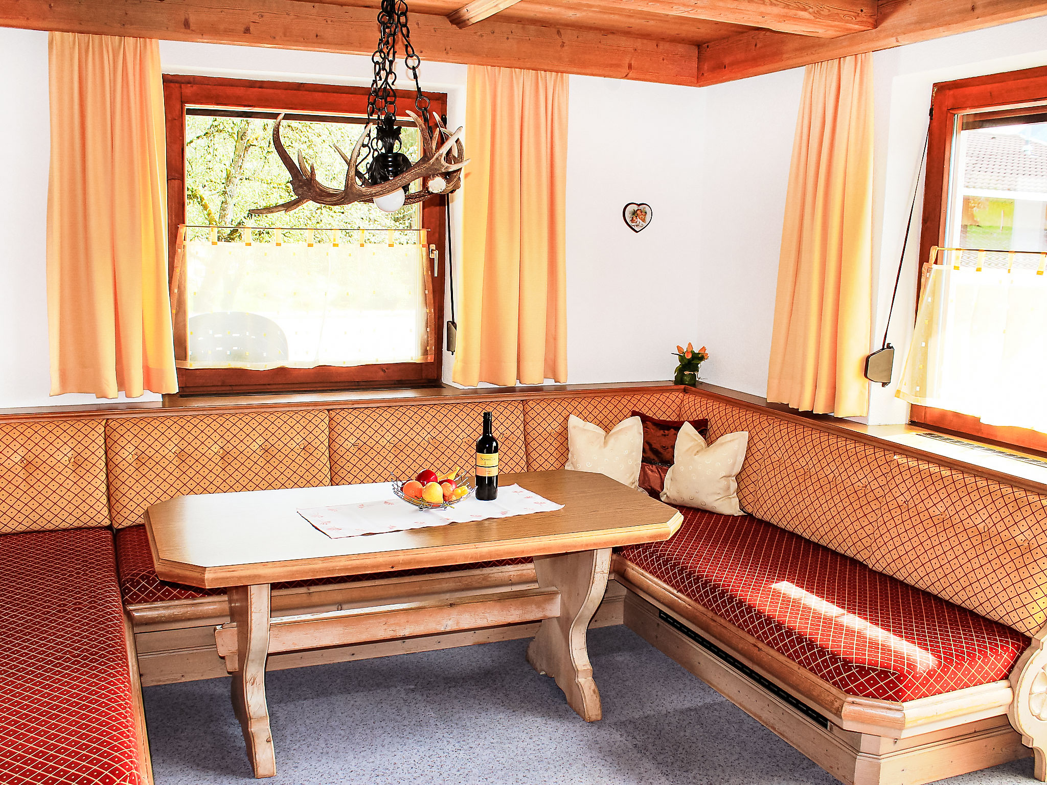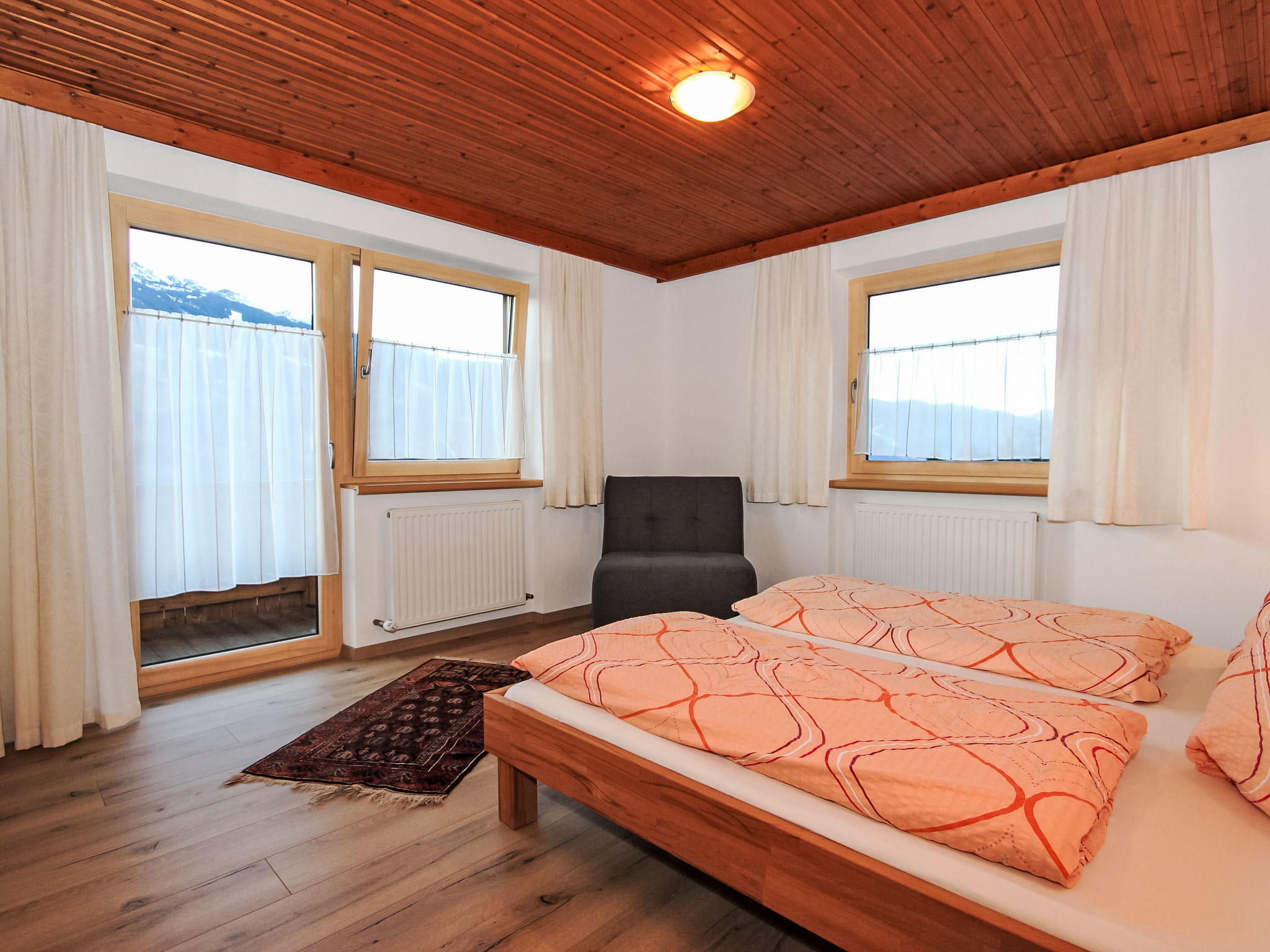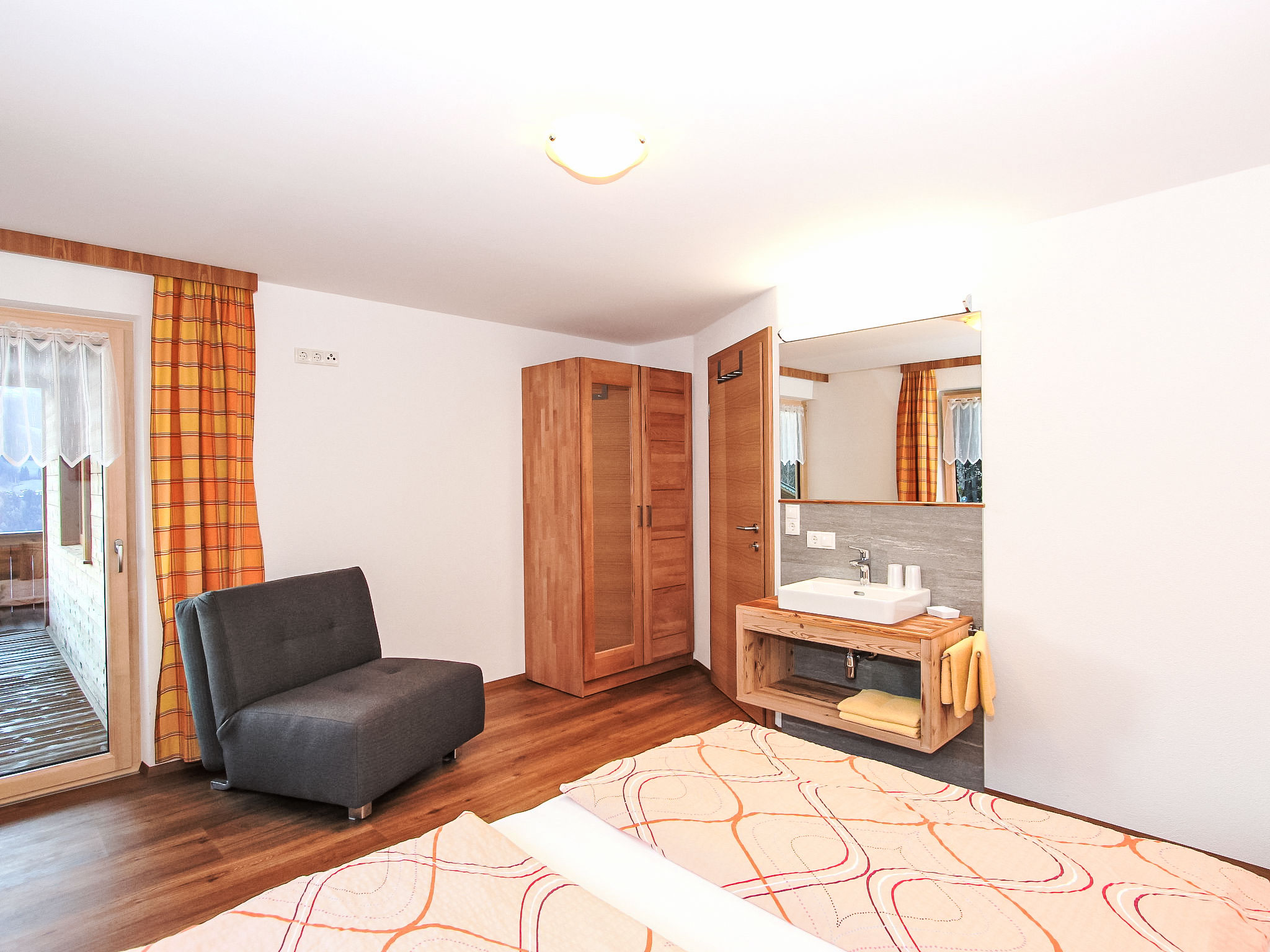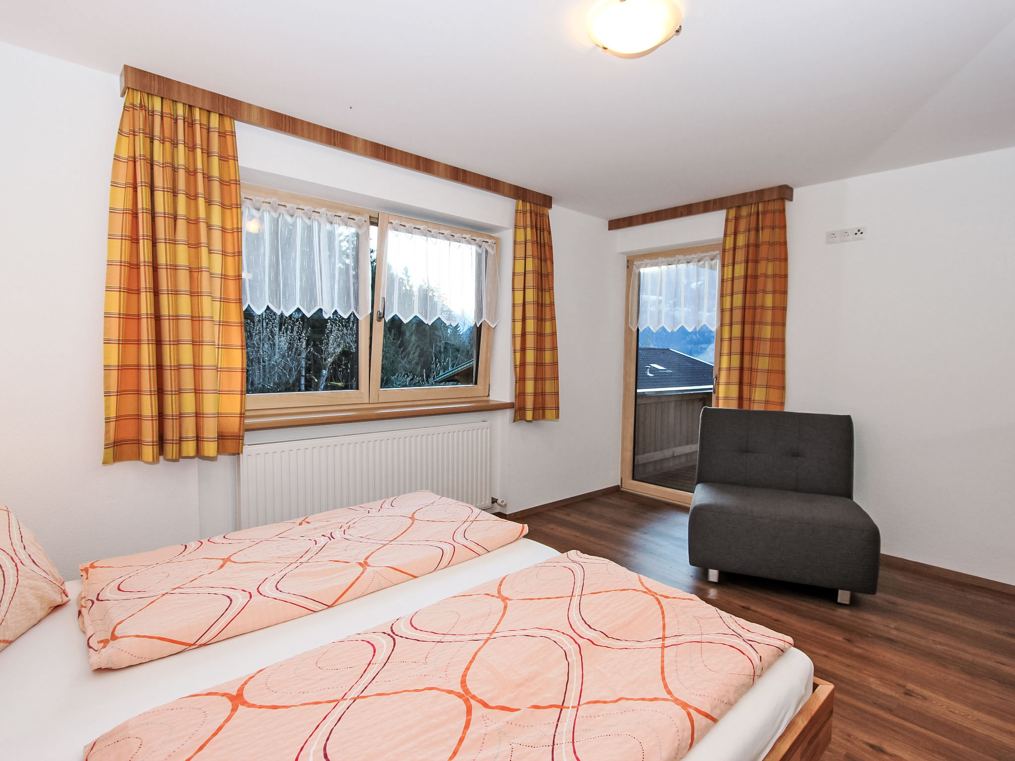 8-Zimmer-Haus 210 m2 auf 3 Stockwerken. Komfortabel und geschmackvoll eingerichtet: Eingang. Ausgang zum Garten. 2 Zimmer, jedes Zimmer mit 1 Doppelbett und 1 Ausziehbett (1 Pers.). Grosse Wohnküche (Backofen, Geschirrspüler, 4 Glaskeramikherd Platten) mit Esstisch, Radio und CD. Dusche/WC, sep. WC. Obergeschoss: Eingang. Wohnzimmer mit 2 Diwanbetten und Sat-TV (Flachbildschirm). Ausgang zum Garten, zum Balkon, zur Terrasse. 1 Doppelzimmer. Ausgang zum Garten, zur Terrasse. Wohnküche (Backofen, Geschirrspüler, 4 Glaskeramikherd Platten, Mikrowelle) mit Esstisch, 1 Diwanbett, Radio und CD. Bad, sep. WC. 2. Obergeschoss: 3 Zimmer, jedes Zimmer mit 1 Doppelbett und 1 Ausziehbett (1 Pers.), Waschbecken. Ausgang zum Balkon. 1 kleines Zimmer mit 1 x 2 Etagenbetten. 2 Duschen, 2 sep. WC's. Das Wohnzimmer ist eine Bauernstube. 2 grosse Balkone, Terrasse. Terrassenmöbel, Liegestühle (5). Herrliche Panoramasicht auf die Berge, das Tal und die Landschaft. Zur Verfügung: Kinderhochstuhl. Internet (Wireless LAN, gratis). Bitte beachten: Nichtraucher-Unterkunft. Schöner Grillplatz vorhanden.