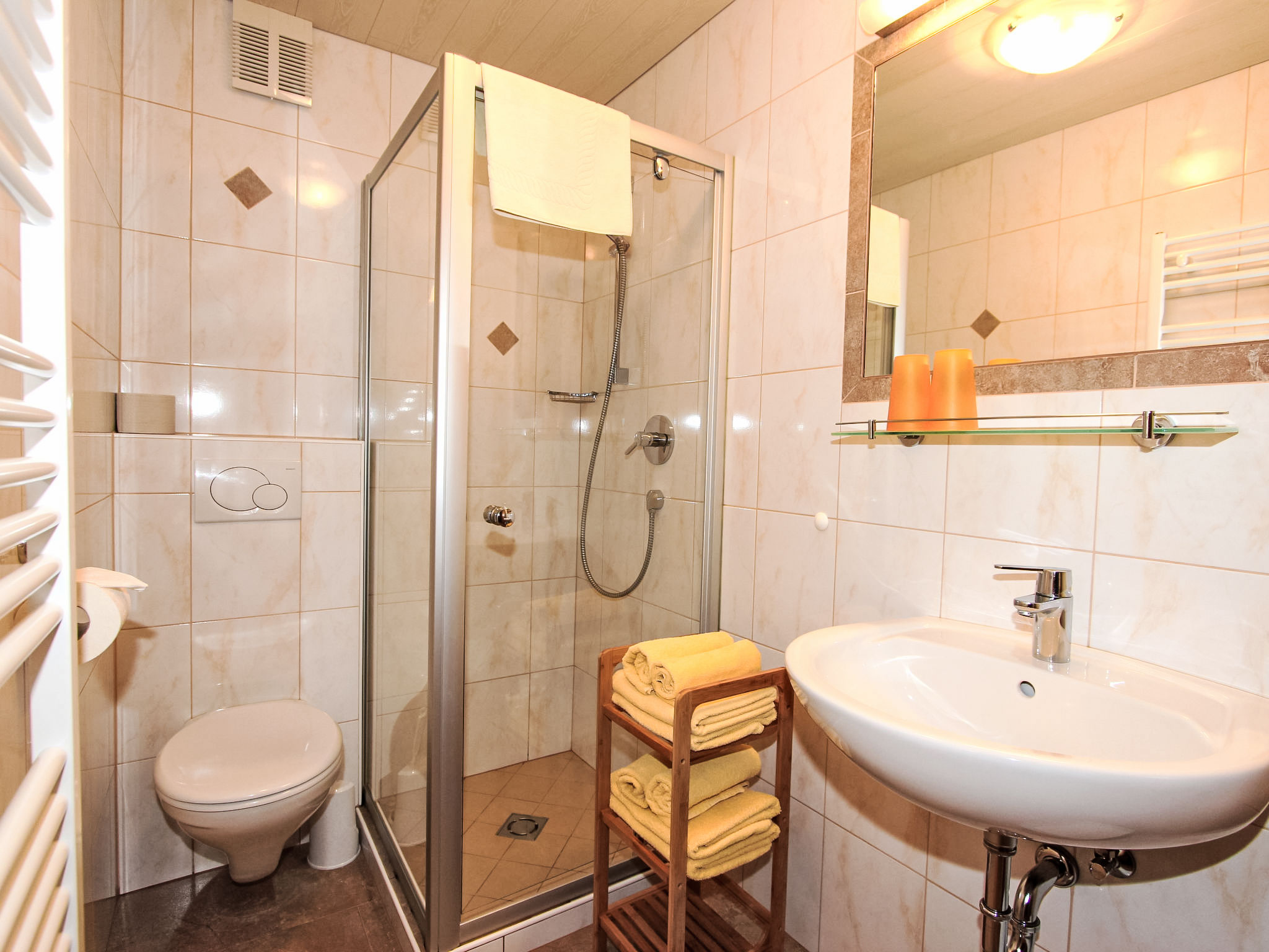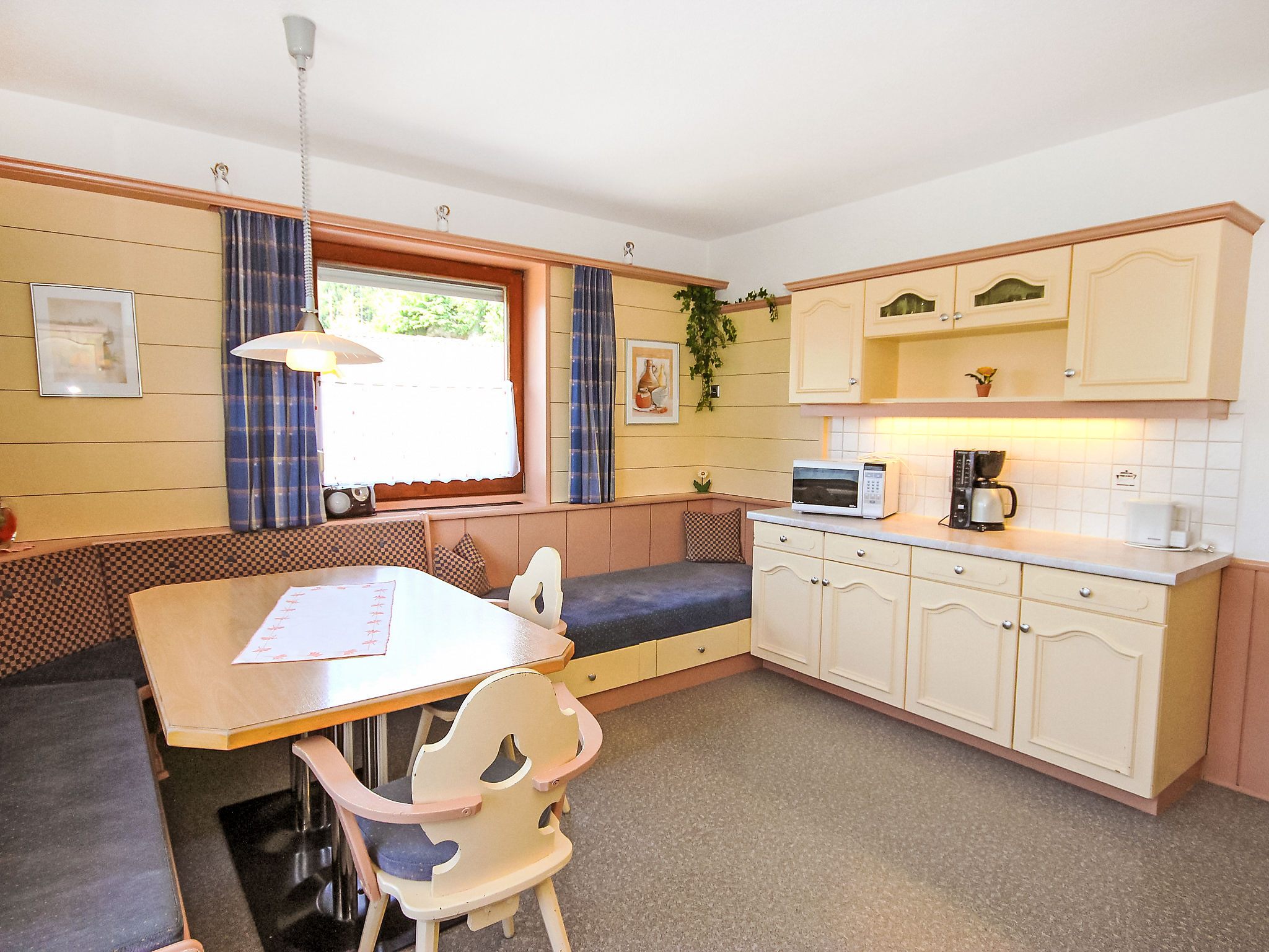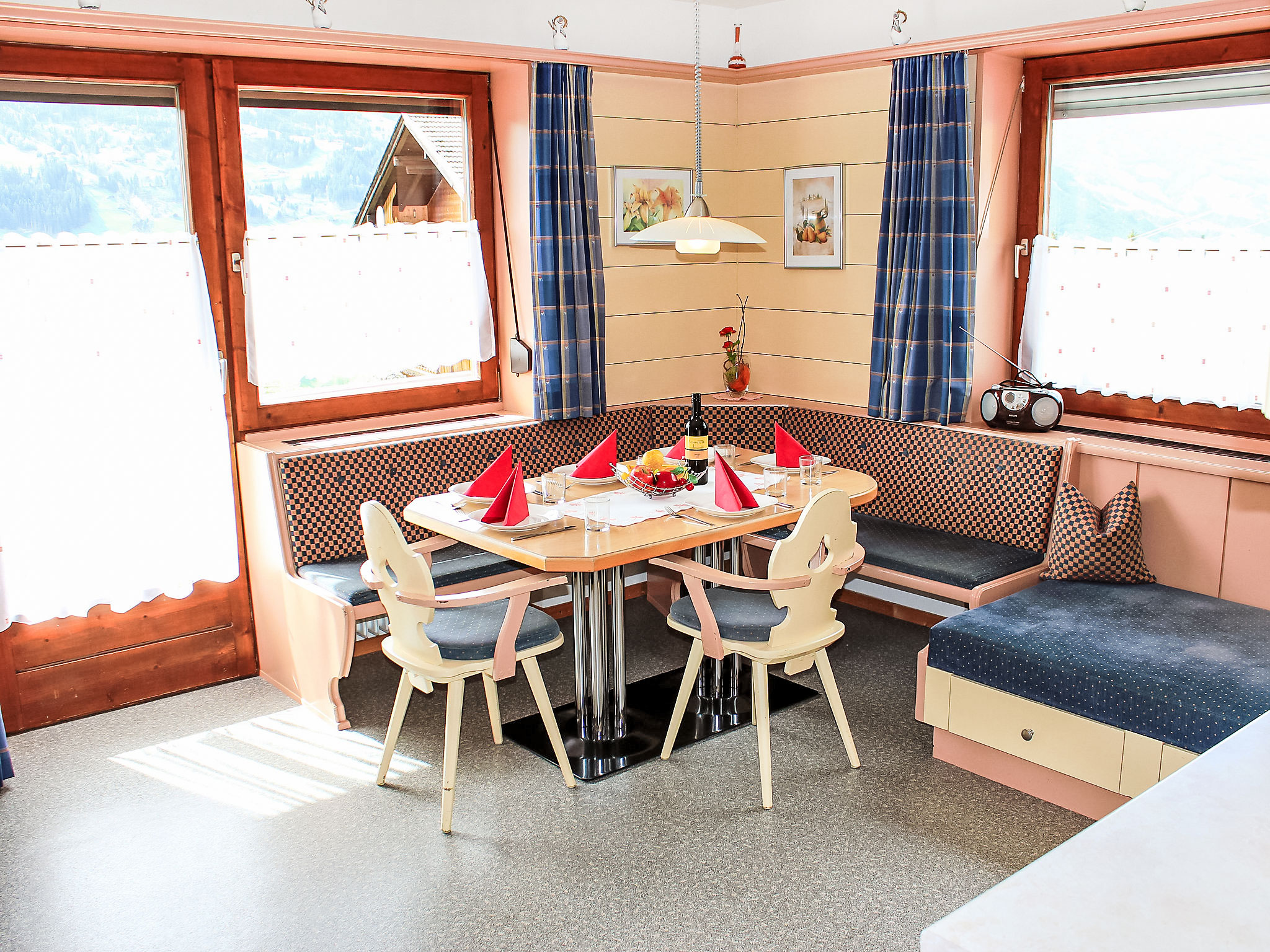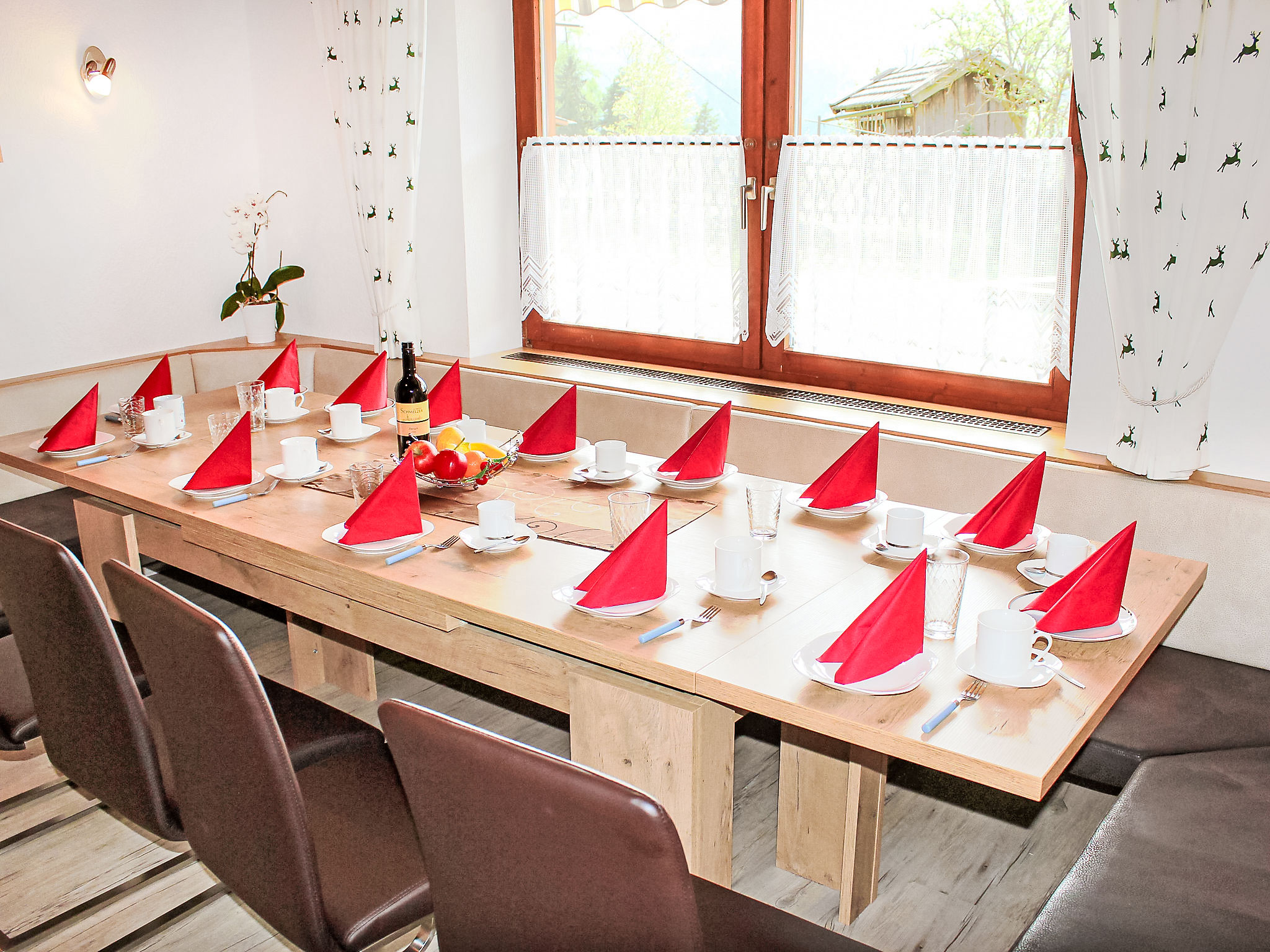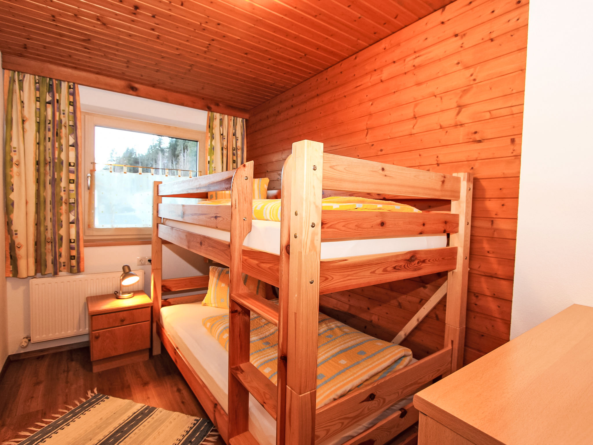 8-Zimmer-Haus 210 m2 auf 3 Stockwerken. Komfortabel und geschmackvoll eingerichtet: Eingang. Ausgang zum Garten. 2 Zimmer, jedes Zimmer mit 1 Doppelbett und 1 Ausziehbett (1 Pers.). Grosse Wohnküche (Backofen, Geschirrspüler, 4 Glaskeramikherd Platten) mit Esstisch, Radio und CD. Dusche/WC, sep. WC. Obergeschoss: Eingang. Wohnzimmer mit 2 Diwanbetten und Sat-TV (Flachbildschirm). Ausgang zum Garten, zum Balkon, zur Terrasse. 1 Doppelzimmer. Ausgang zum Garten, zur Terrasse. Wohnküche (Backofen, Geschirrspüler, 4 Glaskeramikherd Platten, Mikrowelle) mit Esstisch, 1 Diwanbett, Radio und CD. Bad, sep. WC. 2. Obergeschoss: 3 Zimmer, jedes Zimmer mit 1 Doppelbett und 1 Ausziehbett (1 Pers.), Waschbecken. Ausgang zum Balkon. 1 kleines Zimmer mit 1 x 2 Etagenbetten. 2 Duschen, 2 sep. WC's. Das Wohnzimmer ist eine Bauernstube. 2 grosse Balkone, Terrasse. Terrassenmöbel, Liegestühle (5). Herrliche Panoramasicht auf die Berge, das Tal und die Landschaft. Zur Verfügung: Kinderhochstuhl. Internet (Wireless LAN, gratis). Bitte beachten: Nichtraucher-Unterkunft. Schöner Grillplatz vorhanden.