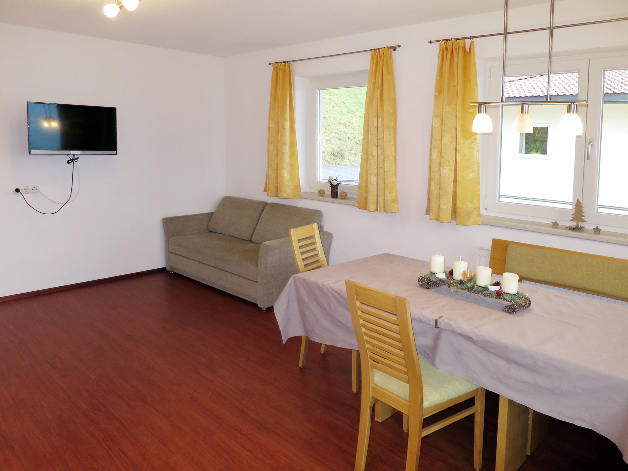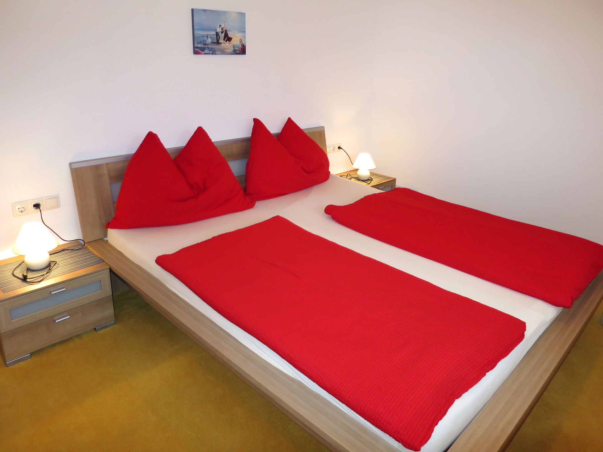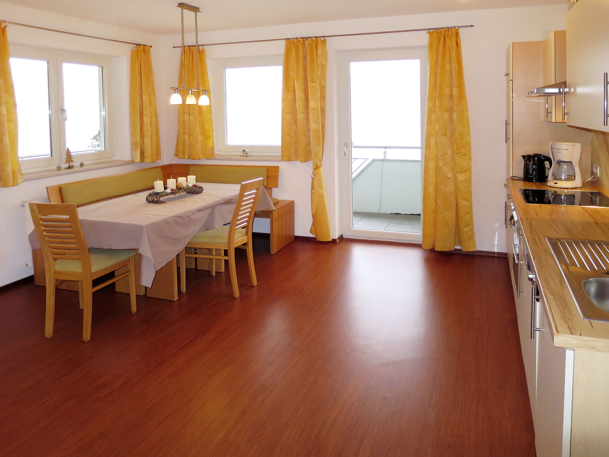 3-Zimmer-Wohnung, 2. Etage, ca. 70 m². Wohn-/Schlafraum mit Doppelbettcouch (ca. 1,80 m breit), Essplatz (Eckbank), offene Küche (4 Ceranfelder, Backofen, Mikrowelle, Geschirrspüler, Kühlschrank, Kaffeemaschine, Wasserkocher), Balkonausgang. 2 Doppelzimmer. Dusche. Sep.WC.