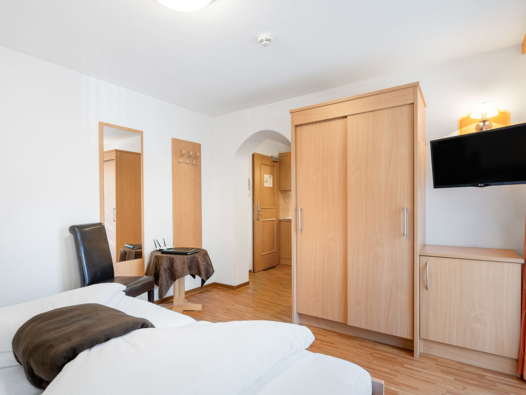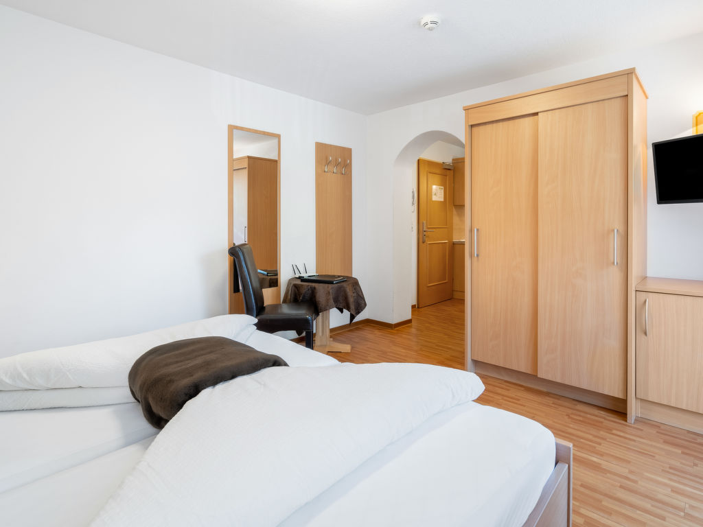 1-Zimmer-Wohnung, 2. Etage oder Dachgeschoss, ca. 23 m². Kochdiele (2 Ceranfelder, Mikrowelle/Grill, Kühlschrank, Kaffeemaschine, Wasserkocher, Toaster). Wohn-/Schlafraum mit Doppelbett, Essplatz und Balkonausgang. Dusche/WC. Nur kleine Hunde erlaubt!
