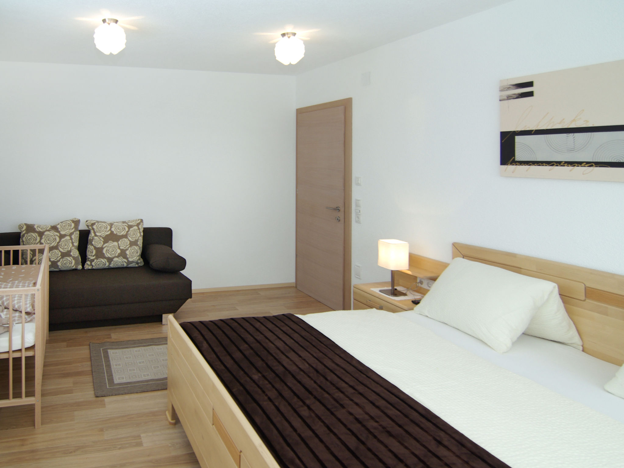 5-Zimmer-Wohnung, 2 Etagen, ca. 150 m². Erdgeschoss: Wohn-/Essraum mit Sitzcouch, offen zur Küche (4 Ceranfelder, Backofen, Mikrowelle, Geschirrspüler, Kühl-/Gefrierkombination, Kaffeemaschine, Wasserkocher, Toaster), Terrassenausgang. Abstellraum. Doppelzimmer mit Dusche/WC. Bad/WC. Vom Flur Treppe zur 1. Etage: Schlafzimmer mit Doppelbett und Bettcouch (ca. 1,80 x 2 m). Schlafzimmer mit Doppelbett, Bettcouch (ca. 1,80 x 2 m), Balkonausgang. Doppelzimmer mit Balkonausgang. 2x Dusche/WC. Bei Belegung mit weniger Personen als der maximalen Personenzahl stehen nicht alle Wohneinheiten zur Verfügung.