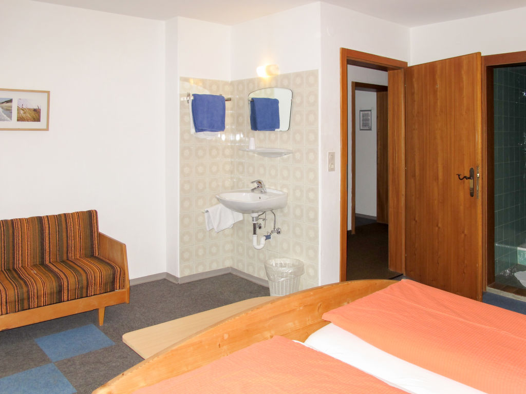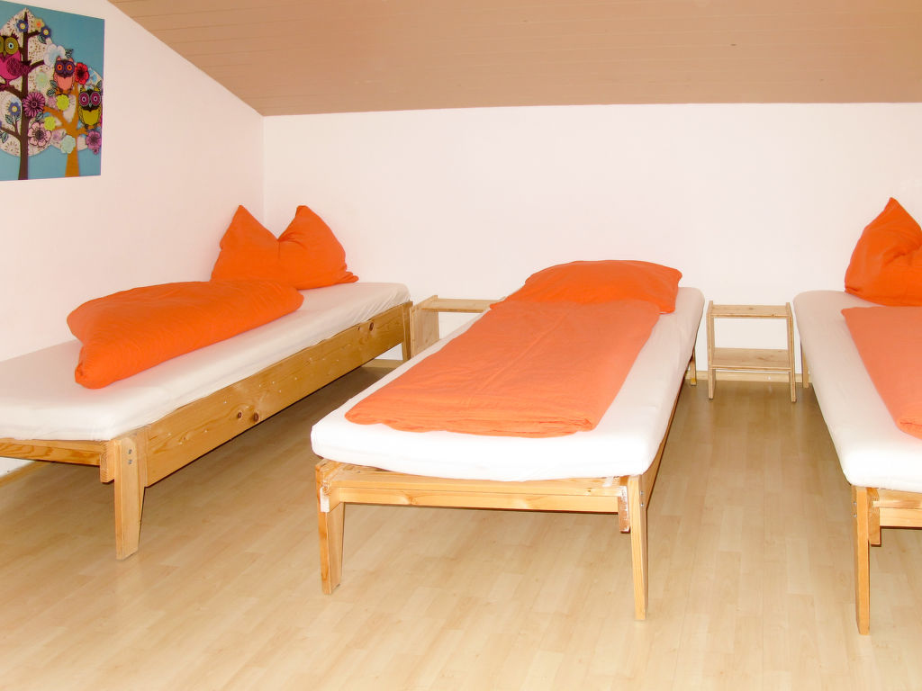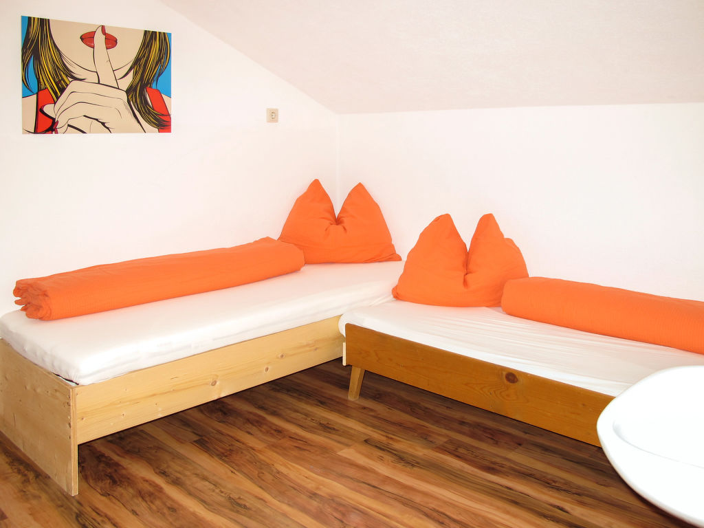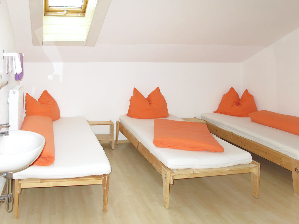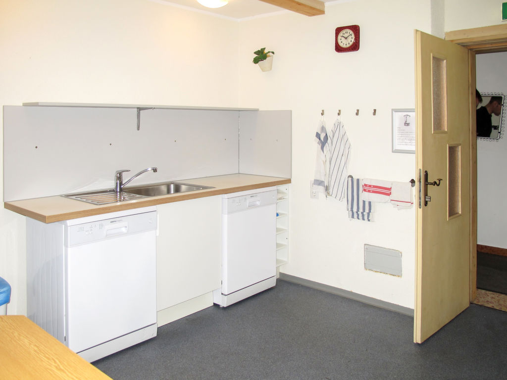 19-Zimmer-Haus, 3 Etagen, ca. 350 m². Zugang über Außentreppe ins Hochparterre: Flur. 2 Gemeinschaftsräume. Küche (4 Ceranfelder, 1 Induktionsfeld, Backofen, 2 Geschirrspüler, Kühlschrank, Gefrierschrank, Gastro-Kaffeemaschine, Wasserkocher, Toaster, Aufschnittmaschine) mit Sitzecke. Einzelzimmer mit Waschbecken. Doppelzimmer mit Dusche/WC, Balkonausgang. Schlafzimmer mit Doppelbett, Einzelbett und Dusche/WC, Balkonausgang. Schlafzimmer mit Doppelbett, Einzelbett und Dusche, Balkonausgang. Dusche/WC. Dusche. Sep.WC. 1. Etage: 2 Einzelzimmer, jeweils mit Waschbecken. 2 Doppelzimmer, jeweils mit Waschbecken. Schlafzimmer mit Doppelbett, Einzelbett und Waschbecken, Balkonausgang. 2 Doppelzimmer, jeweils mit Dusche/WC und Balkonausgang. Schlafzimmer mit Doppelbett, Einzelbett und Dusche/WC. Dusche. 2x sep.WC. 2. Etage: Zweibettzimmer mit Waschbecken. 2 Dreibettzimmer mit Waschbecken und Balkonausgang. Dreibettzimmer mit Waschbecken. 2x Dusche. 2x sep.WC. Bei Belegung mit weniger Personen als der maximalen Personenzahl stehen nicht alle Wohneinheiten zur Verfügung.