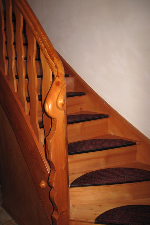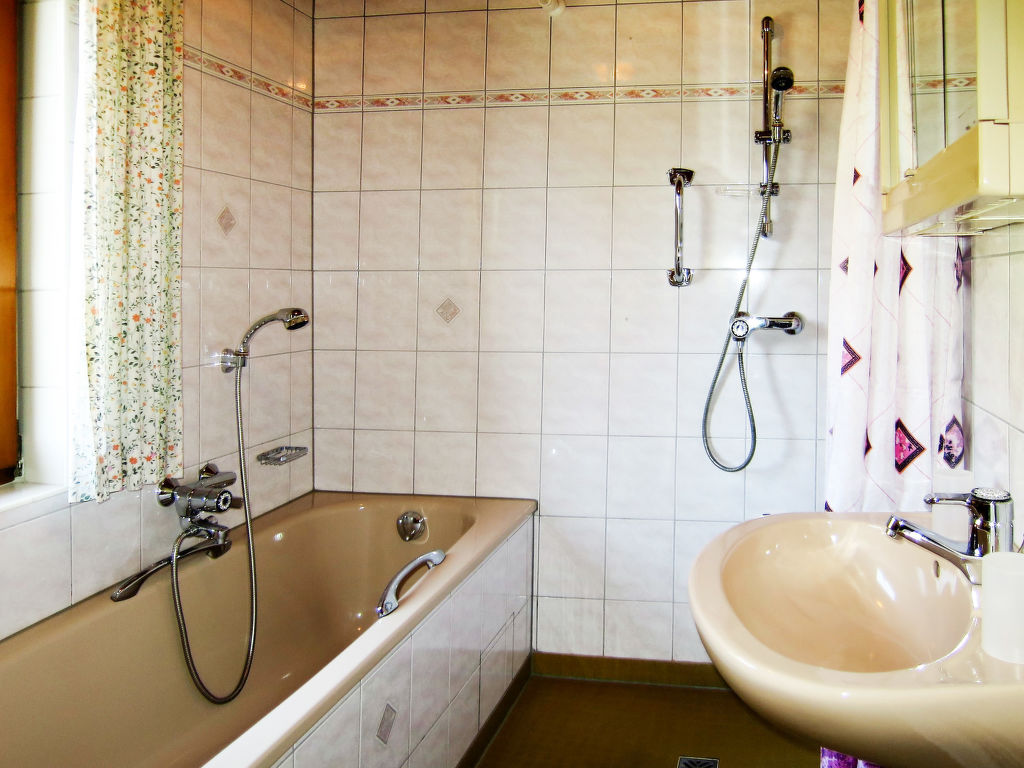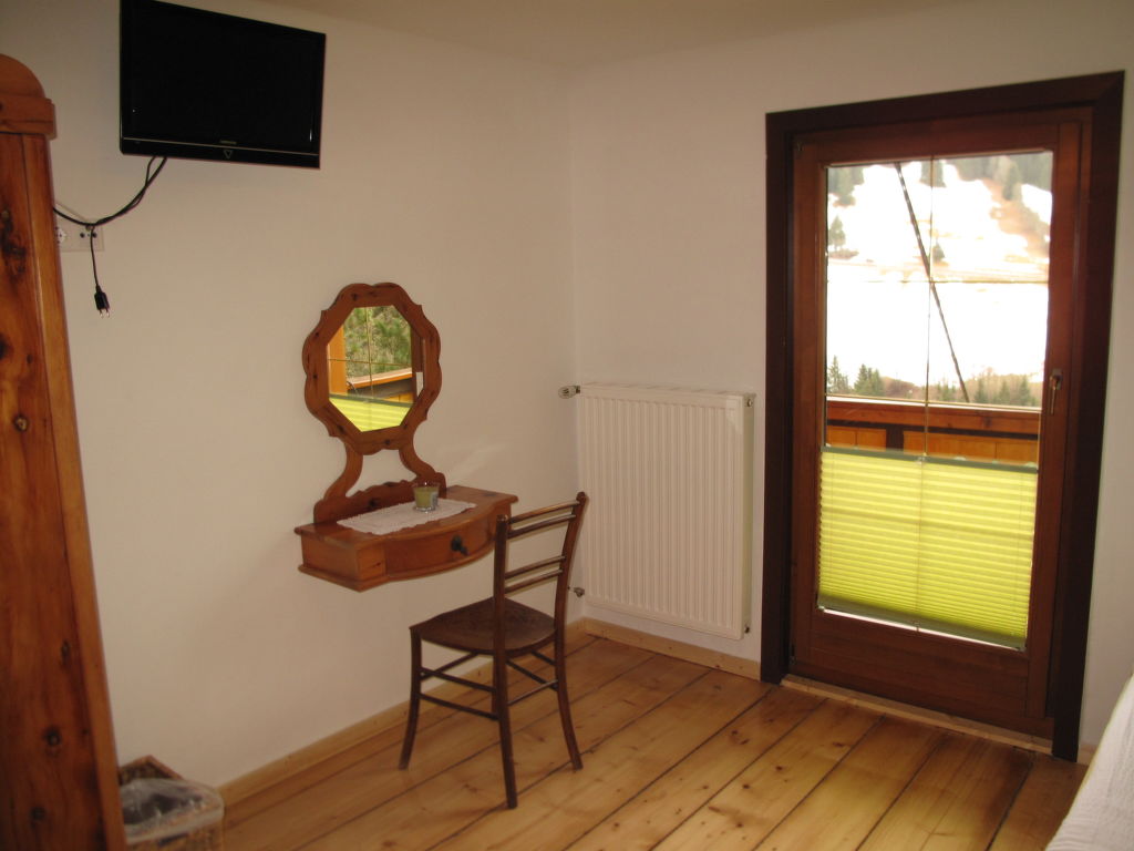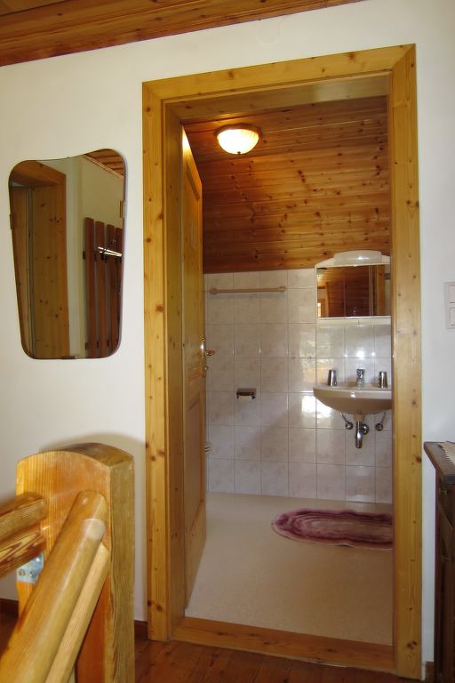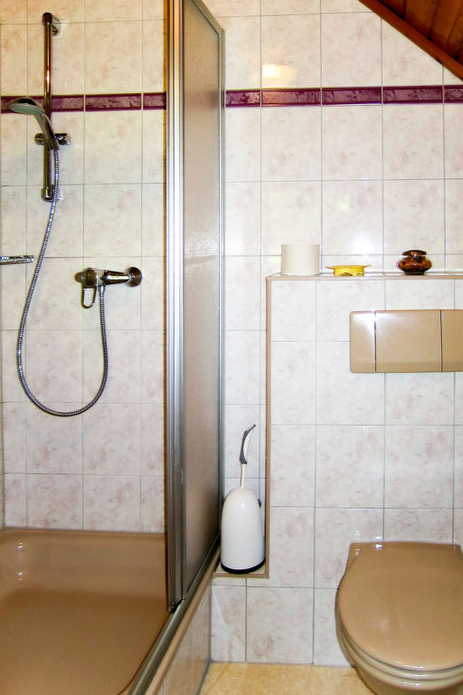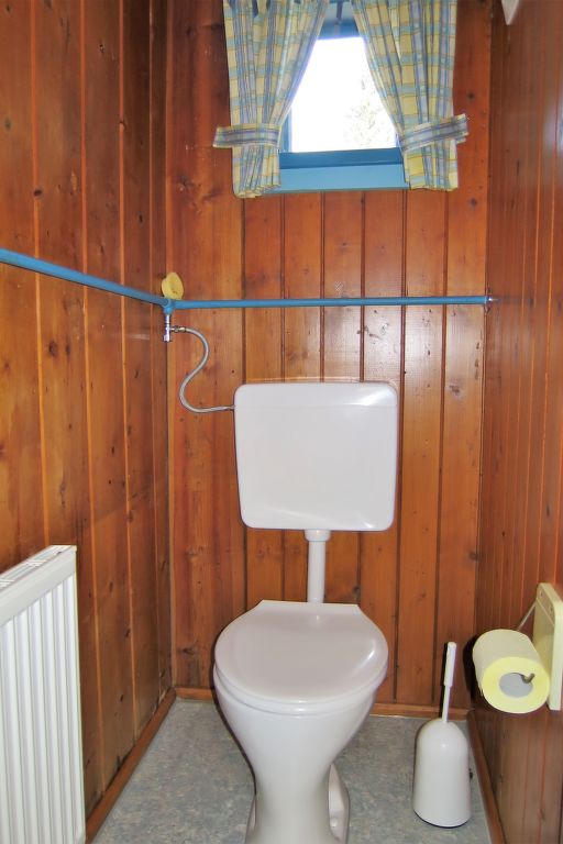 5-Zimmer-Haus, 2 Etagen, ca. 135 m². Erdgeschoss: Flur mit Garderobe. Wohnraum mit Essplatz (Eckbank), offener Durchgang zur Küche (4 Ceranfelder, Backofen, Mikrowelle, Geschirrspüler, Kühlschrank, Gefriertruhe, Kaffeemaschine, Wasserkocher) mit Holzofen und Essplatz für 4 Personen. Doppelzimmer mit Kachelofen (nur Dekoration). Bad/Dusche. 2x sep.WC. Steile Holztreppe ins Obergeschoss (leichte, nicht störende Dachschräge): Zweibettzimmer mit Balkonausgang. Doppelzimmer mit Waschbecken, Balkonausgang. Schlafzimmer mit Doppelbett, Doppelbettcouch und Waschbecken, Balkonausgang. Dusche/WC. Bei Belegung mit weniger Personen als der maximalen Personenzahl stehen nicht alle Wohneinheiten zur Verfügung.