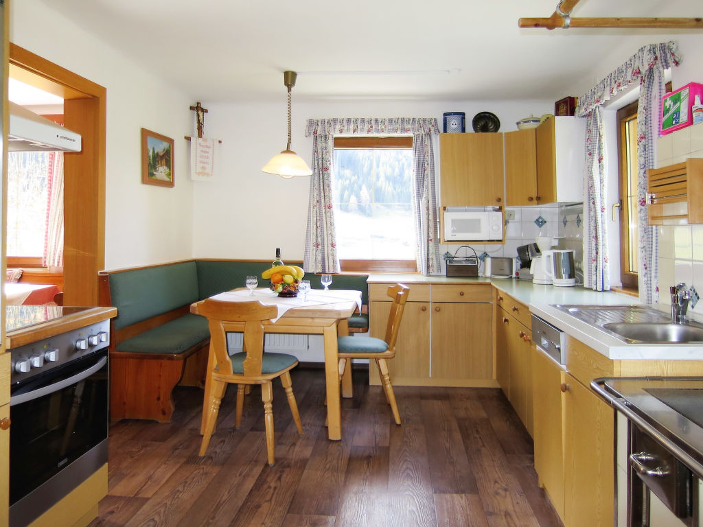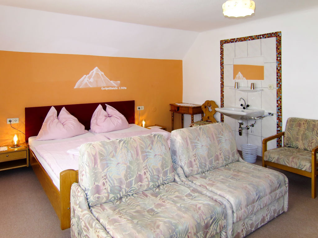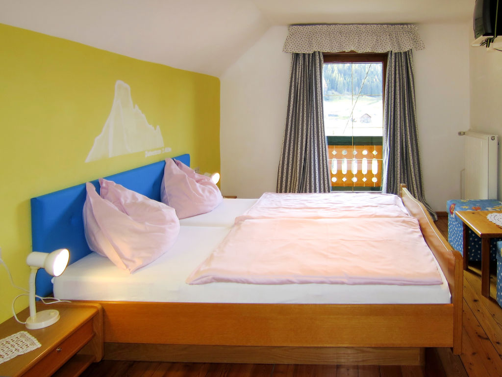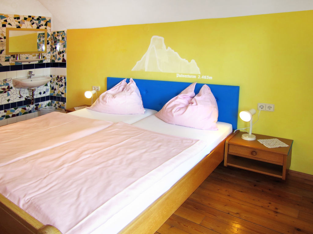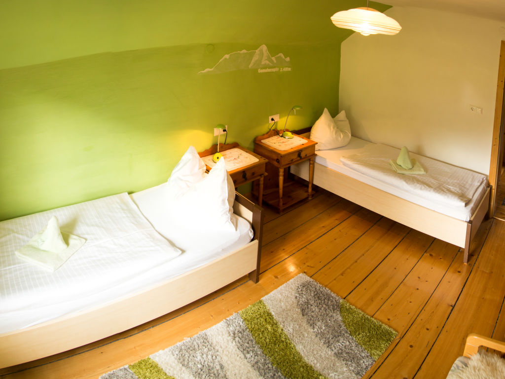 5-Zimmer-Haus, 2 Etagen, ca. 135 m². Erdgeschoss: Flur mit Garderobe. Wohnraum mit Essplatz (Eckbank), offener Durchgang zur Küche (4 Ceranfelder, Backofen, Mikrowelle, Geschirrspüler, Kühlschrank, Gefriertruhe, Kaffeemaschine, Wasserkocher) mit Holzofen und Essplatz für 4 Personen. Doppelzimmer mit Kachelofen (nur Dekoration). Bad/Dusche. 2x sep.WC. Steile Holztreppe ins Obergeschoss (leichte, nicht störende Dachschräge): Zweibettzimmer mit Balkonausgang. Doppelzimmer mit Waschbecken, Balkonausgang. Schlafzimmer mit Doppelbett, Doppelbettcouch und Waschbecken, Balkonausgang. Dusche/WC. Bei Belegung mit weniger Personen als der maximalen Personenzahl stehen nicht alle Wohneinheiten zur Verfügung.