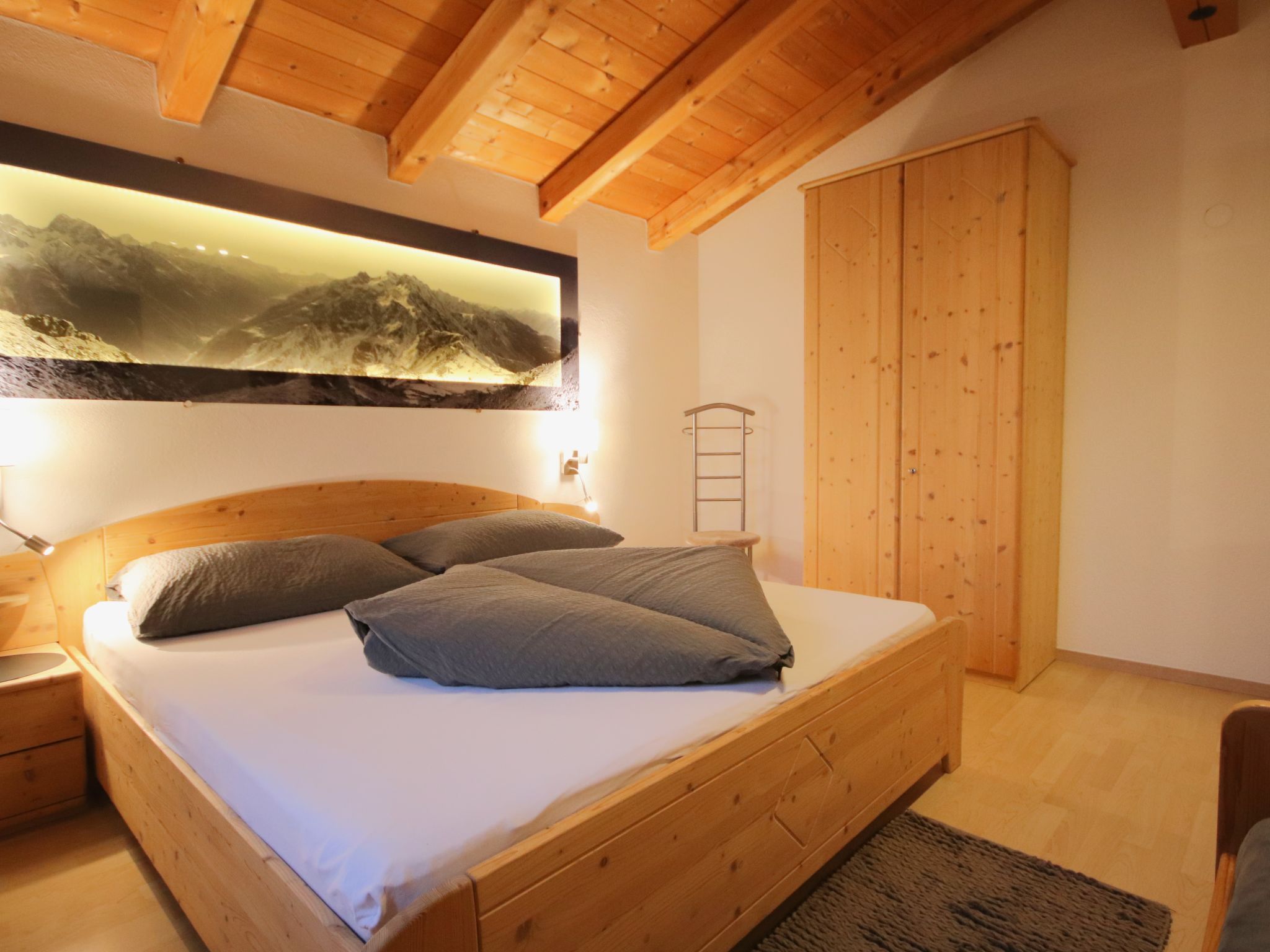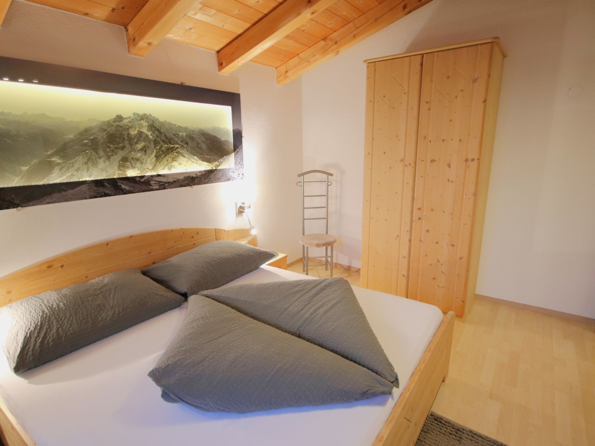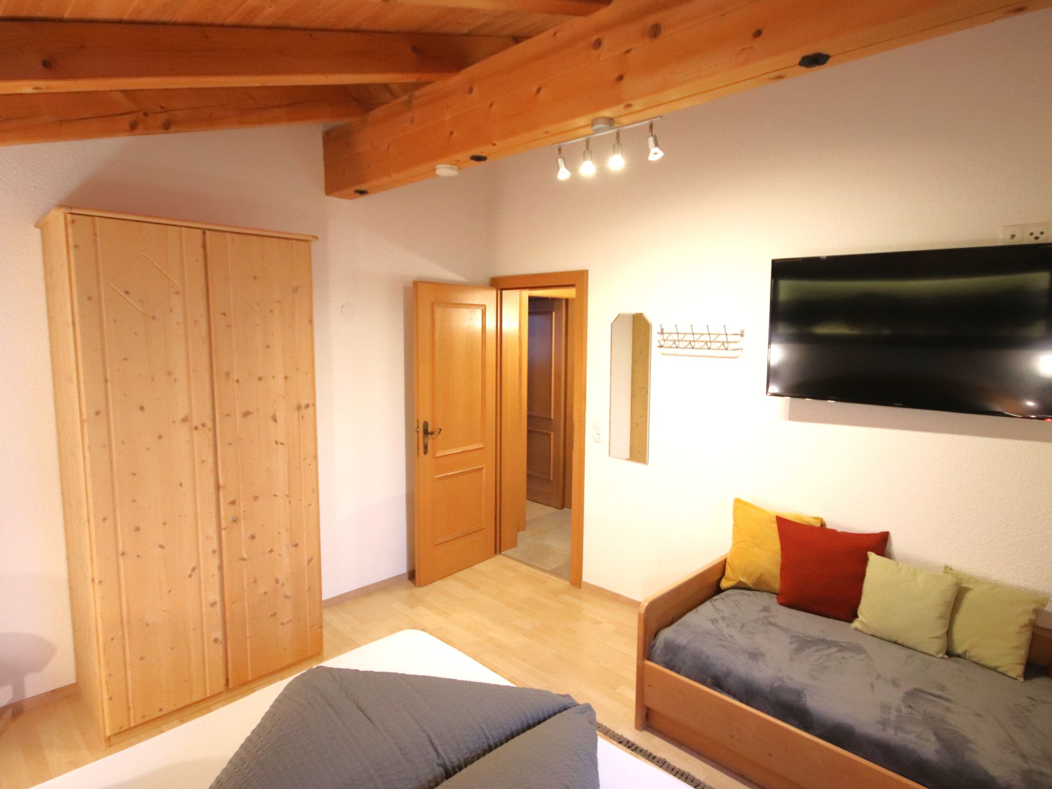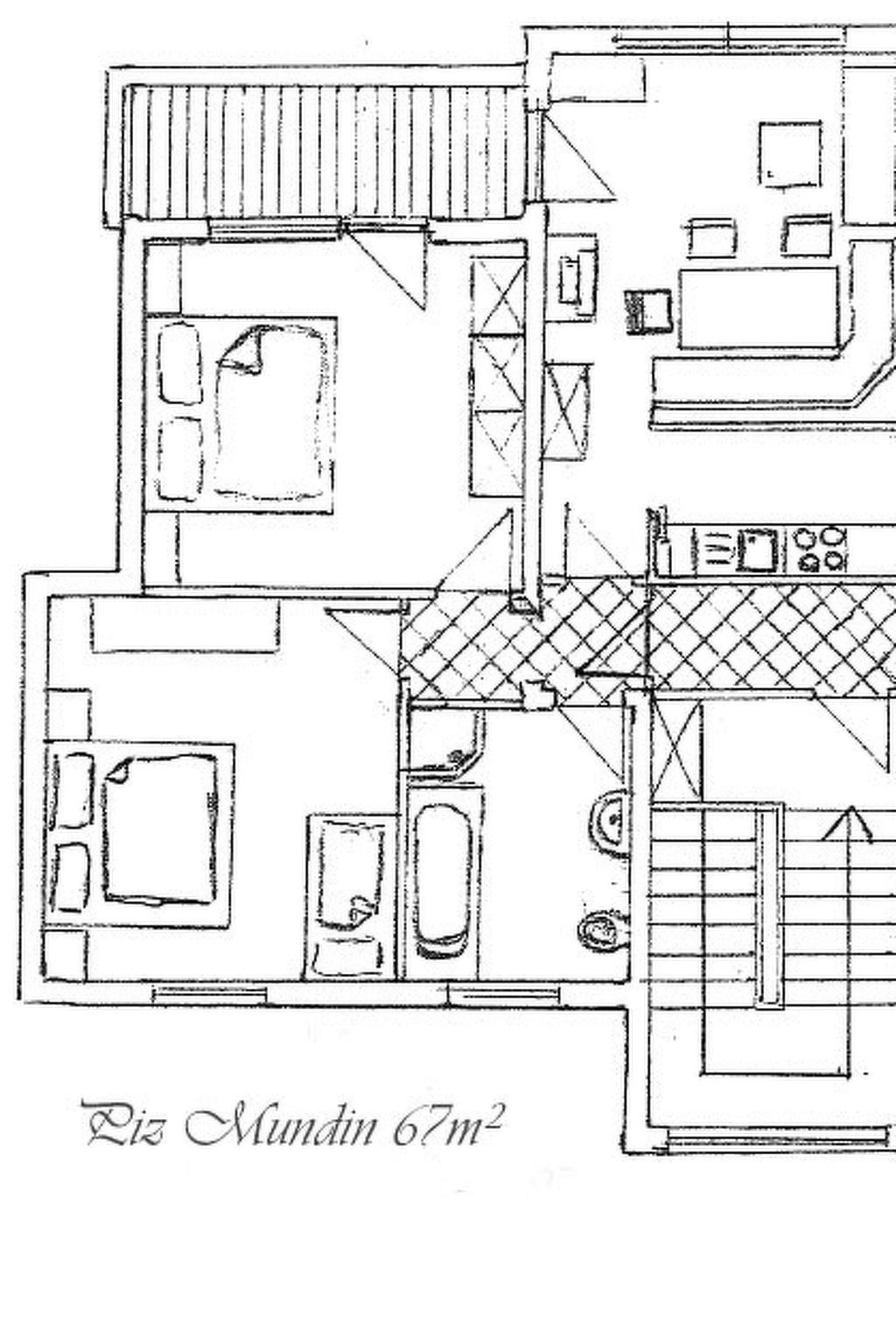 3-Zimmer-Wohnung 'Piz Mundin', 2. Etage (teils leichte Dachschräge), ca. 67 m². Diele. Wohn-/Schlafraum mit Doppelbettcouch, Essplatz (Eckbank), Balkonausgang, offene Küche (4 Ceranfelder, Backofen, Mikrowelle, Geschirrspüler, Kühlschrank, Kaffeevollautomat, Wasserkocher, Toaster). Doppelzimmer. Schlafzimmer mit Doppelbett und Einzelbett (als Zusatzbett, siehe Nebenkosten). Bad/Dusche/WC. Bei Belegung mit weniger Personen als der maximalen Personenzahl stehen nicht alle Wohneinheiten zur Verfügung.