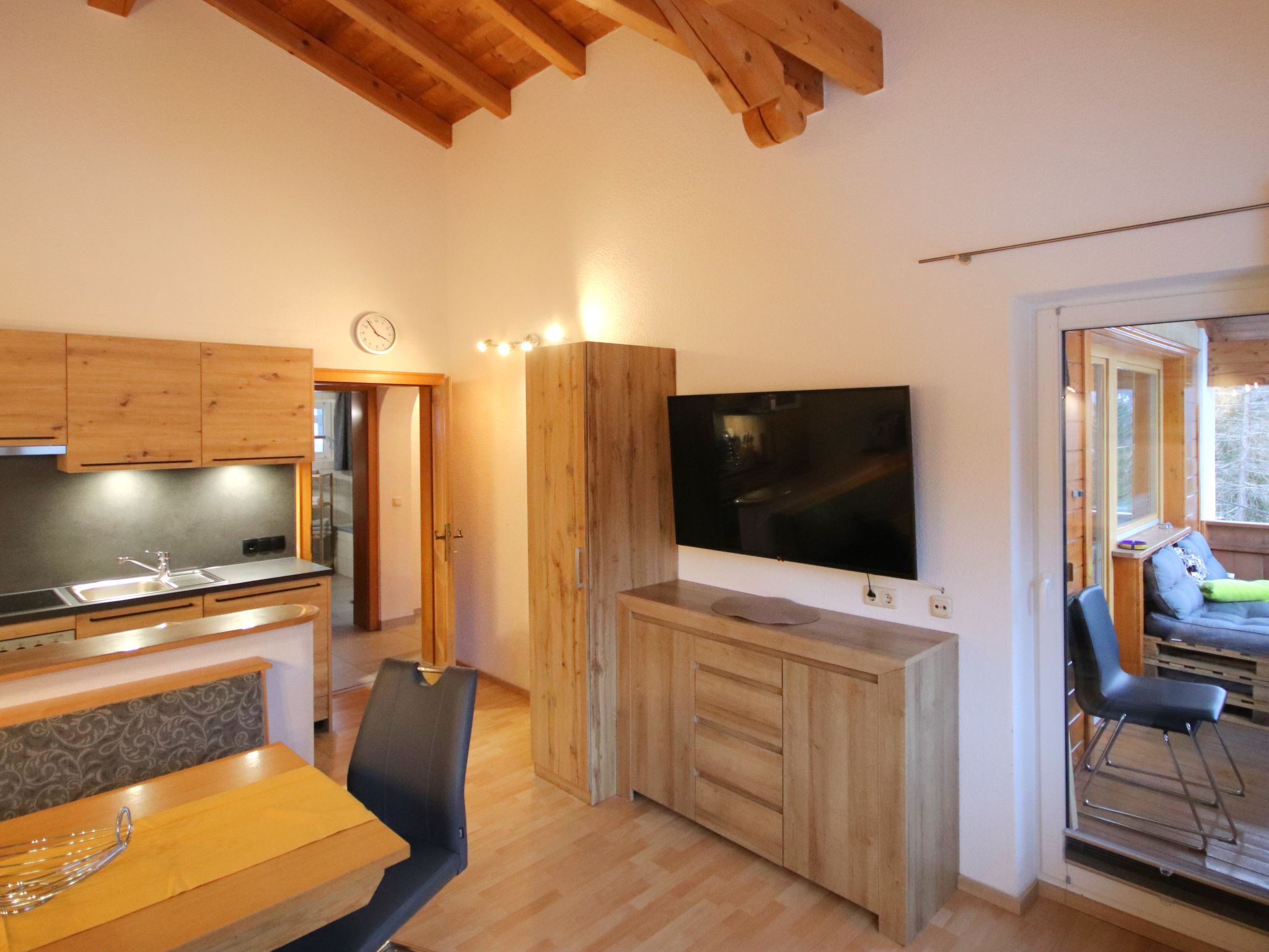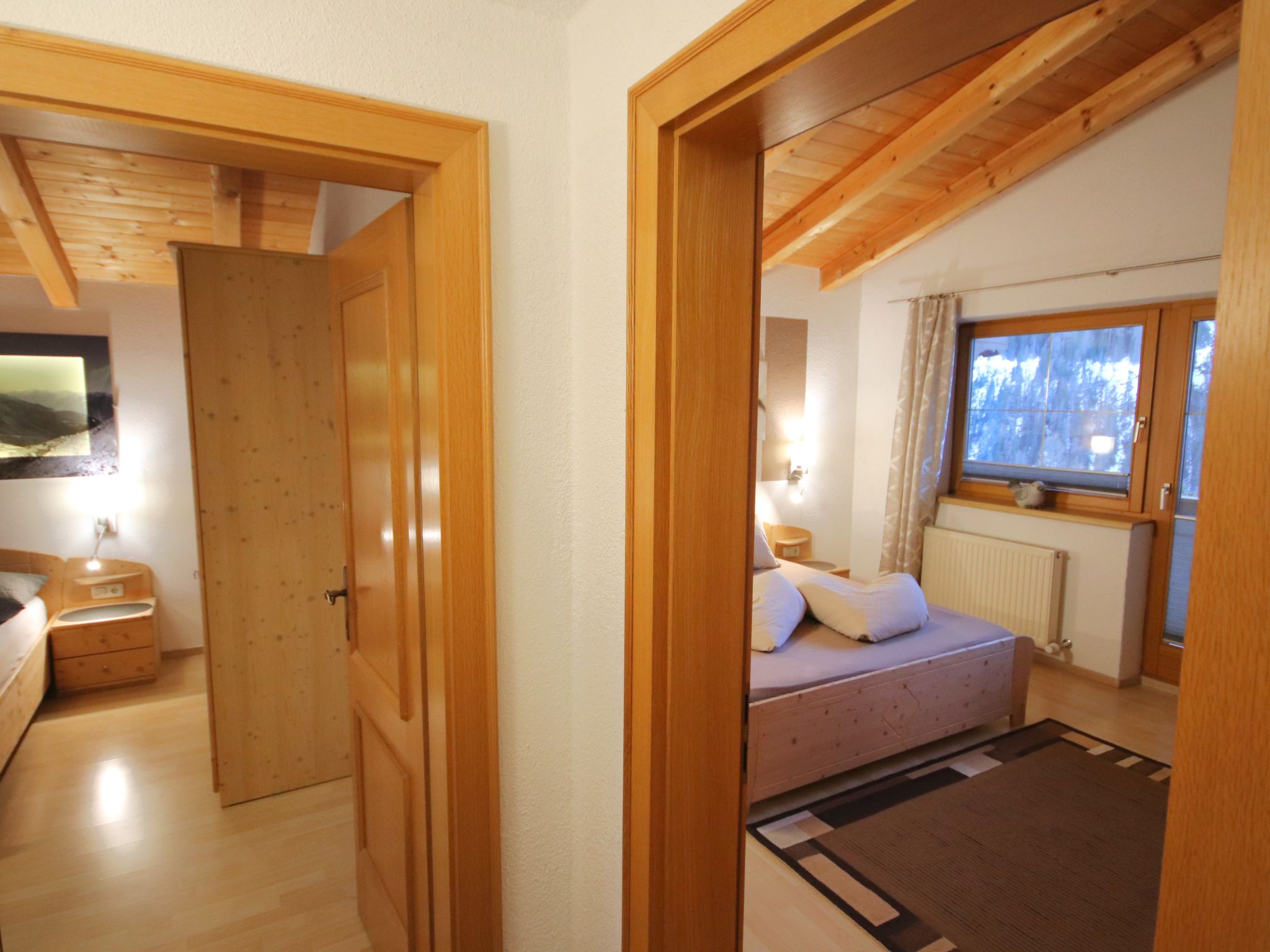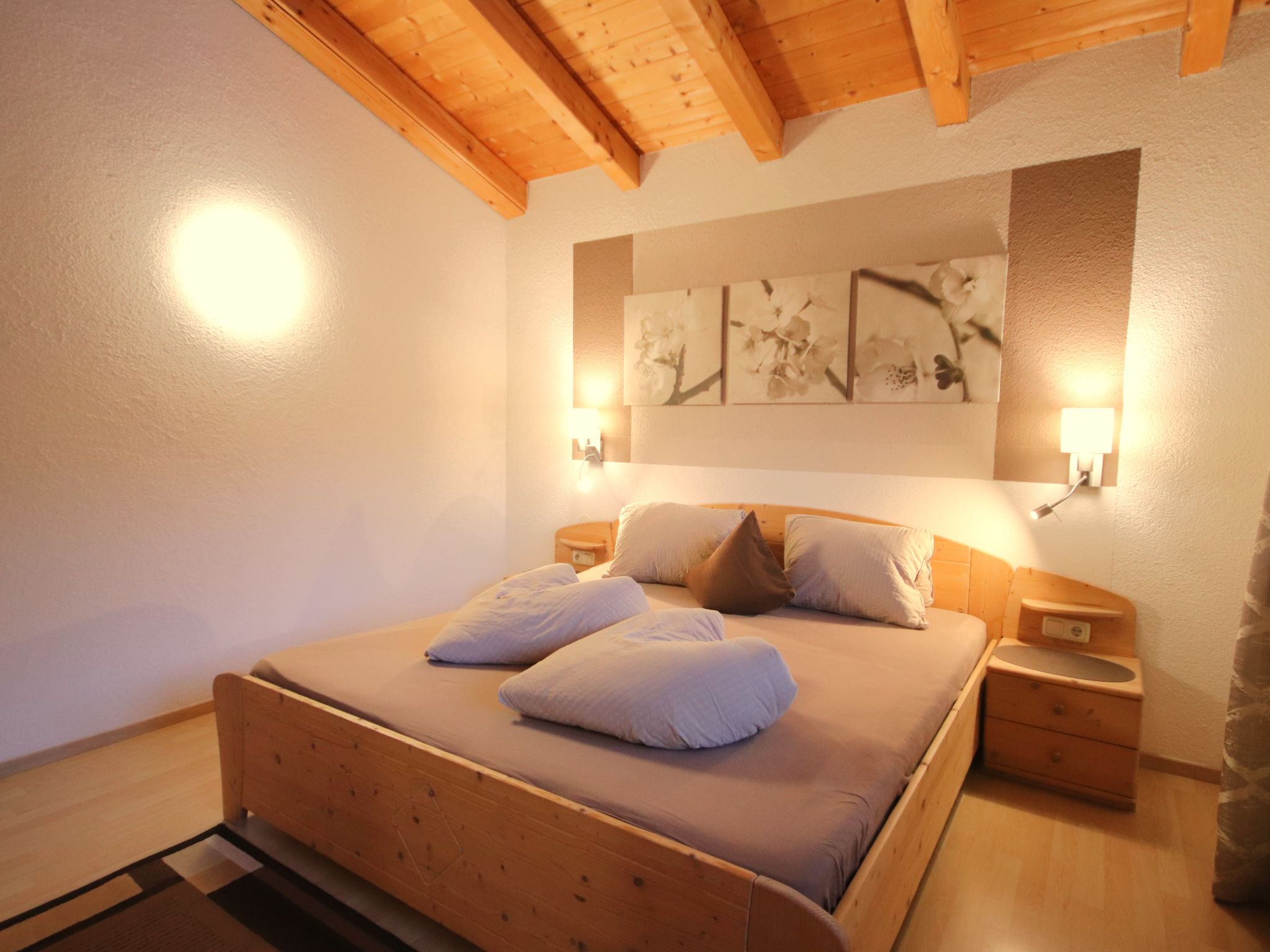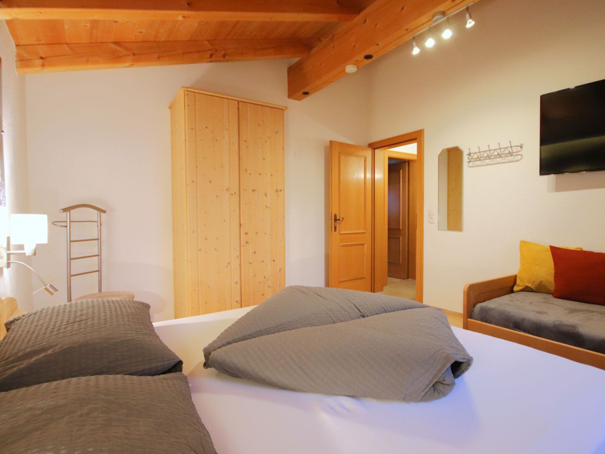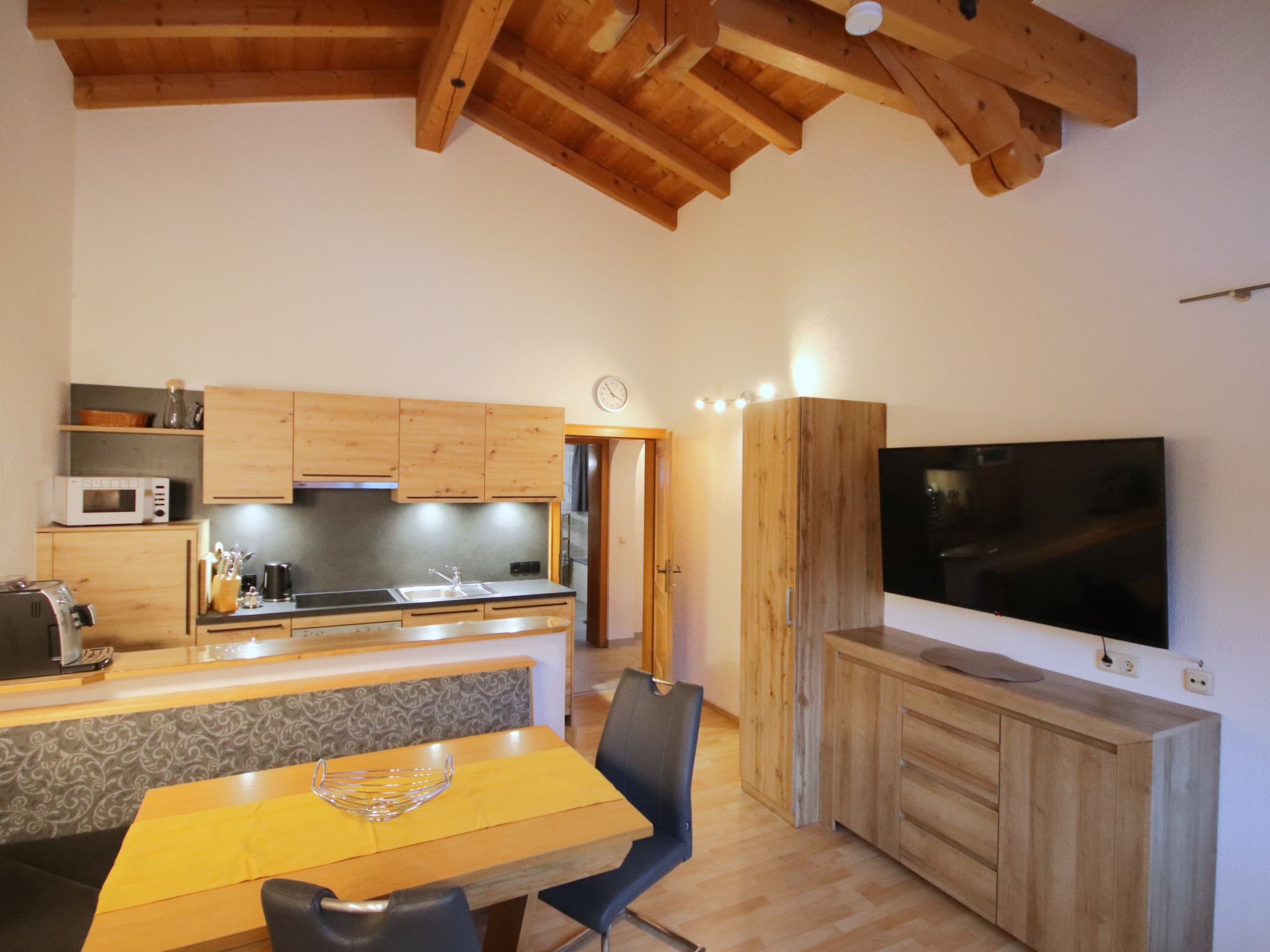 3-Zimmer-Wohnung 'Piz Mundin', 2. Etage (teils leichte Dachschräge), ca. 67 m². Diele. Wohn-/Schlafraum mit Doppelbettcouch, Essplatz (Eckbank), Balkonausgang, offene Küche (4 Ceranfelder, Backofen, Mikrowelle, Geschirrspüler, Kühlschrank, Kaffeevollautomat, Wasserkocher, Toaster). Doppelzimmer. Schlafzimmer mit Doppelbett und Einzelbett (als Zusatzbett, siehe Nebenkosten). Bad/Dusche/WC. Bei Belegung mit weniger Personen als der maximalen Personenzahl stehen nicht alle Wohneinheiten zur Verfügung.