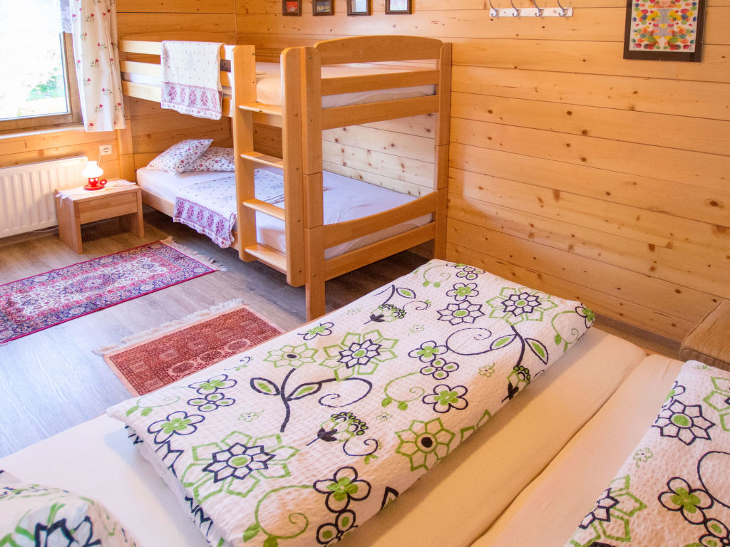 3-Zimmer-Haus, ca. 80 m². Wohn-/Schlafraum mit Doppelbettcouch, Kamin (Holz inklusive), Küchenzeile (4 Platten, Backofen, Mikrowelle, Geschirrspüler, Kühlschrank, Kaffeemaschine, Wasserkocher, Toaster, Fondue-Set), Essplatz (Eckbank) und Terrrassenausgang. Doppelzimmer. Schlafzimmer mit Doppelbett und Etagenbett. 2x Dusche/WC. Flexibilität bei der Bettenaufteilung: Es stehen mehr Schlafmöglichkeiten zur Verfügung als die maximal zugelassene Personenzahl, diese darf dennoch nicht überschritten werden. REG.NR.:50608-000362-2020