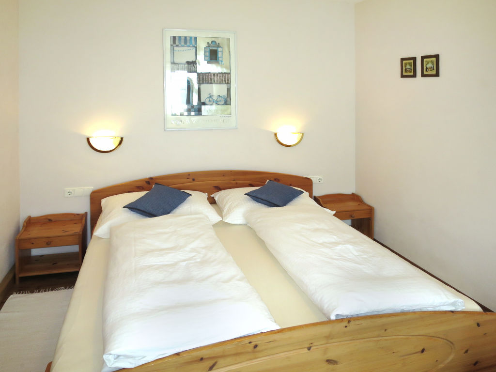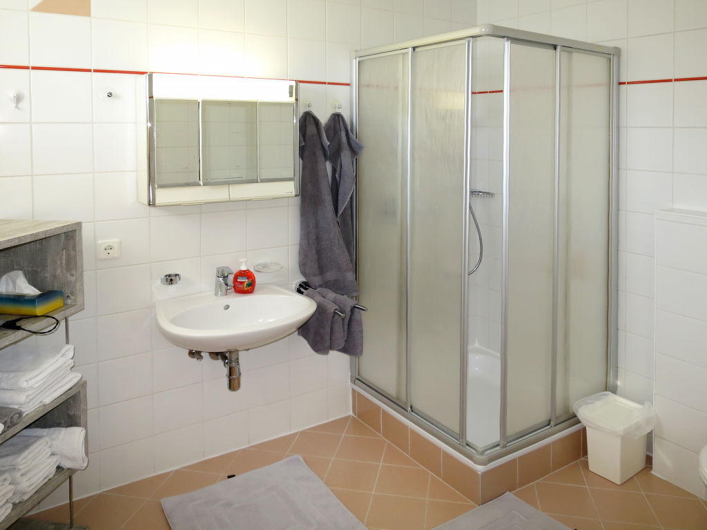 2-Zimmer-Wohnung, Erdgeschoss (Hanglage), ca. 54 m². Separater Eingang in Flur. Wohn-/Schlafraum mit Sitzgruppe/Doppelbettcouch, Essplatz (Rundbank) im Erker und Küchenzeile (4 Platten, Backofen, Kühlschrank, Kaffeemaschine, Wasserkocher, Toaster). Schlafzimmer mit Doppelbett, Einzelbett und Zugang zu Dusche/WC. Sep.WC.