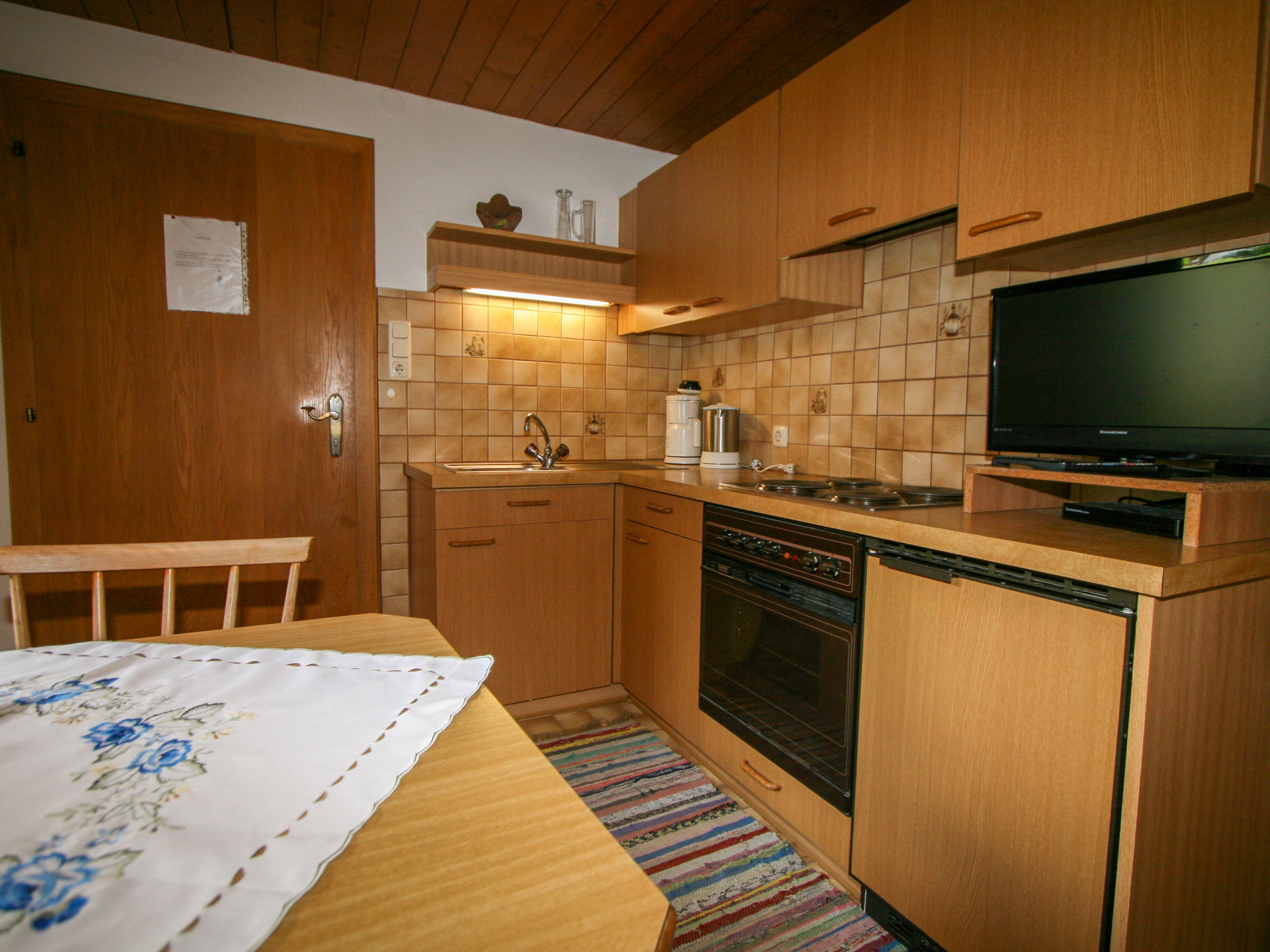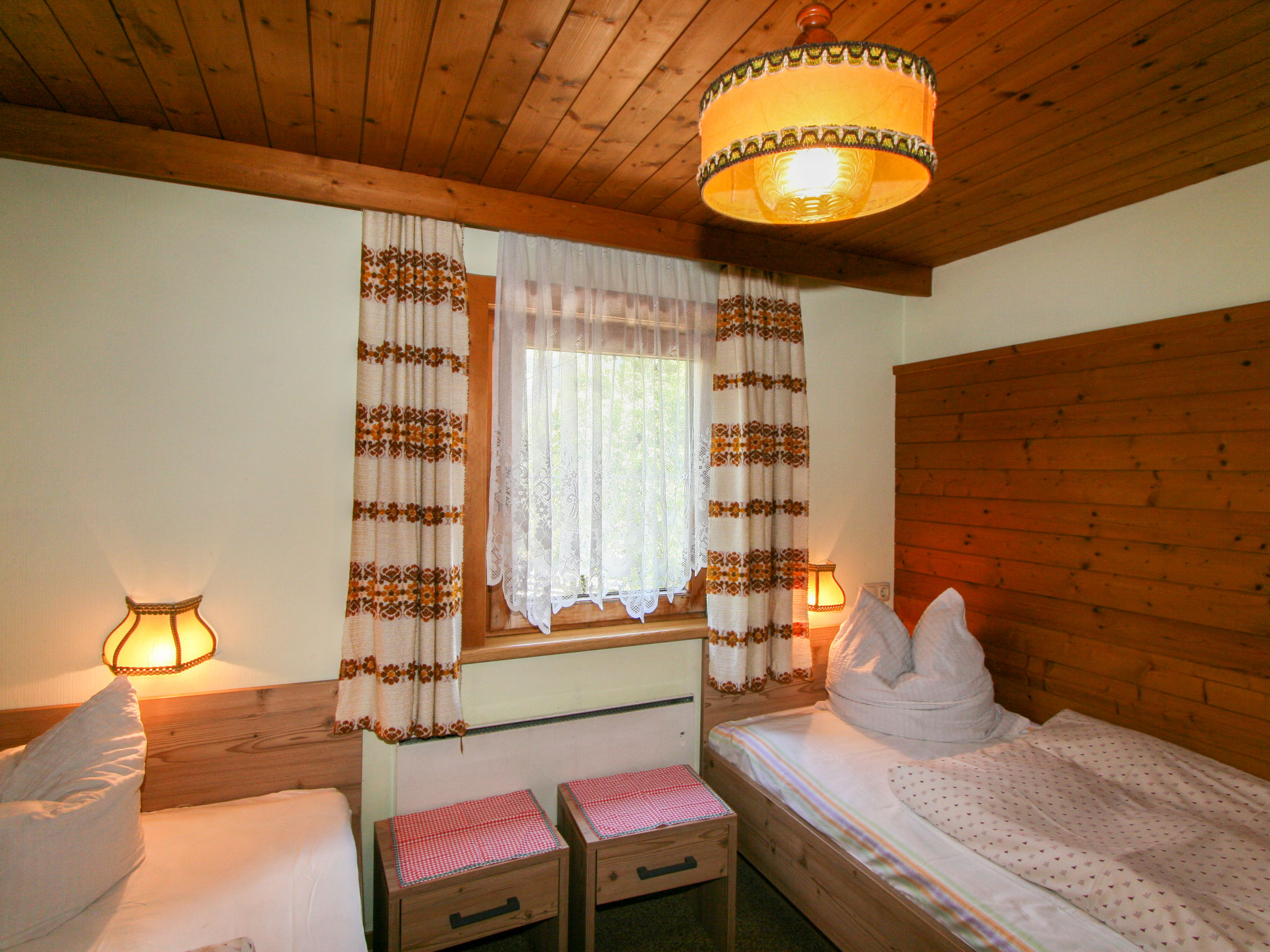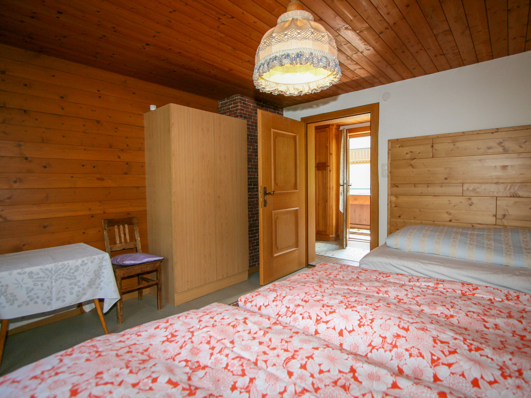3-Zimmer-Wohnung, Hochparterre, ca. 50 m². Kleiner Vorraum mit Garderobe. Wohnküche (4 Platten, Backofen, Kühlschrank, Kaffeemaschine, Wasserkocher) mit Essplatz (Eckbank). Zweibettzimmer. Schlafzimmer mit Doppelbett und Einzelbett. Dusche/WC.