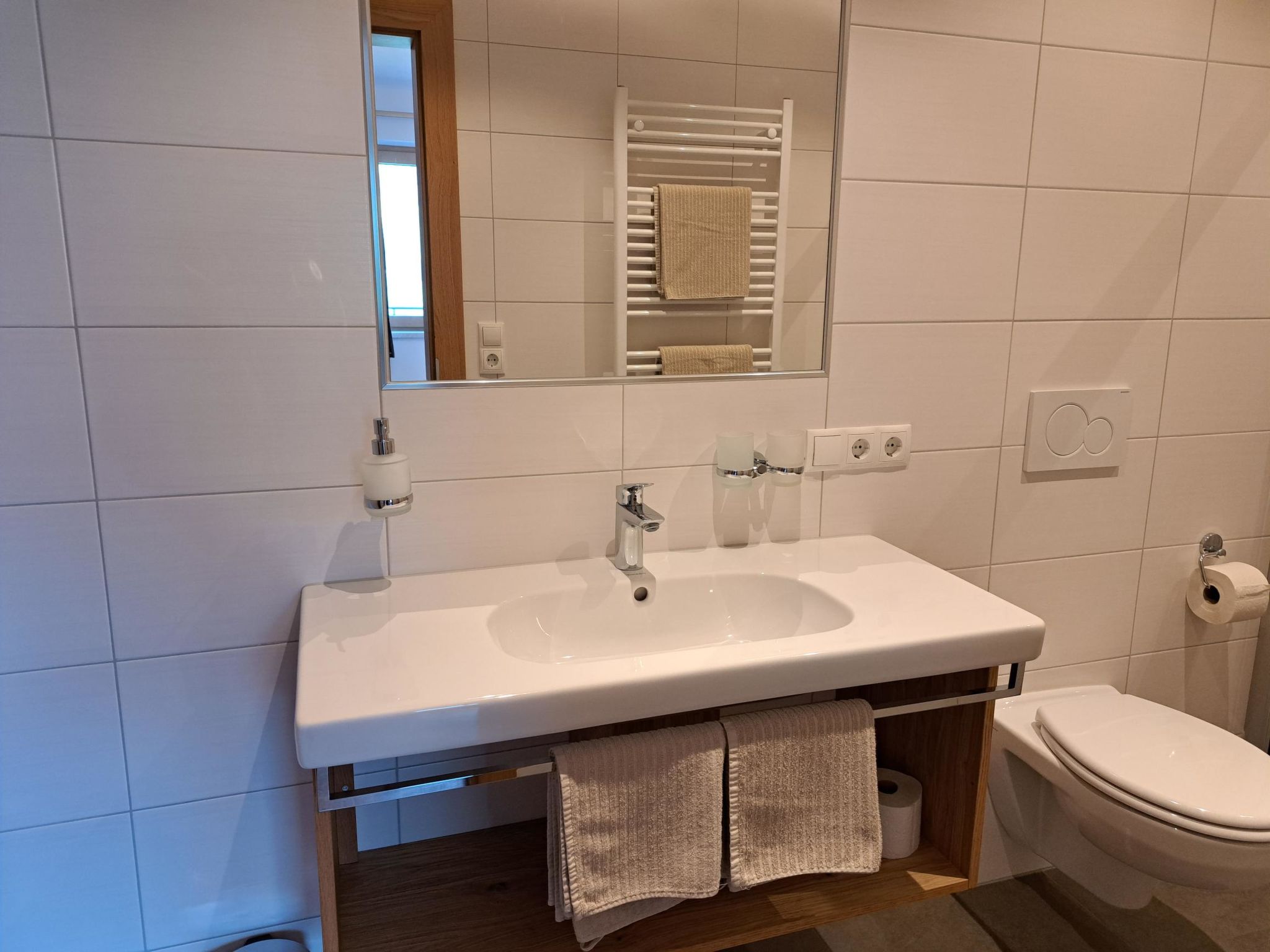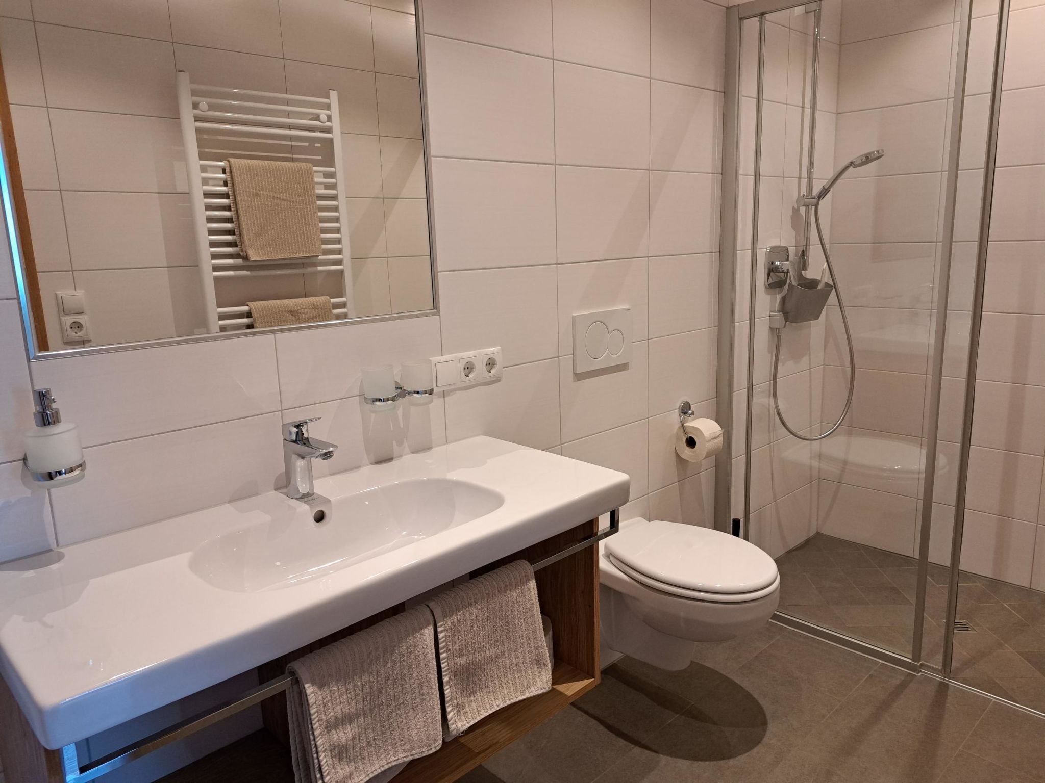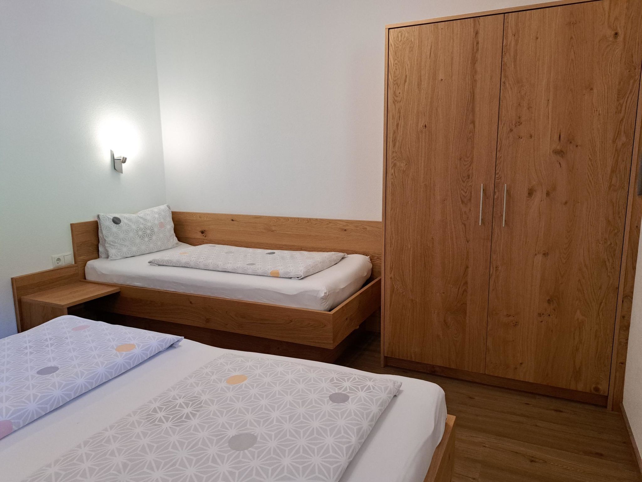 3-Zimmer-Wohnung, 2. Etage, ca. 60 m². Separater Zugang über Außentreppe. Wohnküche (4 Ceranfelder, Backofen, Geschirrspüler, Kühlschrank, Kaffeemaschine, Wasserkocher, Toaster) mit Essplatz (Eckbank), Balkonausgang. Doppelzimmer mit Dusche/WC, Balkonausgang. Schlafzimmer mit Doppelbett und Einzelbett. Dusche/WC.