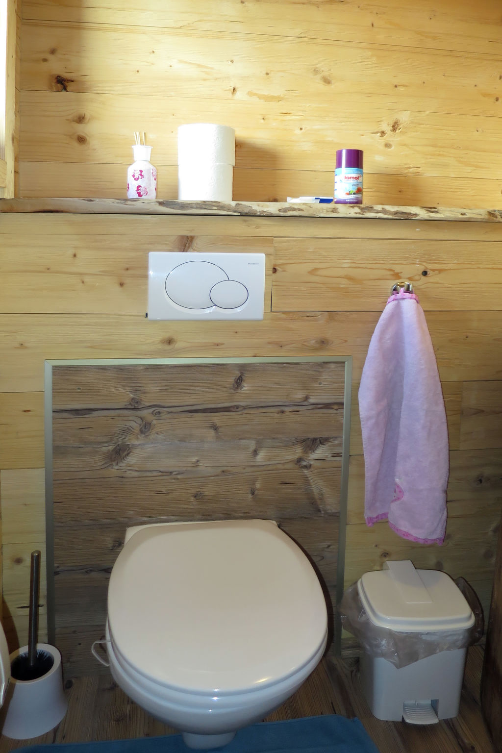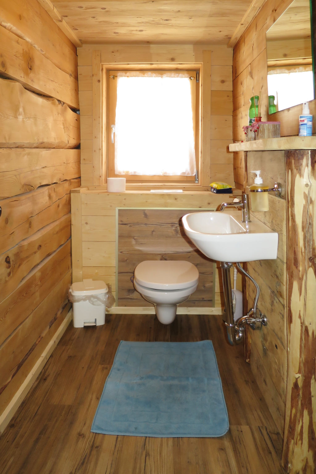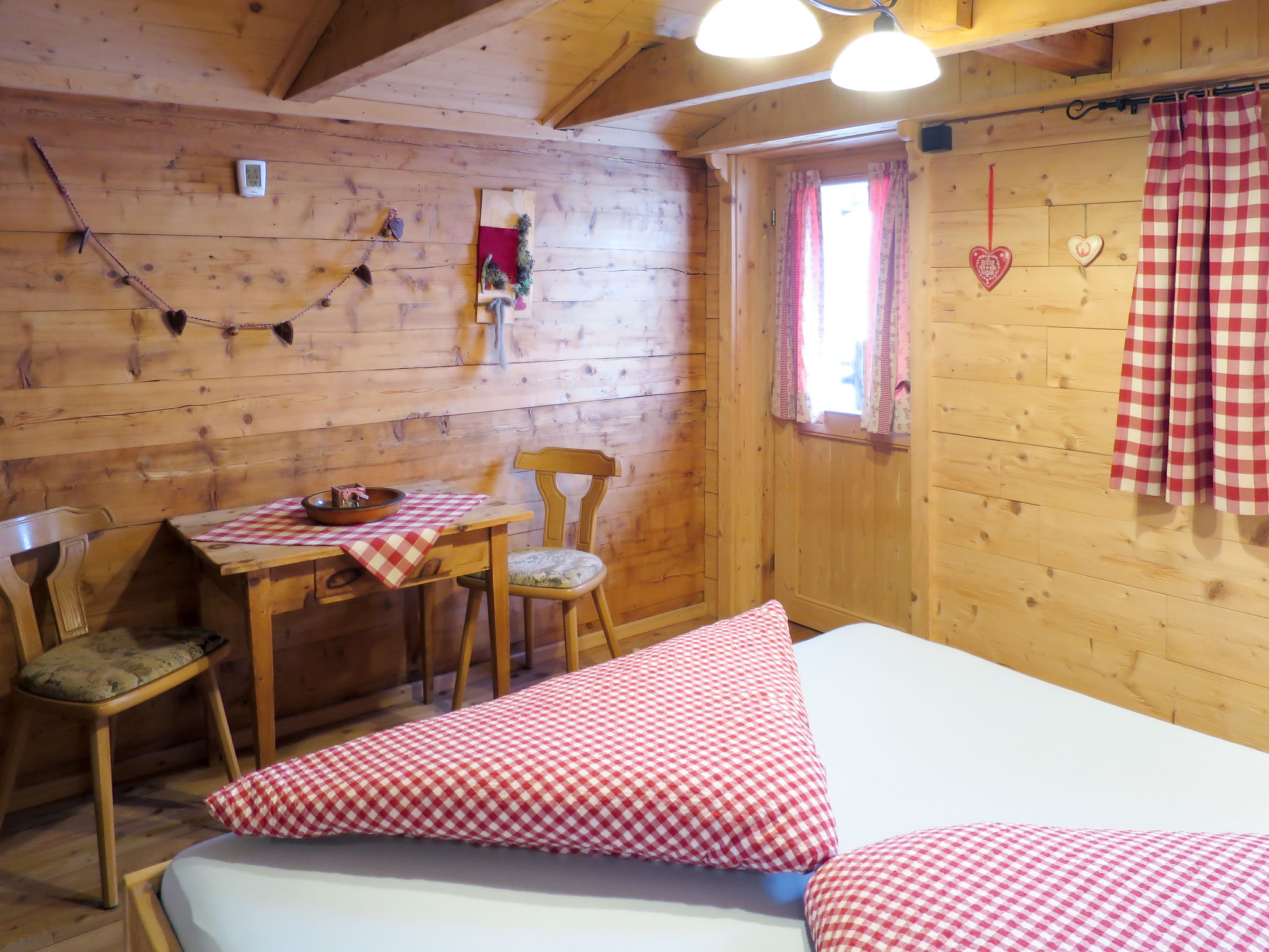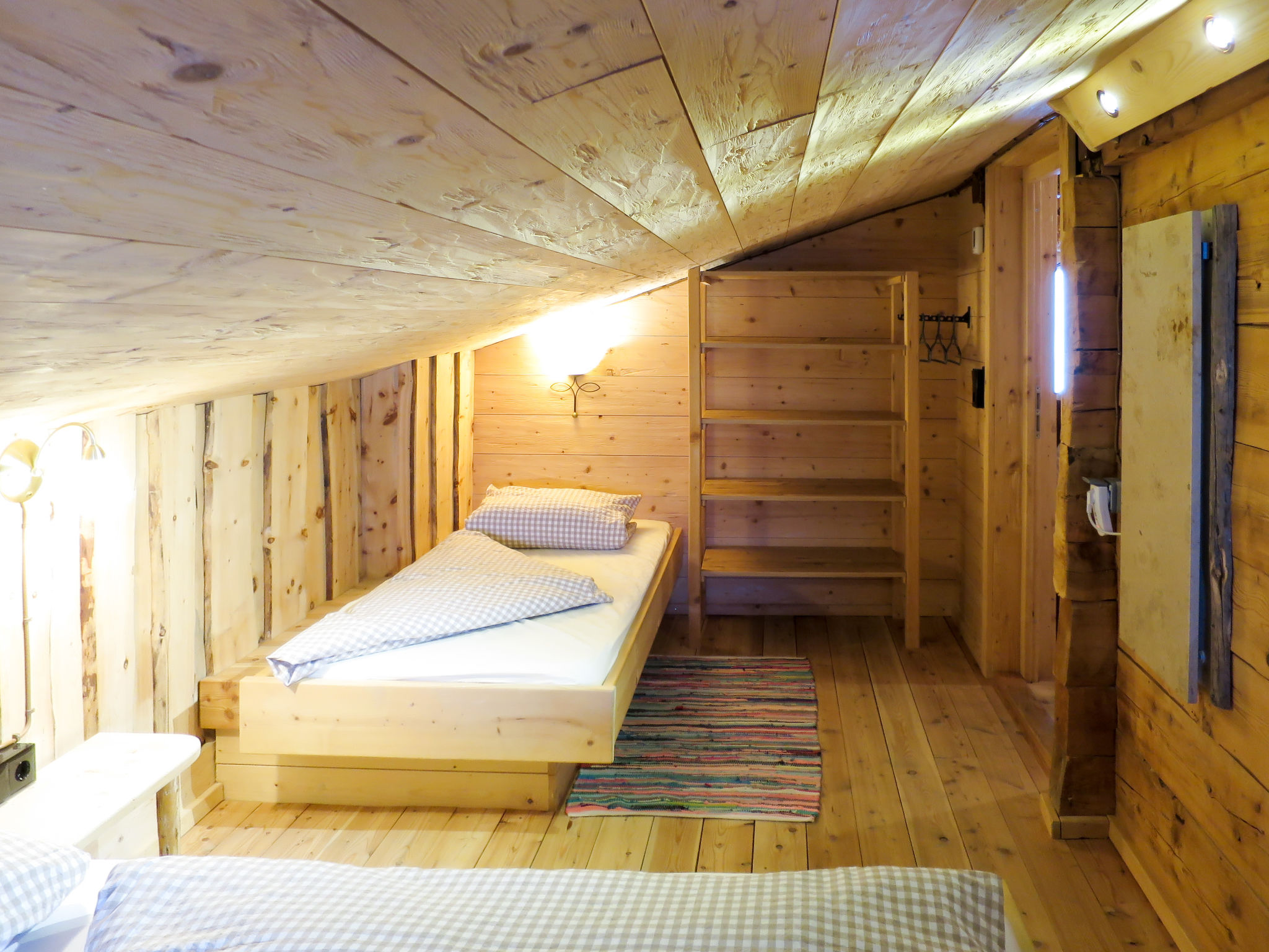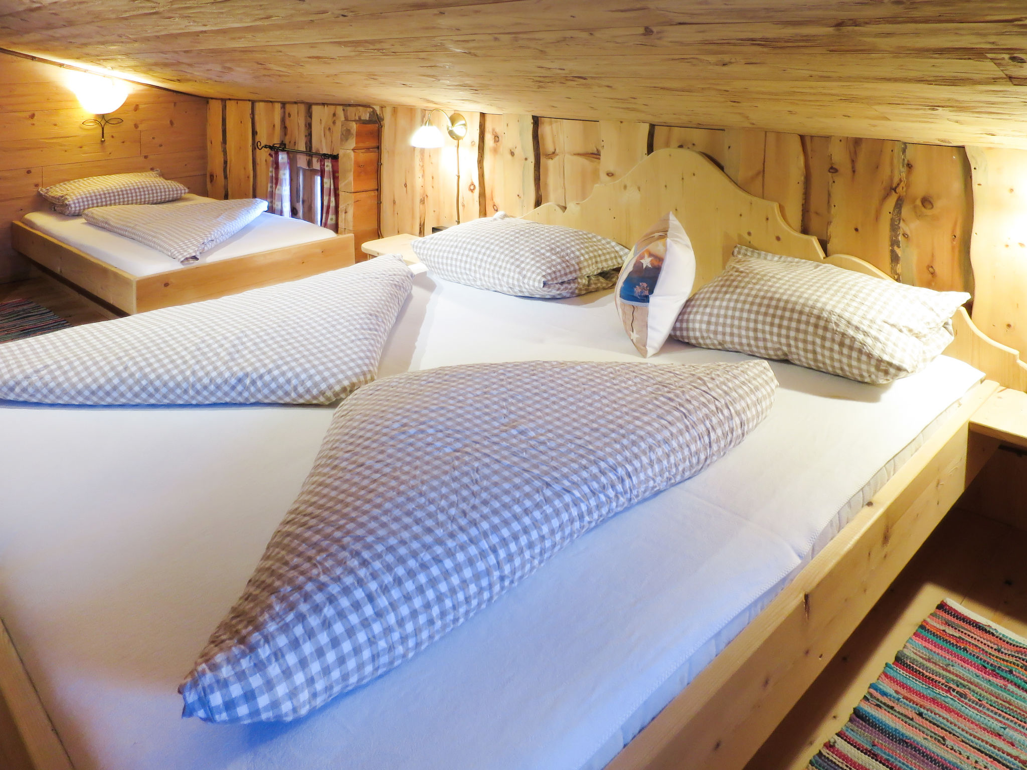 6-Zimmer-Hütte, 2 Etagen, ca. 120 m². Erdgeschoss: Wohnraum mit Essplätzen (Eckbänke) und Kaminofen. Küche (4 Platten, Holzherd, Mikrowelle, Geschirrspüler, Kühlschrank, Kaffeemaschine) mit Essplatz (Eckbank) für 6 Personen. Schlafzimmer mit Doppelbett und Einzelbett. 2x Dusche. Sep.WC. Dachgeschoss (Dachschräge): 2 Doppelzimmer, eines mit Balkonausgang. 2 Schlafzimmer, jeweils mit Doppelbett und Einzelbett. Sep.WC.