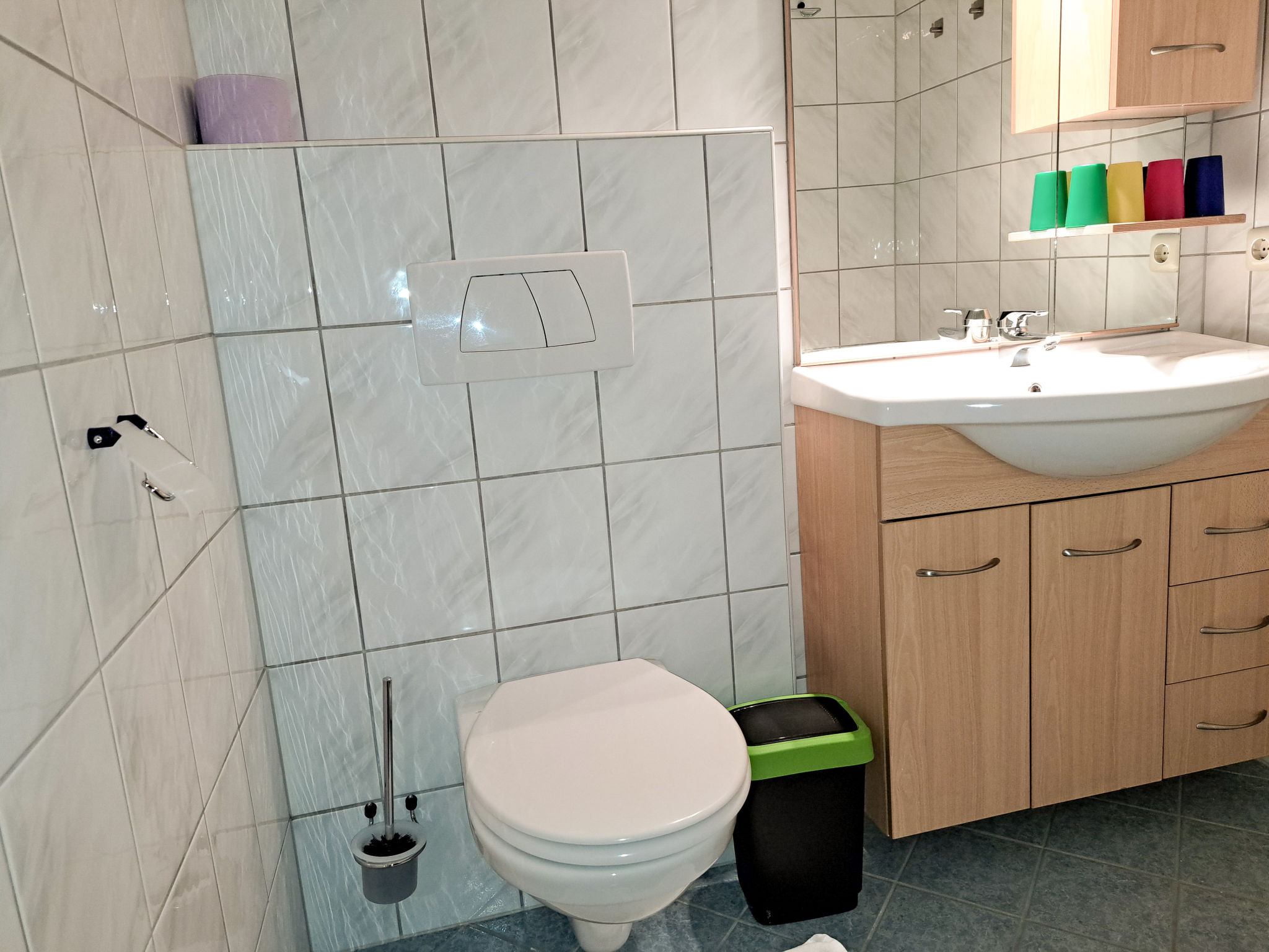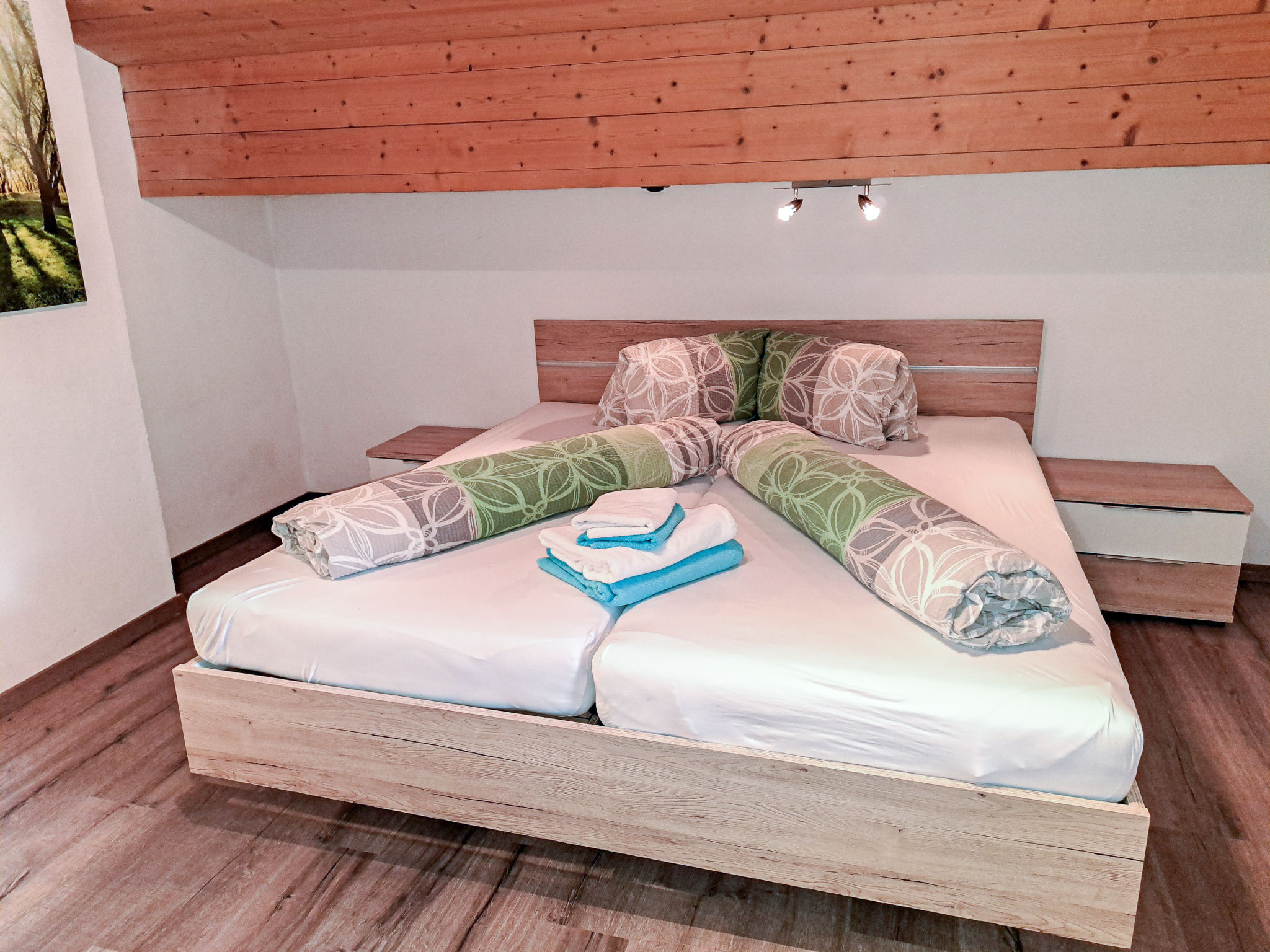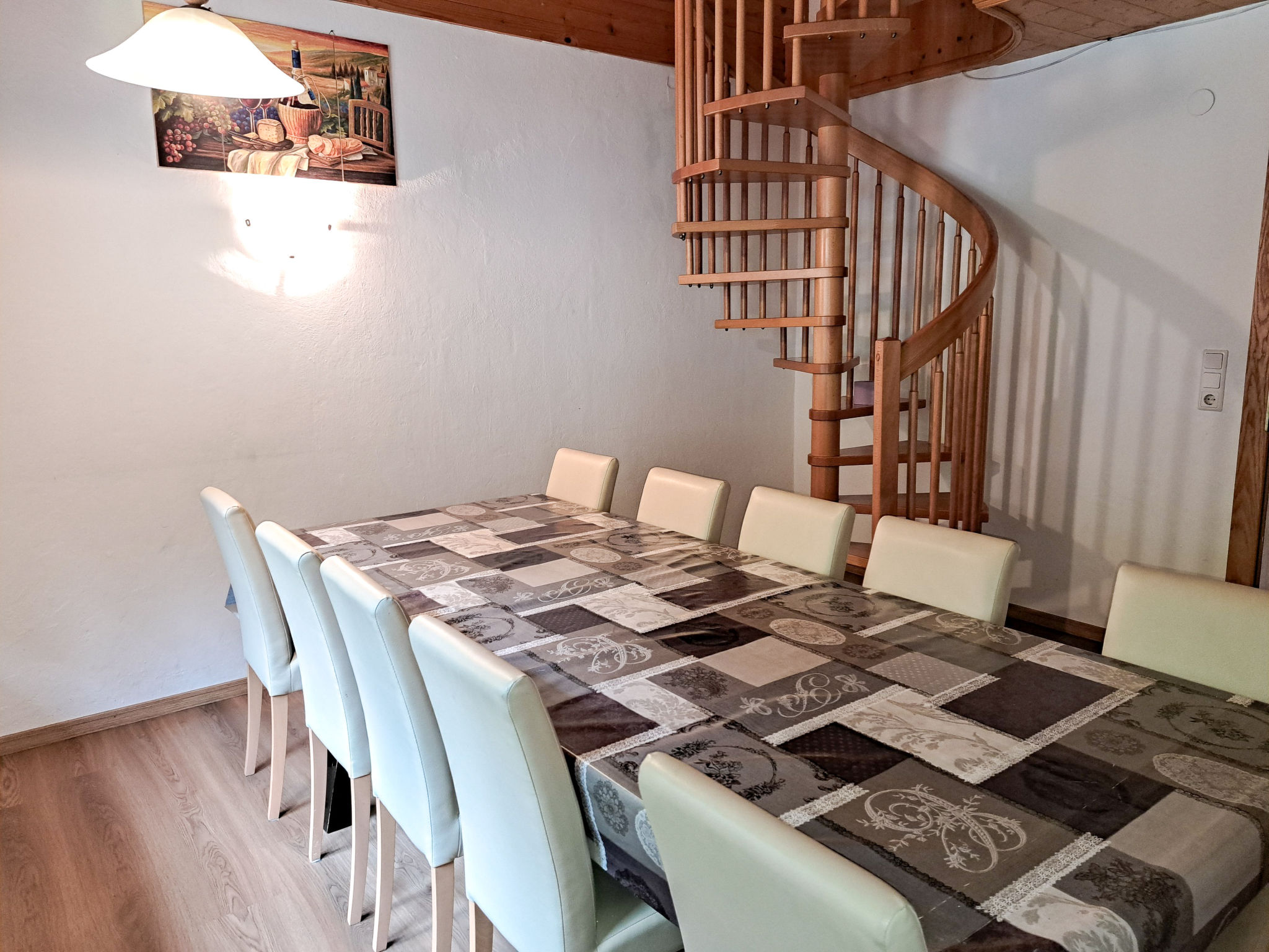 7-Zimmer-Wohnung, 1. Etage, 2 Ebenen, ca. 140 m². Zugang über Innentreppe in die 1. Etage. Wohnraum mit Sitzgruppe/Bettcouch (als Zusatzbett, siehe Nebenkosten), Essplatz (Eckbank) und Balkonausgang. Esszimmer mit Balkonausgang. Küche (4 Ceranfelder, Backofen, Mikrowelle, Geschirrspüler, Kühl-/Gefrierkombination, Kaffeemaschine, Wasserkocher, Toaster) mit Bartheke und 3 Hockern. Doppelzimmer mit Bad und Balkonausgang. Doppelzimmer mit Balkonausgang. Dusche. 2x Sep.WC. Vom Wohnraum Treppe in die 2. Etage (Dachschräge): Doppelzimmer mit sep.WC. Vom Esszimmer Wendeltreppe in die 2. Etage (Dachschrägen, teils eingeschränkte Stehhöhe): 2x Doppelzimmer jeweils mit Zugang zu gemeinsamem sep.WC. Hinweis: Bei Buchung zum Preis für 6 Personen bleiben 2 Schlafzimmer verschlossen. Bei Buchung zum Preis für 8 Personen bleibt 1 Schlafzimmer verschlossen. Bei Belegung mit weniger Personen als der maximalen Personenzahl stehen nicht alle Wohneinheiten zur Verfügung.