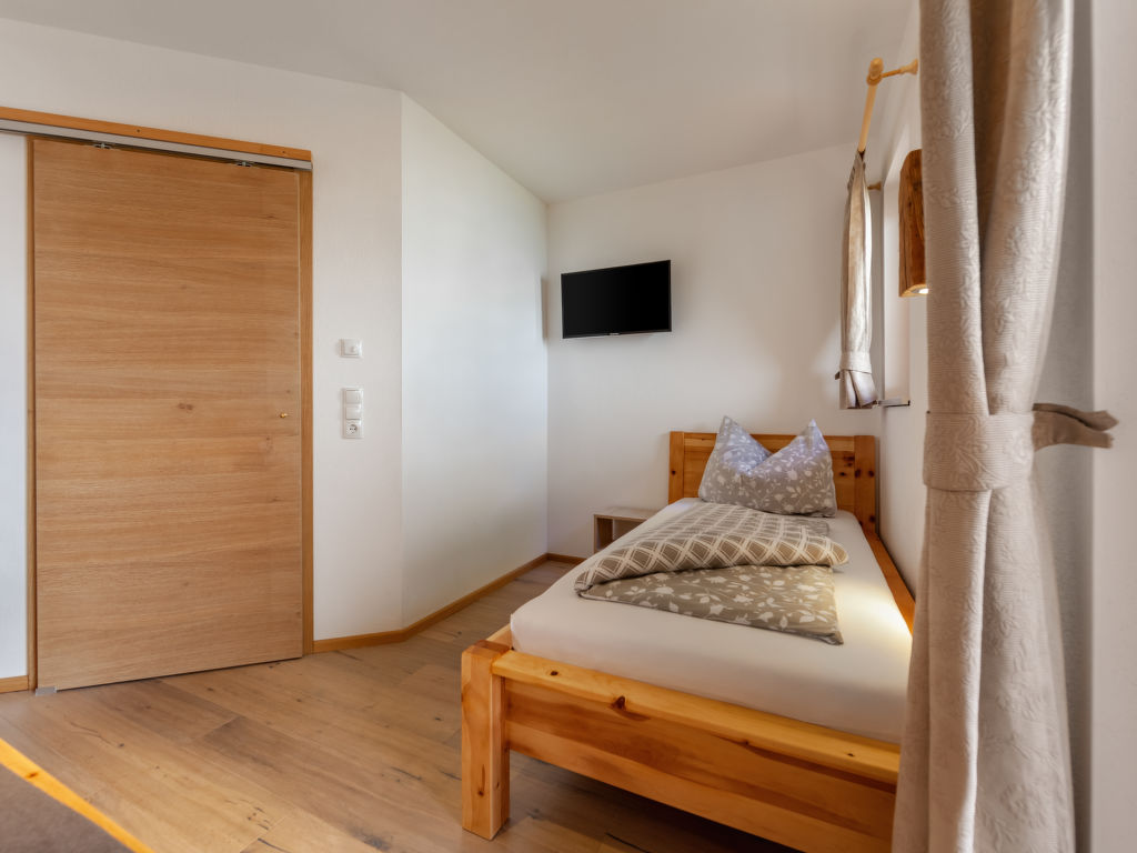 2-Zimmer-Wohnung, 2. Etage, ca. 45 m². Wohn-/Schlafraum mit Bettcouch, Essplatz, offene Küche (4 Ceranfelder, Backofen, Mikrowelle, Geschirrspüler, Kühl-/Gefrierkombination, Kaffeemaschine, Wasserkocher, Toaster), Terrassenausgang. Schlafzimmer mit Doppelbett, Einzelbett und Terrassenausgang. Dusche/WC. Bei Belegung mit weniger Personen als der maximalen Personenzahl stehen nicht alle Wohneinheiten zur Verfügung.